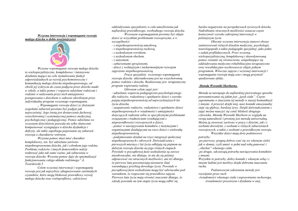 Wczesna interwencja i wspomaganie rozwoju małego dziecka w dobie teraźniejszości. Wczesne wspomaganie rozwoju małego dziecka to wielospecjalistyczne, kompleksowe i intensywne działania mające na celu stymulowanie funkcji odpowiedzialnych za rozwój psychomotoryczny i komunikację małego dziecka niepełnosprawnego, od chwili jej wykrycia do czasu podjęcia przez dziecko nauki w szkole, a takŜe pomoc i wsparcie udzielane rodzicom i rodzinie w nabywaniu przez nich umiejętności postępowania z dzieckiem w zakresie określonym przez indywidualny program wczesnego wspomagania. „ Wspomaganie rozwoju dzieci ze złoŜonymi zespołami zaburzeń powinno być podjęte jak najwcześniej. Jego istotą jest dostarczenie fachowej, wszechstronnej i systematycznej pomocy medycznej, psychologicznej i pedagogicznej. Pomoc udzielana we wczesnym dzieciństwie pozwala nie tylko skutecznie kompensować występujące u dziecka dysfunkcje i deficyty, ale takŜe zapobiega pojawianiu się zaburzeń rozwoju o charakterze wtórnym. Wczesna pomoc musi mieć charakter kompleksowy, tzn. być udzielana zarówno niepełnosprawnemu dziecku, jak i członkom jego rodziny. Problemy rodziców i innych domowników naleŜy traktować jako tak samo waŜne, jak zaburzenia w rozwoju dziecka. Wczesna pomoc dąŜy do optymalizacji funkcjonowania całego układu rodzinnego” A. Twardowski.5 Celem wczesnej interwencji i wspomagania rozwoju jest jak najszybsze zdiagnozowanie zaistniałych czynników, które mogą blokować prawidłowy rozwój małego dziecka oraz wieloprofilowe, całościowe oddziaływanie specjalistów w celu umoŜliwienia jak najbardziej prawidłowego, swobodnego rozwoju dziecka. Wczesnym wspomaganiem powinny być objęte dzieci ze wszystkimi problemami rozwojowymi, a w szczególności: - z niepełnosprawnością umysłową, - z niepełnosprawnością ruchową, - z uszkodzonym wzrokiem, - z uszkodzonym słuchem, - z autyzmem, - zaburzeniami sprzęŜonymi, - dzieci z wolniejszym i nieharmonijnym rozwojem zagroŜone niepełnosprawnością. Praca specjalisty wczesnego wspomagania rozwoju dziecka ukierunkowana jest na wszechstronną pomoc rodzinie i dziecku. Realizowany jest terapeutyczny program wspierania rodziny. Głównym celem zajęć jest: - udzielanie wsparcia pedagogiczno-psychologicznego dla rodziców, rodzeństwa i opiekunów dzieci z szeroko pojętą niepełnosprawnością od najwcześniejszych lat Ŝycia dziecka, - zaopatrzenie rodziców, rodzeństwo i opiekunów dzieci niepełnosprawnych w wiadomości i umiejętności dotyczących radzenia sobie ze specyficznymi problemami związanymi z trudnościami wynikającymi z nieprawidłowości rozwojowych u dzieci, - pomoc w nawiązywaniu kontaktów z instytucjami i organizacjami działającymi na rzecz dzieci z wieloraką niepełnosprawnością, - podejmowanie działań na rzecz integracji społecznej niepełnosprawnych i zdrowych .Doświadczenia z pierwszych miesięcy i lat Ŝycia odbijają się piętnem na dalszym rozwoju dziecka na jego róŜnych etapach. Powstałe w początkowej fazie uszkodzenia są zawsze nieodwracalne, nie dlatego, Ŝe nie da się później odpracować raz utraconych moŜliwości, ani teŜ dlatego, Ŝe pierwsze lata pozostawiają niezatarty ślad, warunkujący przebieg dorosłego Ŝycia. Powstałe w początkowej fazie uszkodzenia mogą być odwracalne pod warunkiem, Ŝe rozpocznie się prawidłowe zajęcia. Pierwsze lata Ŝycia mają równieŜ znaczenie dlatego, Ŝe szkody powstałe na tym etapie Ŝycia mogą odbić się bardzo negatywnie na perspektywach Ŝyciowych dziecka. Nadrabianie straconych moŜliwości oznacza często konieczność szeroko zakrojonej interwencji w późniejszym Ŝyciu Obecnie wczesna interwencja stanowi obszar zainteresowań róŜnych dziedzin medycyny, psychologii, neurologopedii a takŜe pedagogiki specjalnej- jako jedno z zadań profilaktycznych. Przez wczesną, wielospecjalistyczną, kompleksową i skoordynowaną pomoc rozumie się równoczesne, uzupełniające się oddziaływania medyczno-rehabilitacyjno-terapeutyczne oraz rewalidacyjno-wychowawcze objęte jednym programem. Wówczas zajęcia z wczesnej interwencji i wspomagania rozwoju mają sens i mogą przynieść spodziewane efekty. Metoda Weroniki Sherborne. Metoda ta nawiązuje do najbardziej pierwotnego sposobu porozumiewania się jakim jest „język ciała”. Często zapominamy o znaczeniu tej metody w naszej komunikacji z innymi. A przecieŜ dzięki niej, nasz kontakt emocjonalny staje się głębszy, bardziej Ŝywy. Dzięki doświadczeniom z zajęć moŜna nauczyć się cenić bliskość drugiego człowieka. Metoda Weroniki Sherborn ze względu na swoją naturalność i prostotę jest metodą uniwersalną. MoŜna ją stosować zarówno w pracy z dziećmi, jak i z osobami dorosłymi, z osobami o róŜnych zaburzeniach rozwojowych, a takŜe z osobami o prawidłowym rozwoju. Wszystkie dzieci mają dwie podstawowe potrzeby: -po pierwsze, pragną dobrze czuć się we własnym ciele( jak w domu), czyli umieć w pełni nad sobą panować i „słuchać” własnego ciała. -po drugie, odczuwają potrzebę nawiązywania kontaktów z innymi. Wszystkie te potrzeby, dobry kontakt z własnym sobą i z innymi ludźmi jest moŜliwy dzięki dobremu nauczaniu ruchu. Podstawowym załoŜeniem metody jest rozwijanie przez ruch: -świadomości własnego ciała i usprawniania ruchowego, -świadomości przestrzeni i działania w niej, -dzielenia przestrzeni z innymi ludźmi i nawiązywanie z nimi bliskiego kontaktu. Zasadą pierwszą ogólną w ćwiczeniach W. Sherborne jest dobrowolność uczestnictwa. - Prowadzący nawiązuje kontakt z kaŜdym dzieckiem - Prowadzący bierze udział w kaŜdym ćwiczeniu - Oszczędność ruchów ( mówić ciałem) - Nie ma rywalizacji i współzawodnictwa - KaŜdy moŜe osiągnąć sukces Ruch Rozwijający moŜe pomóc dzieciom w dwóch głównych sferach rozwojowych: - w rozwoju fizycznym - w rozwoju osobowości Dzieci mają sa