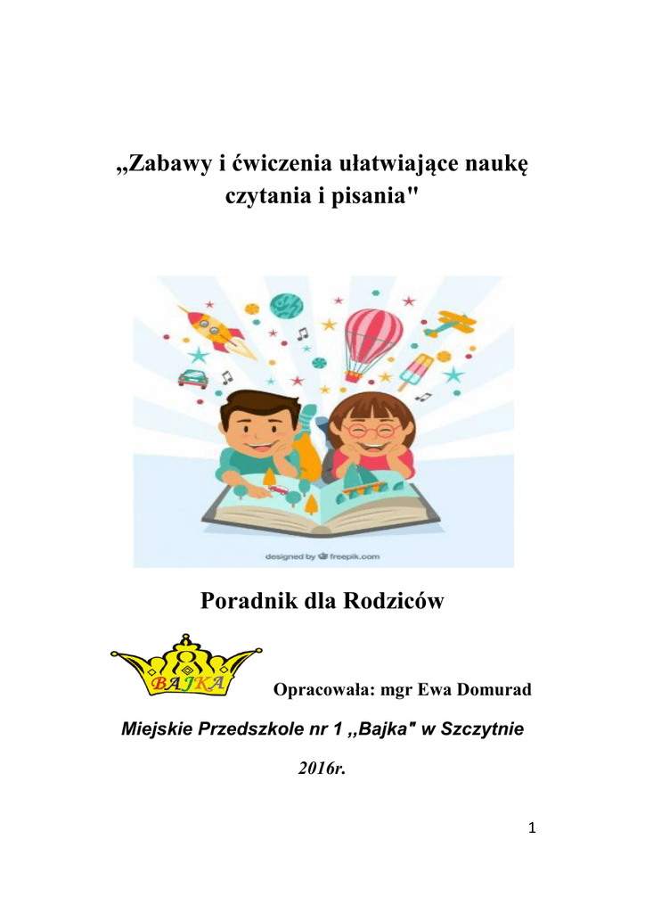 ,,Zabawy i ćwiczenia ułatwiające naukę czytania i pisania" Poradnik dla Rodziców Opracowała: mgr Ewa Domurad Miejskie Przedszkole nr 1 ,,Bajka" w Szczytnie 2016r. 1 Zainteresowanie u dzieci słowem pisanym pojawia się w różnych okresach wieku przedszkolnego. Już, 3- letnie dzieci patrząc w książeczkę same ,,czytają" ulubioną bajkę, bardzo dokładnie przywołując jej treść z pamięci. 4-latki natomiast, często pytają: Jak się to pisze? bądź proszą nas: ,,napisz dla Oli". Próbują także, pisać znaki literopodobne, oraz bardzo dobrze potrafią odwzorować napisane wyrazy i np. podpisują swoim imieniem pracę plastyczną. Dziecko zauważa również, że tekst pisany nie występuje tylko w książkach. Spostrzega, różnego rodzaju napisy w swoim otoczeniu, np. szyldy sklepów, urzędów i zaczyna orientować się w swoim otoczeniu. Dlatego też, to od nas dorosłych zależy w jaki sposób rozwiniemy zainteresowania podopiecznych, by nie hamować zaobserwowanych umiejętności w procesie nauki czytania i pisania. Wykorzystujmy każdą chwilę, by poprzez zabawę ułatwić dziecku wejście w świat czytania i pisania. 2 Rozwijamy percepcję słuchową dziecka Percepcja słuchowa to zdolność do odbioru dźwięków ich rozpoznawania, różnicowania oraz interpretowania przez odniesienie do poprzednich doświadczeń. Przykłady ćwiczeń: Wystukiwanie rytmu - najpierw rodzic, np. dwa uderzenia o stół, dwa klaśnięcia, trze tupnięcia. Rytm powinien być dostosowany do możliwości dziecka. Zaczynamy od prostych rytmów i zwiększamy stopień trudności. Powtarzanie słówek- na początek dwa, trzy wyrazy, potem coraz więcej, np. kot, stół, mleko.. Co słyszę?- rodzic chowa się i prezentuje jakiś dźwięk (z otoczenia dziecka, np. szczekanie psa), zadaniem dziecka jest odgadnąć jaki to dźwięk. 3 Dzielenie zdań na wyrazy i wyrazów na sylaby. (przeliczanie ilości sylab w wyrazie porównywanie gdzie jest więcej). Dokończ słowo - podajemy dziecku pierwszą sylabę, a ono kończy wyraz drugą, bądź odwrotnie (można tu wykorzystać obrazki). Co słyszysz na początku wyrazu?wyodrębnianie pierwszej głoski, np. Ula, Ania, Ewa. Najpierw wyróżnienie samogłosek, następnie spółgłosek. Różnicowanie wyrazów podobnie brzmiących, np. półka- bułka, kosa-koza Wyszukiwanie wyrazów na określoną głoskę, np. wyszukujemy wyrazy rozpoczynające się głoską a itp. Łączenie głosek w wyrazy, np. Jaki to wyraz kiedy mówię: oko, tata? Co ukryło się w tym słowie?- np. ser-ce, grabie (rodzic wypowiada te wyrazy, a zadaniem dziecka jest „znalezienie” innego słowa w wypowiadanym). Rymowanki, wyliczanki- uzupełnianie słów w znanych rymowankach, np. lata osa koło..... lata bąk koło.... śnieżek prószy marzną.....itp. Wspólna nauka wierszyków, piosenek i prezentowanie ich innym członkom rodziny. Zagadki: zaczyna się na „k” i miauczy (kot); na „d” i jest mokry (deszcz) itp. 4 Rozwijamy percepcję wzrokową dziecka ,,Percepcja wzrokowa - jest zdolnością do rozpoznawania i rozróżniania bodźców wzrokowych, a także do ich interpretowania przez odniesienie do poprzednich doświadczeń” Odpowiedni (właściwy dla danego wieku) poziom percepcji wzrokowej umożliwia poprawne przeprowadzanie takich czynności, jak czytanie, pisanie, układanie (puzzli, klocków), reprodukowanie figur, kształtów, wykonywanie zadań matematycznych (np. geometrycznych). Przykłady ćwiczeń: Układanie puzzli – najpierw z dużych puzzli, potem z coraz mniejszych (stopniowo zwiększamy również liczbę elementów). Przerysowanie prostych figur i kształtów (koło, trójkąt) – najpierw w oparciu o prezentowany wzór, potem z pamięci – prezentujemy wzór przez 5 kilka sekund potem chowamy go i dziecko rysuje z pamięci (ćwiczenie to rozwija również pamięć wzrokową bezpośrednią). Opisywanie obrazków – tego, co się na nich dzieje, kto jest na obrazku, co robią osoby na danym obrazku (obrazki z książek, dziecięcych gazet). Gra w domino (obrazkowe, literowe Uzupełnianie braków na obrazkach - można w tym celu wykorzystać gotowe obrazki dostępne w Internecie, na których brakuje pewnych części – zadaniem dziecka jest rozpoznanie i nazwanie brakujących części/przedmiotów (np. brak nosa w rysunku twarzy). Układanie z pamięci (układamy wzór, prezentujemy go dziecku przez pewien czas, np. 20 sekund i prosimy, aby uważnie się przyjrzało i postarało zapamiętać. Następnie składamy wzór, a dziecko odtwarza go z pamięci (wykorzystując do tego figury ze swojego kompletu). Składanie pociętych obrazków, np. wg wzoru (np. przecięte na kilka części dwie identyczne kartki pocztowe – rodzic układa swoją jako wzór, a następnie to samo robi dziecko) lub bez wzoru (można tu wykorzystać różne obrazki, pocztówki, zdjęcia – pocięte na kawałki) Dobieranie wyrazów do obrazków – rodzic przygotowuje kilka obrazków, na których są np. 6 w sprzęty domowe, zwierzęta, zawody (ważne aby na obrazku był jeden element) a następnie podpisy (nazwy tych przedmiotów). Zadaniem dziecka jest właściwe przyporządkowanie nazwy do obrazka. Spośród różnych obrazków dziecko wybiera te, których nazwa rozpoczyna się na tę samą głoskę (np. koń, kot, kura, koło, książka, itp.) Irena Majchrzak- Wprowadzenie dziecka świat pisma- Rozumienie słowa powinno wyprzedzać umiejętność jego odczytania: „bo to nie litery się czyta, tylko sens”, a dziecko od samego początku wchodzi w świat pisma, jako w świat znaczeń, a nie izolowanych liter. Autorka uważa, że w pierwszej kolejności należy pokazać dziecku w jaki sposób zapisuje się jego imię. 7 Wizytówka z imieniem wprowadza dziecko w świat znaczeń. Wybierając imię dziecka jako pierwszy wyraz do poznania, mamy na uwadze to, że dziecko jest bardzo związane uczuciowo ze swoim imieniem. Słyszy je bardzo często i wie, że ono oznacz