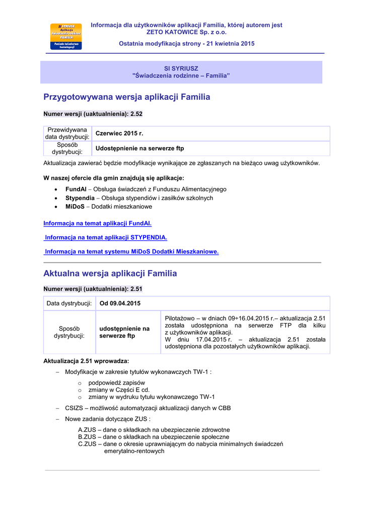 Informacja dla użytkowników aplikacji Familia, której autorem jest ZETO KATOWICE Sp. z o.o. Ostatnia modyfikacja strony - 21 kwietnia 2015 SI SYRIUSZ "Świadczenia rodzinne – Familia” Przygotowywana wersja aplikacji Familia Numer wersji (uaktualnienia): 2.52 Przewidywana data dystrybucji: Sposób dystrybucji: Czerwiec 2015 r. Udostępnienie na serwerze ftp Aktualizacja zawierać będzie modyfikacje wynikające ze zgłaszanych na bieżąco uwag użytkowników. W naszej ofercie dla gmin znajdują się aplikacje: FundAl Obsługa świadczeń z Funduszu Alimentacyjnego Stypendia Obsługa stypendiów i zasiłków szkolnych MiDoS Dodatki mieszkaniowe Informacja na temat aplikacji FundAl. Informacja na temat aplikacji STYPENDIA. Informacja na temat systemu MiDoS Dodatki Mieszkaniowe. Aktualna wersja aplikacji Familia Numer wersji (uaktualnienia): 2.51 Data dystrybucji: Sposób dystrybucji: Od 09.04.2015 udostępnienie na serwerze ftp Pilotażowo – w dniach 09÷16.04.2015 r.– aktualizacja 2.51 została udostępniona na serwerze FTP dla kilku z użytkowników aplikacji. W dniu 17.04.2015 r. – aktualizacja 2.51 została udostępniona dla pozostałych użytkowników aplikacji. Aktualizacja 2.51 wprowadza: Modyfikacje w zakresie tytułów wykonawczych TW-1 : o o o podpowiedź zapisów zmiany w Części E cd. zmiany w wydruku tytułu wykonawczego TW-1 CSIZS – możliwość automatyzacji aktualizacji danych w CBB Nowe zadania dotyczące ZUS : A.ZUS – dane o składkach na ubezpieczenie zdrowotne B.ZUS – dane o składkach na ubezpieczenie społeczne C.ZUS – dane o okresie uprawniającym do nabycia minimalnych świadczeń emerytalno-rentowych Informacja dla użytkowników aplikacji Familia, której autorem jest ZETO KATOWICE Sp. z o.o. Ostatnia modyfikacja strony - 21 kwietnia 2015 Poprzednie wersje aplikacji Familia Numer wersji (uaktualnienia): 2.50 Data dystrybucji: Sposób dystrybucji: Od 09.01.2015 r. udostępnienie na serwerze ftp Pilotażowo – w dniu 09.01.2015 r. – aktualizacja 2.50 została udostępniona na serwerze FTP dla kilku z użytkowników aplikacji. W dniu 13.01.2015 r. – aktualizacja 2.50 została udostępniona dla pozostałych użytkowników aplikacji. Aktualizacja 2.50 wprowadza: Tytuły wykonawcze TW-1 o Dodatkowe informacje w danych identyfikacyjnych tytułu wykonawczego o Zmiany w Części E cd. o Zmiany w wydruku tytułu wykonawczego TW-1 Nowe kwalifikacje prawne dla decyzji wznawiających po upływie okresu obowiązywania Nowe uprawnienia do zadań (CSIZS) Wniosek o SZO – sytuacja podopiecznego Numer wersji (uaktualnienia): 2.49 Data dystrybucji: Sposób dystrybucji: Od 17.11.2014 r. udostępnienie na serwerze ftp Pilotażowo – w dniach 17.11.2014 r. oraz 18.11.2014 r. – aktualizacja 2.49 została udostępniona na serwerze FTP dla kilku z użytkowników aplikacji. W dniu 19.11.2014 r. – aktualizacja 2.49 została udostępniona dla pozostałych użytkowników aplikacji. Aktualizacja 2.49 wprowadza: nową funkcjonalność w oknie „AlEw61001 Wydruk pism”. Na zakładce Dane można odnotować datę oraz opis złożonego zażalenia lub sprzeciwu do wskazanego pisma. nowe wzory tytułów wykonawczych TW-1 na podstawie Rozporządzenia Ministra Finansów z dnia 16 maja 2014 r. Numer wersji (uaktualnienia): 2.48 Data dystrybucji: Sposób dystrybucji: Od 19.09.2014 r. udostępnienie na serwerze ftp Pilotażowo – w dniach 19.09.2014 r. oraz 22.09.2014 r. – aktualizacja 2.48 została udostępniona na serwerze FTP dla kilku z użytkowników aplikacji. W dniu 06.10.2014 r. – aktualizacja 2.48 została udostępniona dla pozostałych użytkowników aplikacji. Informacja dla użytkowników aplikacji Familia, której autorem jest ZETO KATOWICE Sp. z o.o. Ostatnia modyfikacja strony - 21 kwietnia 2015 Aktualizacja 2.48 wprowadza: nowe kwalifikacje prawne dla zasiłku dla opiekuna (ZO) zmiany w wyświetlaniu danych dotyczących wiersza 1 w Części C sprawozdania nowy przycisk EMP w oknie startowym aplikacji, który uruchamia moduł komunikacyjny w przeglądarce nowa wersja modułu EMP EMP – test usług Numer wersji (uaktualnienia): aktualizacja 2.47 Data dystrybucji: Sposób dystrybucji: Od 04.08.2014 r. udostępnienie na serwerze ftp Pilotażowo – w dniach 04.08.2014 r. oraz 05.08.2014 r. – aktualizacja 2.47 została udostępniona na serwerze FTP dla kilku z użytkowników aplikacji. W dniu 06.08.2014 r. – aktualizacja 2.47 została udostępniona dla pozostałych użytkowników aplikacji. Aktualizacja 2.47 wprowadza w aplikacji Familia możliwość rejestracji wniosków na nowy okres zasiłkowy 2014/2015. Numer wersji (uaktualnienia): aktualizacja 2.46 Data dystrybucji: Sposób dystrybucji: Od 24.06.2014 r. udostępnienie na serwerze ftp Pilotażowo – w dniu 24.06.2014 r. – aktualizacja 2.46 została udostępniona na serwerze FTP dla kilku z użytkowników aplikacji. W dniu 26.06.2014 r. – aktualizacja 2.46 została udostępniona dla pozostałych użytkowników aplikacji. Aktualizacja 2.46 wprowadza: nowe wzorce dotyczące decyzji o składkach dla świadczeń ZO zmiany w ustalaniu decyzji do wniosku WZO nowe słowo kluczowe OKRESY_OZO zmiany w słowie kluczowym WYROWNANIA nowe kwalifikacje prawne dla decyzji z kont dla ZO nową wersję funkcji generującej zbiór, która wyklucza zasiłki dla opiekunów z danych przekazywanych do zbiorów centralnych Informacja dla użytkowników aplikacji Familia, której autorem jest ZETO KATOWICE Sp. z o.o. Ostatnia modyfikacja strony - 21 kwietnia 2015 Numer wersji (uaktualnienia): aktualizacja 2.45 Data dystrybucji: Sposób dystrybucji: Od 26.05.2014 r. udostępnienie na serwerze ftp Pilotażowo – w dniu 23.05.2014 r. – aktualizacja 2.45 została udostępniona na serwerze FTP dla kilku z użytkowników aplikacji. W dniu 26.05.2014 r. – aktualizacja 2.45 została udostępniona dla pozostałych użytkowników aplikacji. Aktualizacja 2.45 wprowadza: Nowy rodzaj wniosku WZO – na cały okres Szczegó
