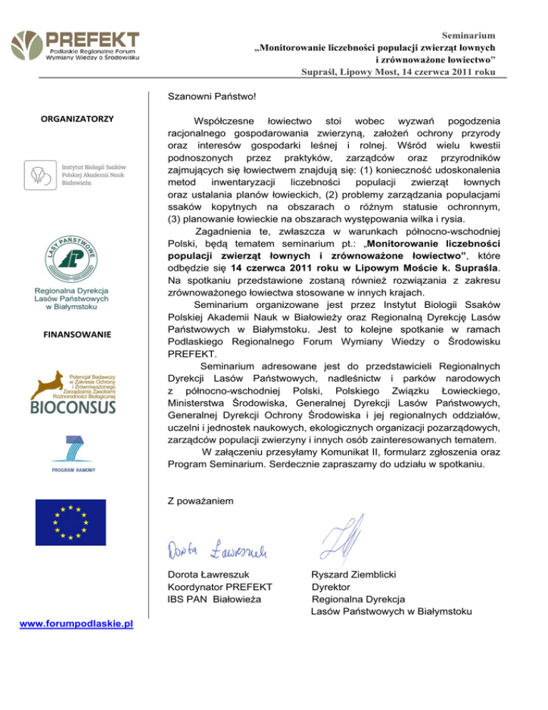 Seminarium „Monitorowanie liczebności populacji zwierząt łownych i zrównoważone łowiectwo” Supraśl, Lipowy Most, 14 czerwca 2011 roku Szanowni Państwo! ORGANIZATORZY FINANSOWANIE Współczesne łowiectwo stoi wobec wyzwań pogodzenia racjonalnego gospodarowania zwierzyną, założeń ochrony przyrody oraz interesów gospodarki leśnej i rolnej. Wśród wielu kwestii podnoszonych przez praktyków, zarządców oraz przyrodników zajmujących się łowiectwem znajdują się: (1) konieczność udoskonalenia metod inwentaryzacji liczebności populacji zwierząt łownych oraz ustalania planów łowieckich, (2) problemy zarządzania populacjami ssaków kopytnych na obszarach o różnym statusie ochronnym, (3) planowanie łowieckie na obszarach występowania wilka i rysia. Zagadnienia te, zwłaszcza w warunkach północno-wschodniej Polski, będą tematem seminarium pt.: „Monitorowanie liczebności populacji zwierząt łownych i zrównoważone łowiectwo”, które odbędzie się 14 czerwca 2011 roku w Lipowym Moście k. Supraśla. Na spotkaniu przedstawione zostaną również rozwiązania z zakresu zrównoważonego łowiectwa stosowane w innych krajach. Seminarium organizowane jest przez Instytut Biologii Ssaków Polskiej Akademii Nauk w Białowieży oraz Regionalną Dyrekcję Lasów Państwowych w Białymstoku. Jest to kolejne spotkanie w ramach Podlaskiego Regionalnego Forum Wymiany Wiedzy o Środowisku PREFEKT. Seminarium adresowane jest do przedstawicieli Regionalnych Dyrekcji Lasów Państwowych, nadleśnictw i parków narodowych z północno-wschodniej Polski, Polskiego Związku Łowieckiego, Ministerstwa Środowiska, Generalnej Dyrekcji Lasów Państwowych, Generalnej Dyrekcji Ochrony Środowiska i jej regionalnych oddziałów, uczelni i jednostek naukowych, ekologicznych organizacji pozarządowych, zarządców populacji zwierzyny i innych osób zainteresowanych tematem. W załączeniu przesyłamy Komunikat II, formularz zgłoszenia oraz Program Seminarium. Serdecznie zapraszamy do udziału w spotkaniu. Z poważaniem Dorota Ławreszuk Koordynator PREFEKT IBS PAN Białowieża www.forumpodlaskie.pl Ryszard Ziemblicki Dyrektor Regionalna Dyrekcja Lasów Państwowych w Białymstoku Seminarium „Monitorowanie liczebności populacji zwierząt łownych i zrównoważone łowiectwo” Supraśl, Lipowy Most, 14 czerwca 2011 roku KOMUNIKAT II Seminarium: Monitorowanie liczebności populacji zwierząt łownych i zrównoważone łowiectwo Organizatorzy: Instytut Biologii Ssaków PAN w Białowieży, Regionalna Dyrekcja Lasów Państwowych w Białymstoku. Termin: 14 czerwca 2011 roku (w godzinach 09:00 – 18:00) Miejsce: Hotel Golf Park Lipowy Most, dostępna na stronie www.lipowymost.pl) Borki 29, Supraśl, sala konferencyjna (mapa dojazdu Cele: Przegląd wiedzy, wymiana doświadczeń, prezentacja dobrych praktyk oraz zidentyfikowanie problemów dotyczących łowiectwa w regionie północno-wschodniej Polski, w zakresie przede wszystkim gospodarowania populacjami ssaków kopytnych. Dyskusja oraz próba wypracowania nowych propozycji. Uczestnicy: Dyrekcja Generalna Lasów Państwowych, Regionalne Dyrekcje Lasów Państwowych, nadleśnictwa i parki narodowe północno-wschodniej Polski, zarząd i regionalne oddziały Polskiego Związku Łowieckiego, Generalna Dyrekcja Ochrony Środowiska i jej regionalne oddziały, instytucje naukowe i uczelnie, studenci, ekologiczne organizacje pozarządowe, administracja lokalna i regionalna, inne zainteresowane podmioty. Zgłoszenia udziału w konferencji prosimy nadsyłać w terminie do 06.06.2011 roku. W kwestiach organizacyjnych (dojazd, zakwaterowanie) prosimy kontaktować się z panią Agnieszką Maciejewską 085-6827781 [email protected] Koszty: Udział w seminarium jest nieodpłatny. Organizatorzy zapewniają materiały konferencyjne, przerwy kawowe i lunch. Formularz zgłoszenia: W załączeniu. Program seminarium: W załączeniu. Seminarium „Monitorowanie liczebności populacji zwierząt łownych i zrównoważone łowiectwo” Supraśl, Lipowy Most, 14 czerwca 2011 roku ZGŁOSZENIE UCZESTNICTWA Imię i nazwisko: Instytucja: Adres: Telefon: e-mail: Zgłoszenie prosimy wysłać do: Agnieszka Maciejewska Instytut Biologii Ssaków PAN Ul. Waszkiewicza 1 17-230 Białowieża [email protected] tel. 085-682 77 81 fax: 085-682 77 52 UWAGA! Zgłoszenie uczestnictwa w seminarium prosimy przesłać do 06.06.2011 r. Zgłoszenia uczestnictwa mogą być przesyłane pocztą, drogą elektroniczną lub faxem SERDECZNIE ZAPRASZAMY!