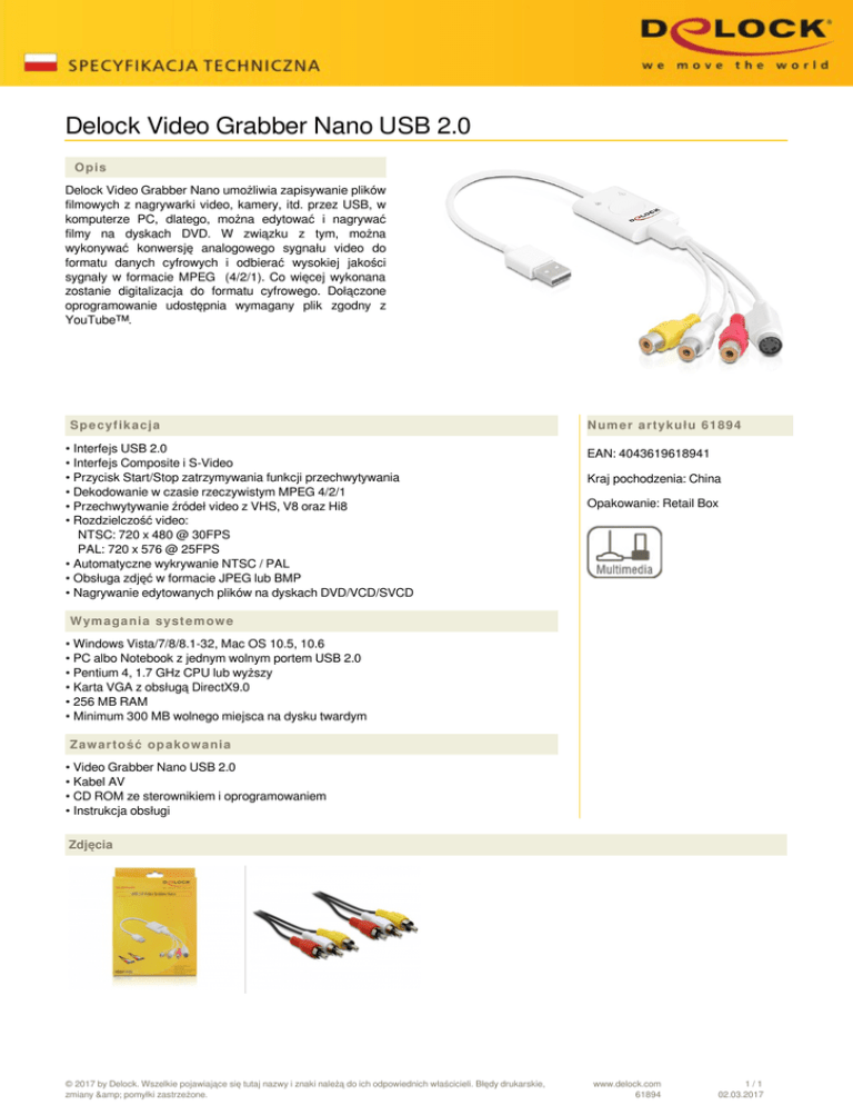 Delock Video Grabber Nano USB 2.0 Opis Delock Video Grabber Nano umożliwia zapisywanie plików filmowych z nagrywarki video, kamery, itd. przez USB, w komputerze PC, dlatego, można edytować i nagrywać filmy na dyskach DVD. W związku z tym, można wykonywać konwersję analogowego sygnału video do formatu danych cyfrowych i odbierać wysokiej jakości sygnały w formacie MPEG (4/2/1). Co więcej wykonana zostanie digitalizacja do formatu cyfrowego. Dołączone oprogramowanie udostępnia wymagany plik zgodny z YouTube™. Specyfikacja • Interfejs USB 2.0 • Interfejs Composite i S-Video • Przycisk Start/Stop zatrzymywania funkcji przechwytywania • Dekodowanie w czasie rzeczywistym MPEG 4/2/1 • Przechwytywanie źródeł video z VHS, V8 oraz Hi8 • Rozdzielczość video: NTSC: 720 x 480 @ 30FPS PAL: 720 x 576 @ 25FPS • Automatyczne wykrywanie NTSC / PAL • Obsługa zdjęć w formacie JPEG lub BMP • Nagrywanie edytowanych plików na dyskach DVD/VCD/SVCD Numer artykułu 61894 EAN: 4043619618941 Kraj pochodzenia: China Opakowanie: Retail Box Wymagania systemowe • Windows Vista/7/8/8.1-32, Mac OS 10.5, 10.6 • PC albo Notebook z jednym wolnym portem USB 2.0 • Pentium 4, 1.7 GHz CPU lub wyższy • Karta VGA z obsługą DirectX9.0 • 256 MB RAM • Minimum 300 MB wolnego miejsca na dysku twardym Zawartość opakowania • Video Grabber Nano USB 2.0 • Kabel AV • CD ROM ze sterownikiem i oprogramowaniem • Instrukcja obsługi Zdjęcia © 2017 by Delock. Wszelkie pojawiające się tutaj nazwy i znaki należą do ich odpowiednich właścicieli. Błędy drukarskie, zmiany & pomyłki zastrzeżone. Powered by TCPDF (www.tcpdf.org) www.delock.com 61894 1/1 02.03.2017
