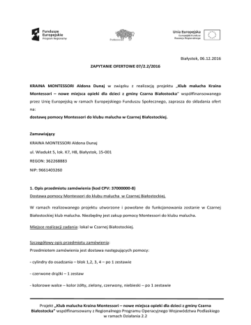 Białystok, 06.12.2016 ZAPYTANIE OFERTOWE 07/2.2/2016 KRAINA MONTESSORI Aldona Dunaj w związku z realizacją projektu „Klub malucha Kraina Montessori – nowe miejsca opieki dla dzieci z gminy Czarna Białostocka” współfinansowanego przez Unię Europejską w ramach Europejskiego Funduszu Społecznego, zaprasza do składania ofert na: dostawę pomocy Montessori do klubu malucha w Czarnej Białostockiej. Zamawiający KRAINA MONTESSORI Aldona Dunaj ul. Wiadukt 5, lok. K7, H8, Białystok, 15-001 REGON: 362268883 NIP: 9661403260 1. Opis przedmiotu zamówienia (kod CPV: 37000000-8) Dostawa pomocy Montessori do klubu malucha w Czarnej Białostockiej. W ramach realizowanego projektu utworzone i powołane do funkcjonowania zostanie w Czarnej Białostockiej klub malucha. Niezbędny jest zakup pomocy Montessori do klubu malucha. Miejsce realizacji zadania: lokal w Czarnej Białostockiej. Szczegółowy opis przedmiotu zamówienia: Przedmiotem zamówienia jest dostawa następujących pomocy: - cylindry do osadzania – blok 1,2, 3, 4 – po 1 zestawie - czerwone drążki – 1 zestaw - kolorowe walce – kolor żółty, zielony, czerwony, niebieski – po 1 zestawie Projekt „Klub malucha Kraina Montessori – nowe miejsca opieki dla dzieci z gminy Czarna Białostocka” współfinansowany z Regionalnego Programu Operacyjnego Województwa Podlaskiego w ramach Działania 2.2 - różowa wieża – seria 10 sześcianów – po 1 zestawie - brązowe schody – seria 10 drewnianych prostopadłościanów – 1 zestaw - puszki szmerowe – zestaw 3 par puszek – 1 zestaw - butelki smakowe – zestaw 4 par butelek – 1 zestaw - butelki zapachowe – 1 zestaw - tabliczki baryczne – zestaw 3 drewnianych pudełek po 7 tabliczek – 1 zestaw - metalowe ramki – zestaw 10 metalowych ramek i figur – 1 zestaw - podstawki pod metalowe ramki – zestaw 2 podstaw do 10 ramek – 1 zestaw - tabliczki termiczne – 2 zestawy - komoda geometryczna – 1 szt. - taca do demonstracji kształtów geometrycznych – 6 szt., w każdej inne figury - kolorowe tabliczki – zestaw tabliczek w 9 kolorach, każdy kolor w 7 odcieniach – 1 zestaw - kółka do ćwiczenia koordynacji wzrokowo-ruchowej – zestaw kółek w 5 kolorach – 1 zestaw - zestaw obrączek – zestaw obrączek w 2 kolorach – 1 zestaw - zestaw kolorowych walców – zestaw walców w 5 kolorach i o stopniowanej wysokości – 1 zestaw - pudełko na wrzecionka z cyframi – 1 szt. - pudełko na wrzecionka – 1 szt. - wrzecionka – 45 szt. - puzzle, cyfry 1-9 – 1 zestaw - liczydła duże – 1 zestaw - układanka kolorowa – 3 zestawy - słupki kolorowe 1-10 – 1 zestaw - słupki kolorowe 1-10 numerowane – 1 zestaw Projekt „Klub malucha Kraina Montessori – nowe miejsca opieki dla dzieci z gminy Czarna Białostocka” współfinansowany z Regionalnego Programu Operacyjnego Województwa Podlaskiego w ramach Działania 2.2 - pierścienie kolorowe 1-5 – 1 zestaw - zegar z ruchomymi wskazówkami – 1 szt. - ramki – kwadratowa ramka z litego drewna o wymiarach 30 x 30 cm z przymocowaną tkaniną zapiętą na: guziki, kokardki, sznurek przewleczony przez metalowe oczka, haftki, agrafki, sprzączki, zamek błyskawiczny, sznurowadło, rzepy – 12 różnych ramek - stojak na ramki – wykonany z drewna – 1 szt. - dywaniki do pracy indywidualnej – 15 szt. Oferowana cena powinna zawierać koszt dostarczenia zamówienia do Zamawiającego. Nie istnieje możliwość składania ofert częściowych. Zamawiający wybierze jednego Wykonawcę. 2. Termin realizacji zamówienia Zamówienie ma zostać zrealizowane w terminie do 13.01.2016. Wybór oferenta zaplanowany jest na 15.12.2016. 3. Informacja o wyborze najkorzystniejszej oferty: Informacja o wyborze najkorzystniejszej oferty zostanie przekazana w formie pisemnej bądź mailowej. 4. Oferta powinna zawierać: a) proponowaną cenę brutto za dostawę poszczególnych elementów zlecenia b) oświadczenie o braku powiązań z Zamawiającym 5. Zamawiający może zamknąć postępowanie bez dokonania wyboru, jeżeli: - cena oferty będzie rażąco odbiegać od stawek rynkowych, - cena najkorzystniejszej oferty przewyższa kwotę, którą Zamawiający może przeznaczyć na sfinansowanie zamówienia, - nie złożono żadnej oferty. 6. Sposób przygotowania oferty: Projekt „Klub malucha Kraina Montessori – nowe miejsca opieki dla dzieci z gminy Czarna Białostocka” współfinansowany z Regionalnego Programu Operacyjnego Województwa Podlaskiego w ramach Działania 2.2 Oferta powinna zostać przygotowana w formie pisemnej na formularzu stanowiącym Załącznik nr 1 do Zapytania, podpisana czytelnie i dostarczona w formie papierowej bądź przesłana w formie skanu. 7. Miejsce i termin złożenia oferty: Ofertę należy złożyć w terminie od 06.12.2016 do 13.12.2016 do godz. 16.00: - osobiście w siedzibie Zamawiającego: ul. Wiadukt 5, lok. K7, H8, Białystok, 15-001, w godzinach 8.00-16.00 - przesłać drogą elektroniczną na adres: [email protected] - przesłać pocztą lub kurierem (decyduje data wpływu do siedziby Zamawiającego) na adres siedziby Zamawiającego. 8. Kryteria wyboru oferty: - 100 pkt. – cena Sposób przyznawania punktacji: 1) Kryterium: Cena – cena brutto (waga 100 pkt.) Oferty ocenione zostaną z zastosowaniem przelicznika: Pc = Cn/Co x 100pkt Gdzie: Pc – liczba otrzymanych punktów Cn – najniższa cena brutto spośród wszystkich złożonych ofert Co – cena brutto oferty ocenianej Zamawiający wybierze ofertę spełniającą podane kryteria, o najwyższej liczbie punktów. Zamawiający nie może udzielić zamówienia podmiotom powiązanym z nim kapitałowo lub osobowo. Przez powiązania kapitałowe lub osobowe rozumie się wzajemne powiązania między Zamawiającym lub osobami upoważnionymi do zaciągania zobowiązań w imieniu Zamawiającego lub osobami wykonującymi w imieniu Zamawiającego czynności związane z przygotowaniem i przeprowadzeniem procedury 