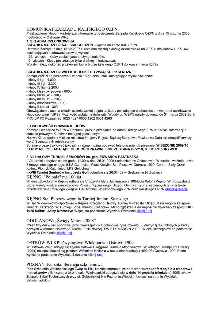 KOMUNIKAT ZARZĄDU KALISKIEGO OZPN. Przekazujemy klubom ważniejsze informacje z posiedzenia Zarządu Kaliskiego OZPN z dnia 15 grudnia 2008 r.odbytego w Ostrowie Wlkp. 1. SKŁADKA CZŁONKOWSKA. SKŁADKA NA RZECZ KALISKIEGO OZPN – wpłata na konto Kal. OZPN Uchwałą Zarządu z dnia 15.12.2007 r. ustalono roczną składkę członkowską na 2009 r. dla klubów i LKS -ów posiadających osobowość prawną wynosi - 25,- złotych – Kluby posiadające drużynę seniorów, - 5,- złotych - Kluby posiadające tylko drużyny młodzieżowe. Wpłaty należy dokonać przelewem lub w biurze kaliskiego OZPN do końca marca 2009 r SKŁADKA NA RZECZ WIELKOPOLSKIEGO ZWIĄZKU PIŁKI NOŻNEJ. Zarząd WZPN na posiedzeniu w dniu 16 grudnia ustalił następujące wysokości opłat: - kluby II ligi - 4.000,- kluby III ligi - 3.300,- kluby IV ligi - 2.200,- kluby klasy okręgowej - 800,- kluby klasy „A” - 500,- kluby klasy „B” - 350,- kluby młodzieżowe - 100,- kluby II kobiet - 300,Obowiązkiem płacenia składki członkowskiej objęte są kluby posiadające osobowość prawną oraz uczniowskie kluby sportowej (UKS). Możliwość wpłaty na dwie raty. Wpłaty do WZPN należy dokonać do 31 marca 2009 Bank PKO BP I/O Poznań 95 1020 4027 0000 1202 0031 4260 2. OSOBOWOŚĆ PRAWNA KLUBÓW Komisja Licencyjna WZPN w Poznaniu prosi o przesłanie na adres Okręgowego ZPN w Kaliszu informacji o statusie prawnym Klubów z następującymi danymi: Nazwa Klubu (pełna) Miejsce rejestracjiKrajowy Rejestr SądowyStarostwo Powiatowe Data rejestracji(Pierwszy wpis) SygnaturaNr rejestracyjny Sprawę proszę traktować jako pilną - dane można podawać telefonicznie lub pisemnie. W SEZONIE 2009/10 KLUBY NIE POSIADAJĄCE OSOBOŚCI PRAWNEJ NIE ZOSTANĄ PRZYJĘTE DO ROZGRYWEK. 3. VII HALOWY TURNIEJ SENIORÓW im. gen. EDWARDA PASTUSZKA - VII turniej odbędzie się od godz. 11.00 w dniu 25.01.2009 r.(niedziela) w Gołuchowie. W turnieju weźmie udział 8 drużyn naszego okręgu. (LKS Czarnylas, Piast Kobylin, Stal Pleszew, Ostrovia 1909, Centra, Biały Orzeł Koźm., Płomyk Koźminiec, LKS Gołuchów). - XVIII Turniej Seniorów im. Józefa Goli odbędzie się 26.07. 09 w Grębaninie (4 drużyny) KĘPNO: "Polonia" ma 100 lat W kinie „Sokolnia” w Kępnie odbyła się Uroczysta Gala Jubileuszowa 100-lecia Polonii Kępno. W uroczystości udział wzięły władze samorządowe Powiatu Kępińskiego, Urzędu Gminy z Kępna, ościennych gmin a także przedstawiciele Polskiego Związku Piłki Nożnej, Wielkopolskiego ZPN oraz Kaliskiego OZPN.obejrzyj relacje KĘPNO:Stal Pleszew wygrała Turniej Juniora Starszego W Hali Widowiskowo-Sportowej w Kępnie rozegrano Halowy Turniej Mistrzostw Okręgu Kaliskiego w kategorii Juniora Starszego. W Turnieju udział wzieło 6 zespołów. Mimo zgłoszenia do Kępna nie dojechały zespołu KKS 1925 Kalisz i Astry Krotoszyn Więcej na podstronie Wydziału Szkolenia kliknij tutaj ODOLANÓW: „Święty Marcin 2008” Przez trzy dni w sali sportowej przy Gimnazjum w Odolanowie rywalizowało 36 drużyn tj 360 młodych piłkarzy nożnych w ramach Halowego Turnieju Piłki Nożnej „ŚWIETY MARCIN 2009” .Wiecej szczegółów na podstronie Wydziału Szkolenia.kliknij tutaj OSTRÓW WLKP: Zwycięstwo Włókniarza i Ostrovii 1909 W Ostrowie Wlkp. odbyły się kojene Halowe Okręgowe Turnieje Młodzieżowe. W kategorii Trampkarz Starszy (1994) najlepsi okazali się piłkarze Włókniarz Kalisz a w kat.Junior Młodszy (1992-93) Ostrovia 1909. Pełne wyniki na podstronie Wydziału Szkolenia kliknij tutaj POZNAŃ: Kursokonferencja szkoleniowa Pion Szkolenia Wielkopolskiego Związku Piłki Nożnej informuje, że doroczna kursokonferencja dla trenerów i instruktorów piłki nożnej z terenu całej Wielkopolski odbędzie sie w dniu 14 grudnia (niedziela) 2008 roku w Zespole Szkół Technicznych przy ul. Golęcińskiej 9 w Poznaniu.Wiecej informacji na stronie Wydziału Szkolenia.kliknij REGION: Ostrovia i Orzeł Mroczeń za burtą PP Do największych niespodzianek III rundy Pucharu Polski zaliczyć można wyeliminowanie KP Ostrovii 1909 która przegrała z Czarnymi Dobrzyca 2 do 3. Kolejną noespodzianką jest odpadniecie z dalszych rozgrywek Orła Mroczeń, który przegrał w Siemanicach 3 do 5. Pełne wyniki na podstronie Pucharu Polski. kliknij REGION: Ruszył sezon halowy Pierwsi sezon halowy rozpoczęli najmłodsi piłkarze w kategorii „Orlik”. Halowe Eliminacyjne Turnieje Piłki Nożnej „Orlików” , stanowiące nieoficjalne Mistrzostwa Okręgu Kaliskiego w halowej piłce nożnej w kategorii "Orlik", rozegrano już w Łęce Mroczńskiej, Odolanowie, Koźminie Wlkp i Kaliszu. Więcej na podstronie Informacje Wydziału Szkolenia.kliknij REGION: Zestaw III Rundy Pucharu Polski na szczeblu Kaliskiego OZPN. III Runda Pucharu Polski na szczeblu Kaliskiego OZPN, rozegrana zostanie niedzielę 23 listopada Na postronie Pucharu Polski prezentowany jest pełen zestaw par.kliknij REGION: „Sport wszystkich dzieci” - konkurs ofert. Zapraszamy do zapoznania się z treścią pisma jakie do Biura Kaliskiego OZPN przesłał Adam Rogacki, Poseł na Sejm Rzeczpospolitej Polskiej. Przesłana informacja dotyczy otwartego konkursu ofert na realizację w 2009 roku zadań z zakresu upowszechniania kultury fizycznej dzieci i młodzieży w ramach programu „Sport Wszystkich Dzieci” – jaki ogłosiło Ministerstwo Sportu i Turystyki. ODOLANÓW: Turniej Orlików W dniu 29 listopada 2008 w Sali sportowej Gimnazjum w Odolanowie rozegrany został eliminacyjny Halowy Turniej Piłki Nożnej dla drużyn uczestniczących w rozgrywkach związkowych w kategorii ORLIK rocznik 1998 i młodszych. Turniej wygrał zespół KS ASTRA KROTOSZYN , która pokonała gospodarzy LZS TARCHALANKE Tarchały Wielkie oraz LKS Czarnylas po 2 do 0 oraz Barycz Janków Przygodzki 4 do 1. Zwycięstwo dało młodym piłkarzom Astry prawo gry w finale, który rozegrany zostanie w lutym przyszłego roku. Oprócz awansu , kapitan zespołu otr