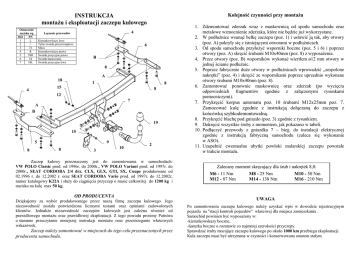 Kolejność czynności przy montaŜu INSTRUKCJA montaŜu i eksploatacji zaczepu kulowego Oznaczenie zacisku wg ISO PN 1 L 2 + 3 31 4 R 5 58R 6 54 7 58L 4 Łączenie przewodów Kierunkowskazy lewe Tylne światła przeciwmgłowe Masa Kierunkowskazy prawe Światła pozycyjne prawe Światła hamowania Światła pozycyjne lewe 6 B 8 A 18 1 8 15 4 8 12 7 A B 19 15 5 8 9 8 3 10 2 Zaczep kulowy przeznaczony jest do zamontowania w samochodach: VW POLO Classic prod. od 1996r. do 2000r., VW POLO Variant prod. od 1997r. do 2000r., SEAT CORDOBA 2/4 drz. CLX, GLX, GTI, SX, Coupe produkowane od 02.1996 r. do 12.2002 r. oraz SEAT CORDOBA Vario prod. od 1997r. do 12.2002r, numer katalogowy K22A i słuŜy do ciągnięcia przyczep o masie całkowitej do 1200 kg i nacisku na kulę max 50 kg. OD PRODUCENTA Dziękujemy za wybór produkowanego przez naszą firmę zaczepu kulowego. Jego niezawodność została potwierdzona licznymi testami oraz opiniami zadowolonych klientów. JednakŜe niezawodność zaczepów kulowych jest zaleŜna równieŜ od prawidłowego montaŜu oraz prawidłowej eksploatacji. Z tego powodu prosimy Państwa o staranne przeczytanie niniejszej instrukcji montaŜu oraz przestrzeganie właściwych wskazówek. Zaczep naleŜy zamontować w miejscach do tego celu przeznaczonych przez producenta samochodu. 1. Zdemontować zderzak wraz z maskownicą od spodu samochodu oraz metalowe wzmocnienie zderzaka, które nie będzie juŜ wykorzystane. 2. W podłuŜnice wsunąć belkę zaczepu (poz. 1) i ustawić ją tak, aby otwory (poz. A) pokryły się z istniejącymi otworami w podłuŜnicach. 3. Od spodu samochodu przyłoŜyć wsporniki boczne (poz. 5 i 6) i poprzez otwory (poz. A) skręcić śrubami M10x40mm (poz. 8) z wyposaŜenia. 4. Przez otwory (poz. B) wsporników wykonać wiertłem ø12 mm otwory w jednej ścianie podłuŜnic. 5. Poprzez fabrycznie duŜe otwory w podłuŜnicach wprowadzić „zespolone nakrętki” (poz. 4) i skręcić ze wspornikami poprzez uprzednio wykonane otwory śrubami M10x40mm (poz. 8). 6. Zamontować ponownie maskownicę oraz zderzak (po wycięciu odpowiednich fragmentów zgodnie z załączonymi rysunkami pomocniczymi). 7. Przykręcić korpus automatu poz. 10 śrubami M12x25mm poz. 7. Zamocować kulę zgodnie z instrukcją dołączaną do zaczepu z końcówką szybkodemontowalną. 8. Przykręcić blachę pod gniazdo (poz. 3) zgodnie z rysunkiem. 9. Dokręcić wszystkie śruby z momentem, jak pokazano w tabeli. 10. Podłączyć przewody z gniazdka 7 – bieg. do instalacji elektrycznej zgodnie z instrukcją fabryczną samochodu (zaleca się wykonanie w ASO). 11. Uzupełnić ewentualne ubytki powłoki malarskiej zaczepu powstałe w trakcie montaŜu. Zalecany moment skręcający dla śrub i nakrętek 8,8: M6 - 11 Nm M8 - 25 Nm M10 - 50 Nm M12 - 87 Nm M14 - 138 Nm M16 - 210 Nm UWAGA Po zamontowaniu zaczepu kulowego naleŜy uzyskać wpis w dowodzie rejestracyjnym pojazdu na "stacji kontroli pojazdów" właściwej dla miejsca zamieszkania . Samochód powinien być wyposaŜony w: -kierunkowskazy boczne, -lusterka boczne o rozstawie co najmniej szerokości przyczepy. Sprawdzać śruby mocujące zaczepu kulowego po około 1000 km przebiegu eksploatacji. Kula zaczepu musi być utrzymana w czystości i konserwowana smarem stałym. PPUH AUTO-HAK Sp.J. WyposaŜenie zaczepu: Produkcja Zaczepów Kulowych Henryk & Zbigniew Nejman 76-200 SŁUPSK ul. Słoneczna 16K tel/fax (059) 8-414-414; 8-414-413 e-mail: [email protected] www. autohak.com.pl Zaczep kulowy bez wyposaŜenia elektrycznego K22A KARTA GWARANCYJNA Producent udziela gwarancji niniejszą kartą gwarancyjną na okres 24 miesięcy licząc od dnia zakupu zaczepu kulowego do samochodu: VW POLO Classic produkowany od 1996r. do 2000r. VW POLO Variant produkowany od 1997r. do 2000r. SEAT CORDOBA 2/4 drz. CLX, GLX, GTI, SX, Coupe produkowane od 02.1996r. do 12.2002r. SEAT CORDOBA Vario produkowany od 1997r. do 12.2002r Data produkcji .............................. Data zakupu........................................... Zakres gwarancji obejmuje wyłącznie wady jakościowe wynikające z winy producenta. Gwarancja nie obejmuje natomiast uszkodzeń zawinionych przez nabywcę, wynikających z niewłaściwego montaŜu, uŜytkowania lub konserwacji, uszkodzeń mechanicznych, normalnego zuŜycia podczas eksploatacji itp. Gwarancja udzielona na zakupiony towar nie wyłącza, nie ogranicza ani nie zawiesza uprawnień kupującego wynikających z niezgodności towaru z umową. Reklamacje naleŜy zgłaszać w punkcie sprzedaŜy, składając jednocześnie kartę gwarancyjną. Usunięcie "wady" następuje po stwierdzeniu przez punkt sprzedaŜy wspólnie z producentem słuszności złoŜonej reklamacji. Reklamacja powinna być załatwiona w ciągu czternastu dni od dnia uznania reklamacji. Karta gwarancyjna jest niewaŜna jeŜeli nie jest wypełniona i podpisana. Data zgłoszenia reklamacji: ................................................................... Klasa: A50-X Nr kat. Przeznaczony do zamontowania w samochodzie: VW POLO Classic produkowany od 1996r. do 2000r. VW POLO Variant produkowany od 1997r. do 2000r. SEAT CORDOBA 2/4 drz. CLX, GLX, GTI, SX, Coupe produkowane od 02.1996r. do 12.2002r. SEAT CORDOBA Vario produkowany od 1997r. do 12.2002r Dane techniczne: Wartość siły D: 6,70 kN maksymalna masa przyczepy: 1200 kg maksymalny nacisk na kulę: 50 kg Numer homologacji zgodnie z dyrektywą 94/20/WE: e20*94/20*0407*00 INFORMACJA WSTĘPNA Zaczep kulowy jest skonstruowany zgodnie z zasadami bezpieczeństwa ruchu drogowego. Zaczep kulowy jest elementem wpływającym na bezpieczeństwo jazdy i moŜe zostać zainstalowany wyłącznie przez personel wyspecjalizowany. Niedopuszczalne jest dokonywanie jakichkolwiek zmian w konstrukcji zaczepu. Powoduje to wygaśniecie dopuszczenia do stosowania. W przypadku obecności masy izolacyjnej lub osłony podwozia w miejscu przylegania zaczepu, naleŜy ją usunąć. Nieosłonięte miejsca karoserii oraz wy