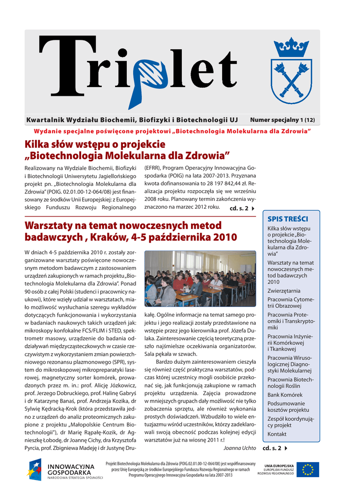 Kwartalnik Wydziału Biochemii, Biofizyki i Biotechnologii UJ Numer specjalny 1 (12) Wydanie specjalne poświęcone projektowi „Biotechnologia Molekularna dla Zdrowia” Kilka słów wstępu o projekcie „Biotechnologia Molekularna dla Zdrowia” Realizowany na Wydziale Biochemii, Biofizyki i Biotechnologii Uniwersytetu Jagiellońskiego projekt pn. „Biotechnologia Molekularna dla Zdrowia” (POIG. 02.01.00-12-064/08) jest finansowany ze środków Unii Europejskiej: z Europejskiego Funduszu Rozwoju Regionalnego (EFRR), Program Operacyjny Innowacyjna Gospodarka (POIG) na lata 2007-2013. Przyznana kwota dofinansowania to 28 197 842,44 zł. Realizacja projektu rozpoczęła się we wrześniu 2008 roku. Planowany termin zakończenia wyznaczono na marzec 2012 roku. cd. s. 2 Warsztaty na temat nowoczesnych metod badawczych , Kraków, 4-5 października 2010 W dniach 4-5 października 2010 r. zostały zorganizowane warsztaty poświęcone nowoczesnym metodom badawczym z zastosowaniem urządzeń zakupionych w ramach projektu „Biotechnologia Molekularna dla Zdrowia”. Ponad 90 osób z całej Polski (studenci i pracownicy naukowi), które wzięły udział w warsztatach, miało możliwość wysłuchania szeregu wykładów dotyczących funkcjonowania i wykorzystania w badaniach naukowych takich urządzeń jak: mikroskopy konfokalne FCS/FLIM i STED, spektrometr masowy, urządzenie do badania oddziaływań międzycząsteczkowych w czasie rzeczywistym z wykorzystaniem zmian powierzchniowego rezonansu plazmonowego (SPR), system do mikroskopowej mikropreparatyki laserowej, magnetyczny sorter komórek, prowadzonych przez m. in.: prof. Alicję Józkowicz, prof. Jerzego Dobruckiego, prof. Halinę Gabryś i dr Katarzynę Banaś, prof. Andrzeja Kozika, dr Sylwię Kędracką-Krok (która przedstawiła jedno z urządzeń do analiz proteomicznych zakupione z projektu „Małopolskie Centrum Biotechnologii”), dr Marię Rąpałę-Kozik, dr Agnieszkę Łobodę, dr Joannę Cichy, dra Krzysztofa Pyrcia, prof. Zbigniewa Madeję i dr Justynę Dru- SPIS TREŚCI Kilka słów wstępu o projekcie „Biotechnologia Molekularna dla Zdrowia” Warsztaty na temat nowoczesnych metod badawczych 2010 Zwierzętarnia Pracownia Cytometrii Obrazowej kałę. Ogólne informacje na temat samego projektu i jego realizacji zostały przedstawione na wstępie przez jego kierownika prof. Józefa Dulaka. Zainteresowanie częścią teoretyczną przeszło najśmielsze oczekiwania organizatorów. Sala pękała w szwach. Bardzo dużym zainteresowaniem cieszyła się również część praktyczna warsztatów, podczas której uczestnicy mogli osobiście przekonać się, jak funkcjonują zakupione w ramach projektu urządzenia. Zajęcia prowadzone w mniejszych grupach dały możliwość nie tylko zobaczenia sprzętu, ale również wykonania prostych doświadczeń. Wzbudziło to wiele entuzjazmu wśród uczestników, którzy zadeklarowali swoją obecność podczas kolejnej edycji warsztatów już na wiosnę 2011 r.! Joanna Uchto Projekt Biotechnologia Molekularna dla Zdrowia (POIG.02.01.00-12-064/08) jest współfinansowany przez Unię Europejską ze środków Europejskiego Funduszu Rozwoju Regionalnego w ramach Programu Operacyjnego Innowacyjna Gospodarka na lata 2007-2013 Pracownia Proteomiki i Transkryptomiki Pracownia Inżynierii Komórkowej i Tkankowej Pracownia Wirusologicznej Diagnostyki Molekularnej Pracownia Biotechnologii Roślin Bank Komórek Podsumowanie kosztów projektu Zespół koordynujący projekt Kontakt cd. s. 2 Kilka słów… cd. ze s. 1 Projekt ma charakter inwestycyjny. Jego celem bezpośrednim jest poprawa infrastruktury badawczej na Wydziale, w tym zakup światowej klasy urządzeń pozwalających na wdrożenie nowoczesnych metod badawczych w biologii molekularnej, biochemii, biotechnologii i biofizyce, a także rozbudowa i wyposażenie zwierzętarni. Na projekt składa się siedem zadań, koordynowanych przez pracowników naukowych Wydziału Biochemii, Biofizyki i Biotechnologii UJ. W ramach zadań powstaną nowe pracownie: • Zwierzętarnia (koordynator: Prof. dr hab. Alicja Józkowicz); • Pracownia Cytometrii Obrazowej (koordynator: Prof. dr hab. Jerzy Dobrucki); • Pracownia Proteomiki i Transkryptomiki (koordynator: Prof. dr hab. Andrzej Kozik); • Pracownia Inżynierii Komórkowej i Tkankowej (koordynator: dr Justyna Drukała); • Pracownia Wirusologicznej Diagnostyki Molekularnej (koordynator: dr Krzysztof Pyrć); • Pracownia Biotechnologii Roślin (koordynatorzy: Prof. dr hab. Halina Gabryś, dr hab. Leszek Fiedor); • Bank Komórek (koordynator: dr Justyna Drukała). Rozbudowa infrastruktury badawczej przyczyni się do realizacji celów badawczych (pośrednich) projektu, do których należą m.in.: • Opracowanie i zastosowanie nowych zwierzęcych modeli chorób i testowanie terapii eksperymentalnych; • Opracowanie nowych metod analizy struktury komórek i interakcji badanych substancji z komórkami; • Stworzenie kompleksowego systemu analizy ekspresji genów na poziomie transkryptomu i proteomu; • Rozwój metod hodowli tkankowej skóry w celu ich zastosowania w warunkach klinicznych; • Opracowanie i rozwój metod pozwalających na identyfikację i kwantyfikację wirusów ludzkich i zwierzęcych pod kątem ich zastosowania w warunkach klinicznych i badawczych; • Opracowanie i badania pochodnych metabolitów roślinnych oraz pochodnych barwników fotosyntetycznych, jako potencjalnych leków przeciwnowotworowych. Zakupiona aparatura będzie wykorzystywana przez pracowników naukowych, doktorantów i studentów Wydziału BBiB UJ, a także innych wydziałów Uniwersytetu Jagiellońskiego i ośrodków badawczych w całej Polsce. Dzięki nowej aparaturze możliwe będzie również rozszerzenie współpracy Wydziału Biochemii, Biofizyki i Biotechnologii UJ z zespołami zagranicznymi. Ponadto, sprzęt zostanie udostępniony na potrzeby szpitali, jak również projektów realizowanych wspólnie z pod
