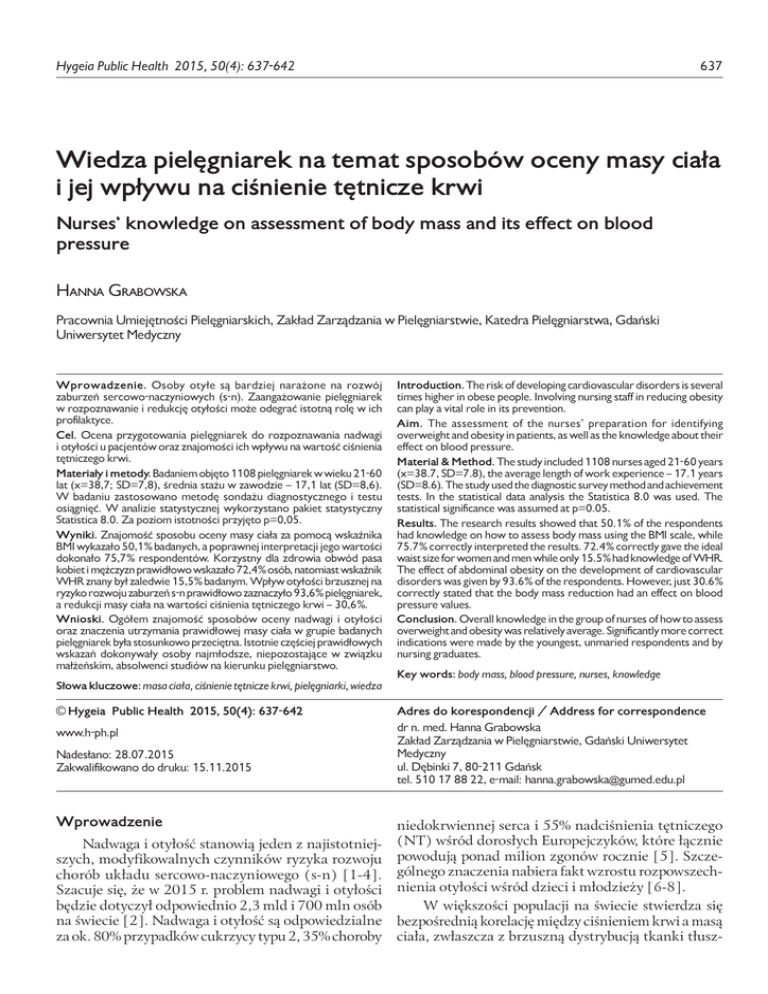 Grabowska Hygeia Public H.Health Wiedza 2015, pielęgniarek 50(4): 637-642 na temat sposobów oceny masy ciała i jej wpływu na ciśnienie tętnicze krwi 637 Wiedza pielęgniarek na temat sposobów oceny masy ciała i jej wpływu na ciśnienie tętnicze krwi Nurses’ knowledge on assessment of body mass and its effect on blood pressure Hanna Grabowska Pracownia Umiejętności Pielęgniarskich, Zakład Zarządzania w Pielęgniarstwie, Katedra Pielęgniarstwa, Gdański Uniwersytet Medyczny Wprowadzenie. Osoby otyłe są bardziej narażone na rozwój zaburzeń sercowo-naczyniowych (s-n). Zaangażowanie pielęgniarek w rozpoznawanie i redukcję otyłości może odegrać istotną rolę w ich profilaktyce. Cel. Ocena przygotowania pielęgniarek do rozpoznawania nadwagi i otyłości u pacjentów oraz znajomości ich wpływu na wartość ciśnienia tętniczego krwi. Materiały i metody. Badaniem objęto 1108 pielęgniarek w wieku 21-60 lat (x=38,7; SD=7,8), średnia stażu w zawodzie – 17,1 lat (SD=8,6). W badaniu zastosowano metodę sondażu diagnostycznego i testu osiągnięć. W analizie statystycznej wykorzystano pakiet statystyczny Statistica 8.0. Za poziom istotności przyjęto p=0,05. Wyniki. Znajomość sposobu oceny masy ciała za pomocą wskaźnika BMI wykazało 50,1% badanych, a poprawnej interpretacji jego wartości dokonało 75,7% respondentów. Korzystny dla zdrowia obwód pasa kobiet i mężczyzn prawidłowo wskazało 72,4% osób, natomiast wskaźnik WHR znany był zaledwie 15,5% badanym. Wpływ otyłości brzusznej na ryzyko rozwoju zaburzeń s-n prawidłowo zaznaczyło 93,6% pielęgniarek, a redukcji masy ciała na wartości ciśnienia tętniczego krwi – 30,6%. Wnioski. Ogółem znajomość sposobów oceny nadwagi i otyłości oraz znaczenia utrzymania prawidłowej masy ciała w grupie badanych pielęgniarek była stosunkowo przeciętna. Istotnie częściej prawidłowych wskazań dokonywały osoby najmłodsze, niepozostające w związku małżeńskim, absolwenci studiów na kierunku pielęgniarstwo. Słowa kluczowe: masa ciała, ciśnienie tętnicze krwi, pielęgniarki, wiedza Introduction. The risk of developing cardiovascular disorders is several times higher in obese people. Involving nursing staff in reducing obesity can play a vital role in its prevention. Aim. The assessment of the nurses’ preparation for identifying overweight and obesity in patients, as well as the knowledge about their effect on blood pressure. Material & Method. The study included 1108 nurses aged 21-60 years (x=38.7, SD=7.8), the average length of work experience – 17.1 years (SD=8.6). The study used the diagnostic survey method and achievement tests. In the statistical data analysis the Statistica 8.0 was used. The statistical significance was assumed at p=0.05. Results. The research results showed that 50.1% of the respondents had knowledge on how to assess body mass using the BMI scale, while 75.7% correctly interpreted the results. 72.4% correctly gave the ideal waist size for women and men while only 15.5% had knowledge of WHR. The effect of abdominal obesity on the development of cardiovascular disorders was given by 93.6% of the respondents. However, just 30.6% correctly stated that the body mass reduction had an effect on blood pressure values. Conclusion. Overall knowledge in the group of nurses of how to assess overweight and obesity was relatively average. Significantly more correct indications were made by the youngest, unmaried respondents and by nursing graduates. Key words: body mass, blood pressure, nurses, knowledge © Hygeia Public Health 2015, 50(4): 637-642 Adres do korespondencji / Address for correspondence www.h-ph.pl dr n. med. Hanna Grabowska Zakład Zarządzania w Pielęgniarstwie, Gdański Uniwersytet Medyczny ul. Dębinki 7, 80-211 Gdańsk tel. 510 17 88 22, e-mail: [email protected] Nadesłano: 28.07.2015 Zakwalifikowano do druku: 15.11.2015 Wprowadzenie Nadwaga i otyłość stanowią jeden z najistotniejszych, modyfikowalnych czynników ryzyka rozwoju chorób układu sercowo-naczyniowego (s-n) [1-4]. Szacuje się, że w 2015 r. problem nadwagi i otyłości będzie dotyczył odpowiednio 2,3 mld i 700 mln osób na świecie [2]. Nadwaga i otyłość są odpowiedzialne za ok. 80% przypadków cukrzycy typu 2, 35% choroby niedokrwiennej serca i 55% nadciśnienia tętniczego (NT) wśród dorosłych Europejczyków, które łącznie powodują ponad milion zgonów rocznie [5]. Szczególnego znaczenia nabiera fakt wzrostu rozpowszechnienia otyłości wśród dzieci i młodzieży [6-8]. W większości populacji na świecie stwierdza się bezpośrednią korelację między ciśnieniem krwi a masą ciała, zwłaszcza z brzuszną dystrybucją tkanki tłusz- 638 czowej [3, 9-11]. Prawidłowa masa ciała jest rozpoznawana wówczas, gdy wskaźnik BMI (Body Mass Index) wyliczony na podstawie masy ciała i wzrostu (masa ciała [kg]/wzrost [m]2) mieści się w zakresie 18,5-24,9 kg/m2. Nadwagę rozpoznaje się, gdy BMI wynosi ≥25 kg/m2, a otyłość, gdy BMI ≥30 kg/m2 [1, 9-11]. Jako kryterium otyłości brzusznej przyjęto zwiększony obwód pasa (waist circumference – WC), który należy mierzyć w pozycji stojącej w połowie odległości między dolnym brzegiem łuku żebrowego i górnym grzebieniem kości biodrowej, przy czym pomiar powinien nastąpić na końcu normalnego wydechu u pacjenta stojącego z nogami blisko siebie i kończynami górnymi wzdłuż boków ciała, z taśmą równolegle do podłogi [11]. Otyłość brzuszną stwierdza się w sytuacji, w której obwód pasa ≥80 cm u kobiet i ≥94 cm u mężczyzn (co powoduje zwiększone ryzyko s-n, natomiast obwód ≥88 cm u kobiet i ≥102 cm u mężczyzn oznacza ryzyko wysokie) [1, 8-12]. Do oceny otyłości brzusznej stosuje się również wskaźnik WHR (waist to hip ratio – WHR) oznaczający stosunek obwodu talii do obwodu bioder, mierzonego w najszerszej części pośladków (otyłość brzuszną rozpoznaje