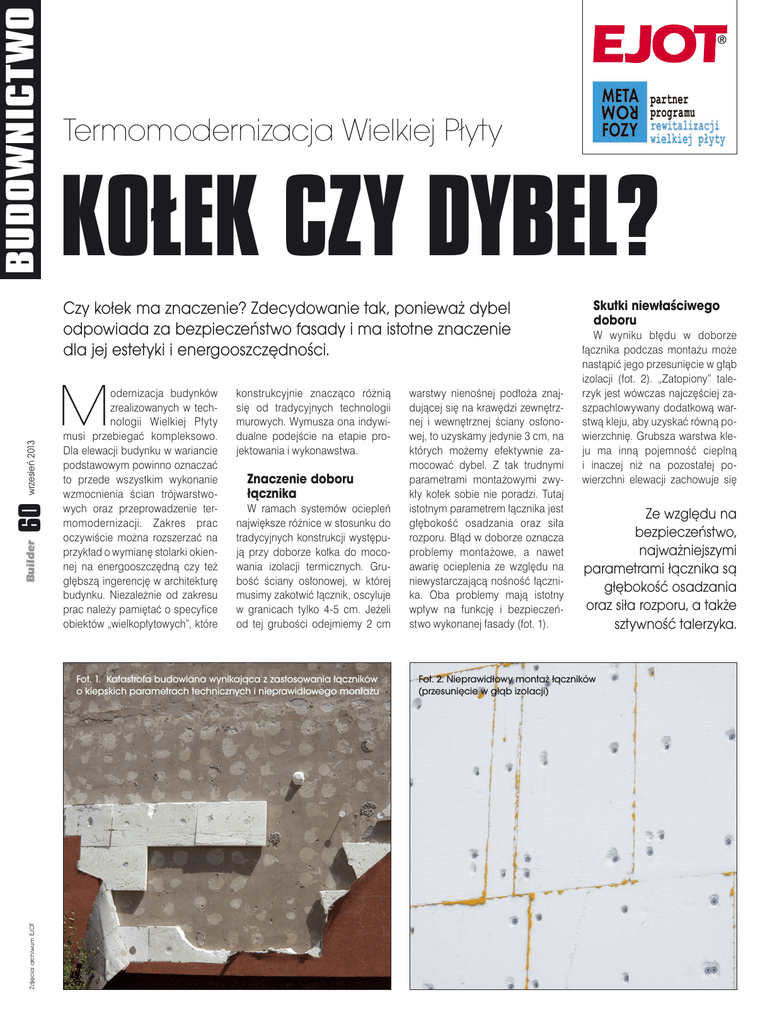 BUDOWNICTWO Termomodernizacja Wielkiej Płyty Kołek czy dybel? Builder 60 wrzesień 2013 Czy kołek ma znaczenie? Zdecydowanie tak, ponieważ dybel odpowiada za bezpieczeństwo fasady i ma istotne znaczenie dla jej estetyki i energooszczędności. M odernizacja budynków zrealizowanych w technologii Wielkiej Płyty musi przebiegać kompleksowo. Dla elewacji budynku w wariancie podstawowym powinno oznaczać to przede wszystkim wykonanie wzmocnienia ścian trójwarstwowych oraz przeprowadzenie termomodernizacji. Zakres prac oczywiście można rozszerzać na przykład o wymianę stolarki okiennej na energooszczędną czy też głębszą ingerencję w architekturę budynku. Niezależnie od zakresu prac należy pamiętać o specyfice obiektów „wielkopłytowych”, które konstrukcyjnie znacząco różnią się od tradycyjnych technologii murowych. Wymusza ona indywidualne podejście na etapie projektowania i wykonawstwa. Znaczenie doboru łącznika W ramach systemów ociepleń największe różnice w stosunku do tradycyjnych konstrukcji występują przy doborze kołka do mocowania izolacji termicznych. Grubość ściany osłonowej, w której musimy zakotwić łącznik, oscyluje w granicach tylko 4-5 cm. Jeżeli od tej grubości odejmiemy 2 cm Zdjęcia: archiwum EJOT Fot. 1. Katastrofa budowlana wynikająca z zastosowania łączników o kiepskich parametrach technicznych i nieprawidłowego montażu warstwy nienośnej podłoża znajdującej się na krawędzi zewnętrznej i wewnętrznej ściany osłonowej, to uzyskamy jedynie 3 cm, na których możemy efektywnie zamocować dybel. Z tak trudnymi parametrami montażowymi zwykły kołek sobie nie poradzi. Tutaj istotnym parametrem łącznika jest głębokość osadzania oraz siła rozporu. Błąd w doborze oznacza problemy montażowe, a nawet awarię ocieplenia ze względu na niewystarczającą nośność łącznika. Oba problemy mają istotny wpływ na funkcję i bezpieczeństwo wykonanej fasady (fot. 1). Skutki niewłaściwego doboru W wyniku błędu w doborze łącznika podczas montażu może nastąpić jego przesunięcie w głąb izolacji (fot. 2). „Zatopiony” talerzyk jest wówczas najczęściej zaszpachlowywany dodatkową warstwą kleju, aby uzyskać równą powierzchnię. Grubsza warstwa kleju ma inną pojemność cieplną i inaczej niż na pozostałej powierzchni elewacji zachowuje się Ze względu na bezpieczeństwo, najważniejszymi parametrami łącznika są głębokość osadzania oraz siła rozporu, a także sztywność talerzyka. Fot. 2. Nieprawidłowy montaż łączników (przesunięcie w głąb izolacji) Istotne parametry łącznika Równie istotnymi parametrami łączników, choć niezwiązanymi bezpośrednio z rodzajem konstrukcji obiektu, są sztywność ta- Fot. 3. Tzw. efekt biedronki (okrągłe plamy na elewacji) – skutek błędu w doborze łącznika i złego montażu Tab. Rozwiązania EJOT i ich parametry techniczne Nazwa dybla EJOT ejotherm STR U2G ejotherm H1 eco 25 mm 25 mm Głębokość zakotwienia Nośność łącznika w betonie Współczynnik CHI Średnica talerzyka Sztywność talerzyka ETA Typ montażu Ze względu na efektywność energetyczną, istotnym parametrem jest przenikalność ciepła w punkcie, tzw. współczynnik CHI. straty ciepła na każdym łączniku, a więc bardzo często w kilku tysiącach punktów. Ponadto, mostki termiczne – podobnie jak wyżej opisane dodatkowe szpachlowanie – w dużym stopniu odpowiadają za powstawanie efektu biedronki (fot. 3). Nie pozostaje nam więc nic innego, jak zadbać o to, aby prawidłowo dobrać łącznik z uwzględnieniem jego najważniejszych parametrów (fot. 4). Ze względu na bezpieczeństwo najważniejszymi parametrami są głębokość osadzania oraz siła rozporu, a także sztywność tale- 1,5 kN 0,9 kN 0,001 W/K 0,001 W/K 60 mm 60 mm 0,6 kN/mm 0,6 kN/mm ETA-04/0023 ETA-11/0192 wkręcany wbijany rzyka. Analizując produkty, powinniśmy szukać takich, których głębokość osadzania wynosi ok. 25 mm i jest potwierdzona w Europejskiej Aprobacie Technicznej (ETA). W aprobacie sprawdzimy również czy łącznik miał przebadaną sztywność talerzyka. Jeśli tak jest, to spełnia on wymogi normowe. Najwyższą siłę rozporu uzyskują łączniki wkręcane. Ze względu na efektywność energetyczną, istotnym parametrem jest przenikalność ciepła w punkcie, tzw. współczynnik CHI. Wyniki, jakie uzyskał łącznik, znajdziemy również w Europejskiej Aprobacie Technicznej (ETA), o ile został on przebadany. Wymagania normowe to 0,002 W/K, ale są łączniki, których parametr jest lepszy nawet dwukrotnie. Zatem czy kołek ma znaczenie? Odpowiedź nasuwa się sama – zdecydowanie tak. EJOT Polska Sp. z o.o. Sp.k. wrzesień 2013 ociepleniowy nie został przez łącznik przeciągnięty. Parametr ten tak samo jak parametr głębokości osadzania i siły rozporu odpowiada za bezpieczeństwo fasady. Przenikalność ciepła w punkcie jest parametrem związanym z energooszczędnością i estetyką. Choć nie ma on wpływu na bezpieczeństwo, jest równie istotny. Proces termomodernizacji przeprowadzamy w celu oszczędzania energii. Jeżeli nie zadbamy, aby łącznik był również energooszczędny, to obniżymy efektywność naszej fasady poprzez Fot. 4. Rozwiązanie EJOT w postaci montażu zagłębionego dybla ejotherm STR U2G z użyciem zaślepki systemowej 61 Analizując produkty, powinniśmy szukać takich, których głębokość osadzania wynosi ok. 25 mm i jest potwierdzona w Europejskiej Aprobacie Technicznej (ETA). Builder tu wilgoć, która odpowiada za osadzanie się zabrudzeń i porastanie powierzchni przez glony. W efekcie uzyskuje się tzw. efekt biedronki, czyli okrągłe plamy na elewacji, które istotnie psują jej estetykę (fot. 3). Innym niebezpieczeństwem jest stosowanie zwykłych kołków, które nie zostaną odpowiednio mocno osadzone i w związku z tym nie zapewnią zakładanej nośności łączników. Oznacza to, że system ociep