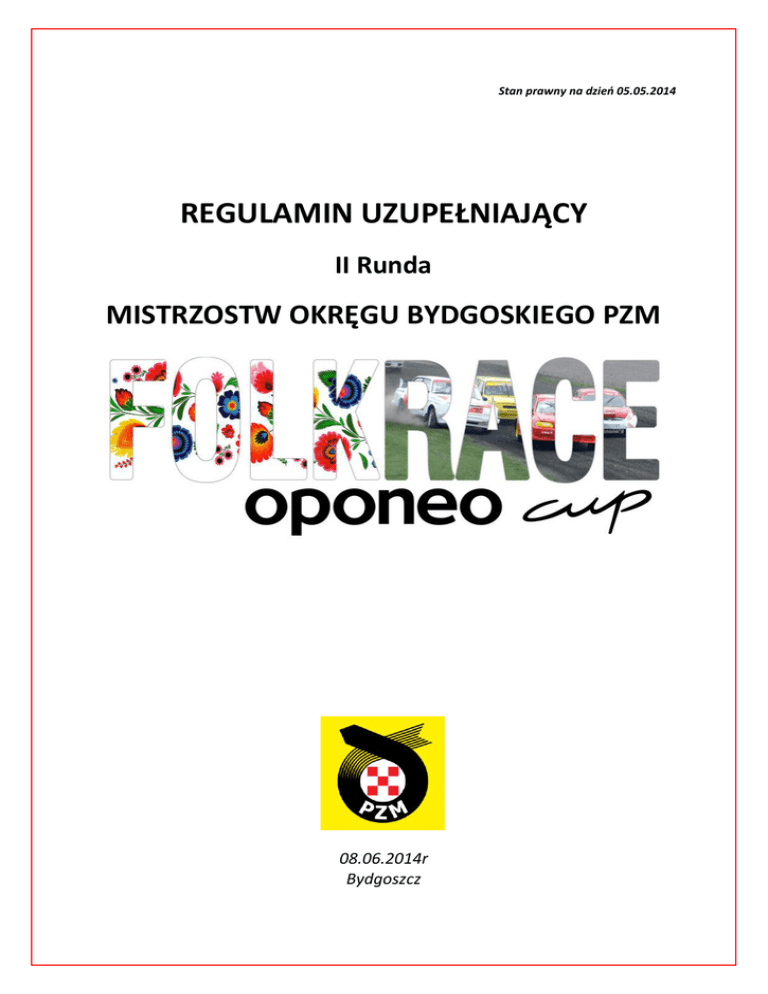 Stan prawny na dzień 05.05.2014 REGULAMIN UZUPEŁNIAJĄCY II Runda MISTRZOSTW OKRĘGU BYDGOSKIEGO PZM 08.06.2014r Bydgoszcz I. ZAWODY I ORGANIZATOR 1. Zawody stanowią II Rundę Mistrzostw Okręgu Bydgoskiego PZM Folkrace OPONEO Cup 2014 2. Niniejsze zawody organizowane są na podstawie : ZAWODY ZORGANIZOWANE ZGODNIE Z MIĘDZYNARODOWYM KODEKSEM SPORTOWYM FIA I JEGO ZAŁĄCZNIKAMI ORAZ REGULAMINEM KRAJOWYM SPORTU SAMOCHODOWEGO PZM - Międzynarodowego Kodeksu Sportu Samochodowego FIA wraz z załącznikami - Regulaminu rozgrywek Rallycross 2014 zatwierdzonego przez GKSS PZM - Regulaminu Ramowego MOB PZM Folkrace OPONEO Cup 2014 - Komunikatów OKSS 2014 - Regulaminu Ochrony Środowiska w Sportach Motorowych - Niniejszego regulaminu uzupełniającego 3. Organizatorem zawodów jest: Automobilklub Kujawsko-Pomorski ul. Chodkiewicza nr 30 85-064 Bydgoszcz tel. +48 791 777 111 przy współpracy z: LKT "Wyczół" Gościeradz 86-011 Wtelno tel. +48 604 112 025 4. Termin zawodów 08 czerwca 2014 roku 5. Miejsce rozgrywania zawodów: Tor Rallycross Toruń ul. Bielańska 66 6. Wiza ZO PZM: 09/OKSS/2014 wydana dnia 07/05/2014r. II. WŁADZE ZAWODÓW Zespół Sędziów Sportowych Przewodniczący Patryk Brejnak I-465/12 Członek Marcin Jettka I-513/12 Członek Piotr Kobus II-734/09 Bogusław Kurtyka I-332/12 Mirosław Urbaczewski I-560/13 Krzysztof Studziński I-003/12 Delegat Techniczny OKSS Dyrektor Zawodów Dyrektor Wyścigu tel. 606 911 003 2 Asystent Dyrektora Wyścigu Marek Magrowski I-517/12 Kierownik zabezpieczenia i trasy Tomasz Błażejewski _-___/__ Kierownik BK Karol Marasek I-461/12 Sędzia Techniczny BK Filip Markowski II-720/08 Kierownik Biura Zawodów Karolina Markowska A Kierownik Chronometrażu Grzegorz Ostrowski 01/10/CH Pełna lista obsady sędziowskiej zostanie zweryfikowana i zatwierdzona przez OKSS na 48 godzin przez BK i potwierdzona przez ZSS po OA. III. PROGRAM ZAWODÓW Niedziela (08.06.2013) : - 07:30 Otwarcie Biura Zawodów - 07:30 Otwarcie Parku Maszyn - 07:30-09:00 Obiór Administracyjny - 07:30-09:00 Badanie Kontrolne - 09:15 posiedzenie ZSS - 09:40 Odprawa z zawodnikami /kierowcami - 10:00-10:40 Trening Wolny - 10:45-11:15 Trening Oficjalny - 11:25 II posiedzenie ZSS - 12:45-14:15 I i II kwalifikacja - 14:45-15:30 III kwalifikacja / posiedzenie ZSS - 16:00-16:45 Finały / posiedzenie ZSS - 17:15 Wyniki oficjalne i wręczenie nagród IV. POSTANOWIENIA OGÓLNE 1. Wszystkich zawodników/kierowców obowiązuje całkowity zakaz treningów na torze poza wyznaczonymi godzinami, jak również na terenie dróg dojazdowych i parku maszyn, pod rygorem kary finansowej do wykluczenia z zawodów włącznie. 2. Treningi wolne zostaną zorganizowane wg harmonogramu zawodów. Będą miały formę wyjazdu na 3 okrążenia toru. W czasie przeznaczonym na trening wolny, ilość wyjazdów dowolna. 3. Formularz zgłoszenia wypełnia zawodnik wyłącznie przez stronę internetową www.folkrace.pl/zgloszenie/. Po prawidłowym wypełnieniu, dołączeniu potwierdzenia wpłaty wpisowego i zatwierdzeniu, zgłoszenie zostanie automatycznie wysłane pocztą elektroniczną do danego zawodnika na wskazany przez niego w formularzu adres e-mail. Zgłoszenie będzie przyjęte tylko i wyłącznie po opłaceniu wpisowego. 3 4. Zgłoszenia: www.folkrace.pl/zgloszenie/ 5. Terminy zgłoszeń: - 1 termin zgłoszeń upływa z dniem: 29.05.2014 (zgłoszenie dostarczone do organizatora i wpłata zaksięgowana na koncie wskazanym przez Organizatora) - 2 termin zgłoszeń upływa z dniem: 01.06.2014 6. Wysokość wpisowego z reklamą dodatkową organizatora wynosi: - w pierwszym terminie 300 zł - w drugim terminie 450 zł Wysokość wpisowego bez reklamy dodatkowej organizatora wynosi: - w pierwszym terminie 600 zł - w drugim terminie 900 zł Wpłaty wpisowego powinny być dokonywane na rachunek: Bank Zachodni WBK S.A 83 1090 1072 0000 0001 1507 9814 7. Podział na klasy: I – samochody z silnikami o pojemności do 1150cm3 II – samochody z silnikami o pojemności od 1150cm3 do 1600cm3 III – samochody z silnikami o pojemności od 1600cm3 do 2000cm3 IV – samochody z silnikami o pojemności ponad 2000cm3 oraz pojazdy z napędem na 4 koła bez względu na pojemność silnika OPEN – samochody wybiegające poza ramy regulaminu technicznego Folkrace na rok 2014 BMW E36 – klasa markowa zgodnie z komunikatem OKSS PZM 7.1 Samochody posiadające silniki benzynowe z turbo doładowaniem zaliczone zostaną do klasy według pojemności wynikającej z pomnożenia pojemności silnika przez współczynnik 1,7, samochody z silnikami wysokoprężnymi z turbo doładowaniem przez współczynnik 1,5, natomiast samochody z silnikami Wankla przez współczynnik 2. 7.2 Do udziału w zawodach może zgłosić się zawodnik/kierowca w dwóch różnych klasach, samochodami odpowiadającymi danej klasy. W takim przypadku wpisowe wynosi 300zł drugie auto + 50 % wpisowego, analogicznie drugi termin zgłoszeń. 8. Niesportowe zachowanie zawodnika/kierowcy lub jego serwisu podczas zawodów będzie karane karą finansowa w wysokości od 50zł do 500zł, a następnie wykluczeniem zawodnika /kierowcy z zawodów. Pod rygorem wykluczenia z biegu na polach startowych obowiązuje kompletne wyposażenie bezpieczeństwa (zapięty kask, zapięty kombinezon, buty, rękawiczki, zapięte pasy) 9. We wszystkich miejscach, w których sprzęt jest serwisowany oraz w miejscach, w których używane są płyny inne niż czysta woda, obowiązkowe jest używanie mat ekologicznych lub 4 powierzchni składającej się z warstwy chłonnej i nieprzepuszczalnej, lub płachty płynoszczelnej, lub folii o minimalnej grubości 0,5 mm. 10. Wykonanie badania kontrolnego w terminie innym niż podany w niniejszym regulaminie możliwe jest jedynie za zgodą Dyrektora Zawodów i dodatkową opłatą 200 zł. 11. Odprawa z zawodnikami odbędzie się przed Biurem Zawodów. Nieobecność na odprawie – brak podpisu na liście , karana będzie karą finansową 200 zł do wyklu