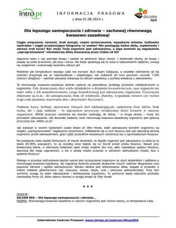 INFORMACJA PRASOWA z dnia 01.08.2014 r. Dla lepszego samopoczucia i zdrowia – zachowaj równowagę kwasowo-zasadową! Ciągłe zmęczenie, senność, brak energii, częste zachorowania, wypadanie włosów, huśtawka nastrojów i ciągle przybywające kilogramy na wadze? Nie pomagają żadne diety, suplementy i zdrowy tryb życia? Być może Twój organizm jest zakwaszony, a jego komórki są negatywnie „zaprogramowane” niewłaściwą dietą stosowaną przez Ciebie od lat! Zapewne wielu z nas pamięta kwasy i zasady ze szkolnych lekcji chemii. I doskonale wiemy, że kwasy i zasady są sobie przeciwne, jak plus i minus. Ale kiedy spotykają się ze sobą w odpowiednim stężeniu, znoszą się wzajemnie i wytwarzają neutralny odczyn pH. Podobnie jak temperatura naszego ciała ma wynosić 36,6 stopni Celsjusza, a wszelkie odchylenia od tej wartości przyjmuje się za nieprawidłowe i niepokojące, tak wskaźnik pH krwi powinien wynosić 7,365 (odczyn obojętny) – wartości powyżej wskazują na odczyn zasadowy, a poniżej świadczą o zakwaszeniu. Ta równowaga kwasowo-zasadowa istotnie wpływa na prawidłowy przebieg procesów metabolicznych w organizmie. Gdy dostarczamy zbyt wielu składników o działaniu kwasotwórczym, nasz organizm nie radzi sobie z ich neutralizowaniem, czego konsekwencją jest zakwaszenie organizmu. Fizycznymi objawami są m.in.: złe samopoczucie, brak sił witalnych, choroby, wypadanie włosów czy wzrost wagi ciała (pomimo stosowania diet i aktywności fizycznej!). Nadmiar kawy, herbaty, stosowanie różnych diet odchudzających, nadmierna ilość leków, brak ruchu, ale i jego nadmiar – to najczęstsze przyczyny zwiększonej ilości kwasów w naszym organizmie. Wśród przyczyn wymienia się również nadwagę, do której – w drugą stronę – może też prowadzić zakwaszenie. Jak dowiodły badania, brak równowagi kwasowo-zasadowej organizmu jest główną przyczyną tzw. efektu jo-jo! Jak wykazał w swoich badaniach czeski lekarz dr Otto Horak, stale zakwaszane komórki organizmu są niejako „zaprogramowane” negatywnie żywieniowo. Odkładanie się w nich tłuszczu jest zaś naturalną obroną organizmu przed zakwaszeniem, gdyż część produktów kwasowych rozcieńcza się w zgromadzonym tłuszczu. Na podstawie wielu badań klinicznych, dr Horak stwierdził, że dopóki organizm jest zakwaszony (a dotyczy to około 85-90% populacji!), to za wszelką cenę będzie się on bronił przed utratą tłuszczu. Nawet przy drastycznej diecie, w pierwszej kolejności spali swoje mięśnie (bo one, jako największy spalacz tłuszczu, stanowią dla niego zagrożenie), a nie o utratę mięśni przecież w zdrowym odchudzaniu chodzi, lecz o spalenie tłuszczu! Dlatego w procesie odchudzania bardzo ważne jest oczyszczenie organizmu ze złych składników i zadbanie o równowagę kwasowo-zasadową. Jej regularna kontrola pozwala skutecznie zrzucić nadmiar kilogramów oraz poprawić zdrowie i ogólne samopoczucie. Bardzo istotna jest zbilansowana dieta, bogata w produkty o niskim indeksie glikemicznym (np. warzywa, owoce, kasze, ryże i pieczywo pełnoziarniste). Poza tym zwróćmy uwagę na stałe odkwaszanie i detoksykację organizmu. Tu pomocne będą naturalne produkty niemieckiej firmy LR, które zaleca również w swojej terapii dr Otto Horak. *** ZDJĘCIE: SILVAN SPA – Dla lepszego samopoczucia i zdrowia… PODPIS: Równowaga kwasowo-zasadowa w naszym organizmie jest równie ważna, co temperatura ciała. Internetowe Centrum Prasowe: www.intropr.pl/centrum/SilvanSPA *** SILVAN SPA Silvan SPA to kompleks Spa&Wellness, z bogatą ofertą zabiegów kosmetycznych i relaksacyjnych, z bazą noclegową. To wyjątkowe i kameralne miejsce odpoczynku dla ciała i duszy, dla osób ceniących spokój, kameralność i domową atmosferę. Ośrodek położony jest w miejscowości Żytna, znajdującej się na trasie Rybnik (16 km) i Racibórz (10 km), w otulinie lasów, łąk i pól. WIĘCEJ INFORMACJI: www.silvanspa.pl oraz www.facebook.com/SilvanSPA *** Silvan SPA ul. Grabie 14 47-435 Żytna T: (+48) 32 421 80 04, (+48) 505 604 503 E: [email protected] WWW.silvanspa.pl Strona 2
