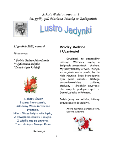 Szkoła Podstawowa nr 1 im. ppłk . pil. Mariana Pisarka w Radzyminie Drodzy Rodzice i Uczniowie! 11 grudnia 2012, numer 8 W numerze: Grudzień, to szczególny miesiąc. Wszyscy myślą o świętach, prezentach i choince. My pomyśleliśmy o tych, którym szczególnie warto pomóc, by dla nich również Boże Narodzenie było pełne radości. Dlatego zorganizowaliśmy zbiórkę słodyczy i środków czystości dla małych podopiecznych z Domu Dziecka w Równem. * Święta Bożego Narodzenia *Wydarzenia szkolne *Drugie życie książki Z okazji Świąt Bożego Narodzenia, składamy Wam serdeczne życzenia. Niech Wam święta miłe będą, Z dźwiękiem śpiewu i kolędą. Z wigilią tuż po zmroku, I w radosnym Nowym Roku. Dziękujemy wszystkim, którzy przyłączą się do zbiórki. Aneta Jusińska, Barbara Giera, Dorota Milewska Redakcja 1 Idą Święta wypełniony jest do ostatniej chwili ostatnimi przygotowaniami. Charakterystycznym przysmakiem, który pojawia się na niemieckich stołach podczas świąt Bożego Narodzenia jest bakaliowe ciasto stollen. Kształtem przypomina nowo narodzone dzieciątko zawinięte w becik. Ulubioną potrawą w pierwszym dniu świąt jest pieczona gęś. Niedługo Święta. Obchodzimy cztery tygodnie Adwentu, czyli oczekiwania na Jezusa. W kościołach codziennie odbywają się roraty, czyli msze święte poświęcone Maryi oczekującej Jezusa. Boże Narodzenie Brytanii w Wielkiej Brytyjczycy świąteczne przygotowania rozpoczynają już w połowie listopada kupując prezenty swym najbliższym. W Londynie, na Trafalgar Square, ludzie gromadzą się wokół wielkiej choinki, która od czasów II wojny światowej jest tradycyjnym darem od Norwegów. W czasie świąt występują tam chóry z różnych stron świata, śpiewają kolędy. Nie obchodzi się tu Wigilii, a świąteczny posiłek spożywa się 25 grudnia, około piątej po południu. Wtedy rodzina i przyjaciele siadają do stołu, na którym króluje indyk nadziewany kasztanami. Na deser podaje się pudding i placek z bakaliami. Wcześniej, o godz. 15.00 świąteczne orędzie wygłasza królowa. W boxing day, 26 grudnia, rozpakowuje się prezenty przyniesione przez Santa Claus’a (Świętego Mikołaja). W Wigilię, gdy zaświeci pierwsza gwiazdka, zasiadamy do stołu, na którym według tradycji powinno się znaleźć dwanaście potraw. Powinno być również dodatkowe nakrycie dla nieoczekiwanego gościa. Pod obrus kładziemy sianko, a nad stołem lub drzwiami zawieszamy jemiołę. Wcześniej ubieramy choinkę, pod którą znajdziemy prezenty. Święta to magiczny czas! Boże Narodzenie w Niemczech Przygotowania do świąt rozpoczynają się w Niemczech już na cztery tygodnie przed Wigilią - w pierwszą niedzielę adwentu. W większości mieszkań pojawiają się w tym dniu adwentowe wieńce z czterema świecami. Dzieci dostają adwentowe kalendarze. Każdy dzień związany jest z niespodzianką najczęściej czekoladką. 24 grudnia Karolina Jastrzębska kl.Vc 2 Boże Narodzenie we Włoszech najważniejszy symbol bożonarodzeniowy w tym kraju. Pierwszy i drugi dzień Świąt Bożego Narodzenia Włosi obchodzą bardzo uroczyście w gronie najbliższych; do kolacji wigilijnej nie przywiązują większej wagi. Na północy kraju, w świątecznym menu znajdują się dania faszerowane mięsem, warzywami i serem tortellini, zaś na południu serwuje się lasagne z sosem pomidorowym z mięsem wieprzowym i serami. Włosi są bardzo przywiązani do tradycji budowy szopek, bowiem pierwsza szopka, która dała początek bożonarodzeniowej tradycji powstała we Włoszech. Święta Bożego Narodzenia w Hiszpanii Wigilia rozpoczyna się uroczystościami ulicznymi. Przeważnie są to parady mieszkańców, ubranych w stroje ludowe, w towarzystwie udekorowanych wstążkami zwierząt. Parady odbywają się w asyście muzyki ludowej, trąbek, bębenków i piszczałek. Kończą się one w miejscowej stajence. Wieczorem, po paradzie cała rodzina spotyka się w domu najstarszego członka rodu na uroczystej kolacji. Nie jest to jak w Polsce kolacja postna. Wręcz przeciwnie - hiszpański stół wigilijny cechuje wyjątkowe bogactwo potraw i duży przepych. Podaje się: • la lombarda – czerwoną kapustę o długich liściach, gotowaną z czosnkiem i oliwą z oliwek; w Kraju Basków podaje się zamiast niej kalafiora w sosie vinegrette • el besugo asado – pieczonego leszcza morskiego, skropionego cytryną • różne inne pieczenie: pavo [pabo]–indyka cordero [kordero] – jagnię lechón [lecion] – prosię pato – kaczora capón [kapon] – koguta conejo [konecho] – królika Natalia Szatan Święta Bożego Narodzenia w Grecji Obchody świąt Bożego Narodzenia trwają w Grecji aż 12 dni. Przed mszą Bożego Narodzenia chłopcy śpiewają kolędy, za co dostają słodkości: migdały i orzechy, bądź też pieniądze. Nabożeństwo zaczyna się o czwartej rano i trwa aż do wschodu słońca. Ważną potrawą dla Greków jest chleb Chrystusa: duże, okrągłe pieczywo z orzechami, zawierające odciski drewnianej pieczęci przedstawiającej symbol religijny. Ksiądz chodzi od domu do domu i kropi święconą wodą głównie te miejsca, gdzie mogą się znajdować kallikantzari (złe duszki). Grecką tradycją jest stawianie zamiast choinki przystrojonego świątecznie modelu żaglowca. Jest to Piotr Skórka 3 Święta Bożego Narodzenia we Francji papierem do pieczenia. Gorące jeszcze ciasto wlać do blaszki i zostawić do ostudzenia na 10 minut. Ostudzone ciasto włożyć do lodówki i pozostawić na 4 godziny. Francja, 25 grudnia obchodzi się Boże Narodzenie (Noël), które zgodnie z francuską tradycją trwa tylko jeden dzień. Świąteczny obiad przypada właśnie na ten dzień, na stole króluje wówczas wędzony łosoś, gęsia wątróbka, biała kaszanka lub ostrygi. Nieodłącznym elementem są msze święte z tradycyjnymi chorałami. Symbolami Świąt Bożego Narodzenia we Francji są: domek 