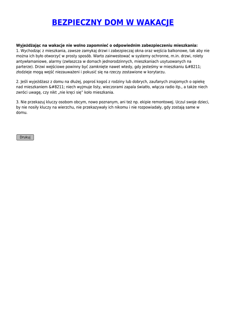 BEZPIECZNY DOM W WAKACJE Wyjeżdżając na wakacje nie wolno zapomnieć o odpowiednim zabezpieczeniu mieszkania: 1. Wychodząc z mieszkania, zawsze zamykaj drzwi i zabezpieczaj okna oraz wejścia balkonowe, tak aby nie można ich było otworzyć w prosty sposób. Warto zainwestować w systemy ochronne, m.in. drzwi, rolety antywłamaniowe, alarmy (zwłaszcza w domach jednorodzinnych, mieszkaniach usytuowanych na parterze). Drzwi wejściowe powinny być zamknięte nawet wtedy, gdy jesteśmy w mieszkaniu – złodzieje mogą wejść niezauważeni i pokusić się na rzeczy zostawione w korytarzu. 2. Jeśli wyjeżdżasz z domu na dłużej, poproś kogoś z rodziny lub dobrych, zaufanych znajomych o opiekę nad mieszkaniem – niech wyjmuje listy, wieczorami zapala światło, włącza radio itp., a także niech zwróci uwagę, czy nikt „nie kręci się” koło mieszkania. 3. Nie przekazuj kluczy osobom obcym, nowo poznanym, ani też np. ekipie remontowej. Uczul swoje dzieci, by nie nosiły kluczy na wierzchu, nie przekazywały ich nikomu i nie rozpowiadały, gdy zostają same w domu. Drukuj