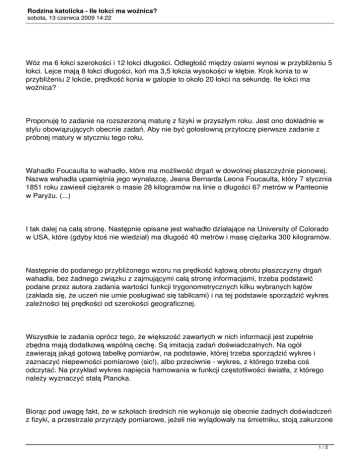 Rodzina katolicka - Ile łokci ma woźnica? sobota, 13 czerwca 2009 14:22 Wóz ma 6 łokci szerokości i 12 łokci długości. Odległość między osiami wynosi w przybliżeniu 5 łokci. Lejce mają 8 łokci długości, koń ma 3,5 łokcia wysokości w kłębie. Krok konia to w przybliżeniu 2 łokcie, prędkość konia w galopie to około 20 łokci na sekundę. Ile łokci ma woźnica? Proponuję to zadanie na rozszerzoną maturę z fizyki w przyszłym roku. Jest ono dokładnie w stylu obowiązujących obecnie zadań. Aby nie być gołosłowną przytoczę pierwsze zadanie z próbnej matury w styczniu tego roku. Wahadło Foucaulta to wahadło, które ma możliwość drgań w dowolnej płaszczyźnie pionowej. Nazwa wahadła upamiętnia jego wynalazcę, Jeana Bernarda Leona Foucaulta, który 7 stycznia 1851 roku zawiesił ciężarek o masie 28 kilogramów na linie o długości 67 metrów w Panteonie w Paryżu. (...) I tak dalej na całą stronę. Następnie opisane jest wahadło działające na University of Colorado w USA, które (gdyby ktoś nie wiedział) ma długość 40 metrów i masę ciężarka 300 kilogramów. Następnie do podanego przybliżonego wzoru na prędkość kątową obrotu płaszczyzny drgań wahadła, bez żadnego związku z zajmującymi całą stronę informacjami, trzeba podstawić podane przez autora zadania wartości funkcji trygonometrycznych kilku wybranych kątów (zakłada się, że uczeń nie umie posługiwać się tablicami) i na tej podstawie sporządzić wykres zależności tej prędkości od szerokości geograficznej. Wszystkie te zadania oprócz tego, że większość zawartych w nich informacji jest zupełnie zbędna mają dodatkową wspólną cechę. Są imitacją zadań doświadczalnych. Na ogół zawierają jakąś gotową tabelkę pomiarów, na podstawie, której trzeba sporządzić wykres i zaznaczyć niepewności pomiarowe (sic!), albo przeciwnie - wykres, z którego trzeba coś odczytać. Na przykład wykres napięcia hamowania w funkcji częstotliwości światła, z którego należy wyznaczyć stałą Plancka. Biorąc pod uwagę fakt, że w szkołach średnich nie wykonuje się obecnie żadnych doświadczeń z fizyki, a przestrzale przyrządy pomiarowe, jeżeli nie wylądowały na śmietniku, stoją zakurzone 1/2 Rodzina katolicka - Ile łokci ma woźnica? sobota, 13 czerwca 2009 14:22 w szafach, takie sformułowanie zadań maturalnych zakrawa na perfidię. Co zresztą sprawdza takie zadanie? Przecież nie może tu chodzić o umiejętność wklepania kilku liczb w kalkulator i zaznaczenia odpowiednich punktów w układzie współrzędnych, bo takie umiejętności powinni już posiadać uczniowie szkoły podstawowej. Przede wszystkim sprawdza dyspozycyjność. Sprawdza czy człowiek jest gotów bezmyślnie podstawić podane wartości do podanego cudzego wzoru i wyciągnąć wnioski, które podsuwa mu egzaminator. Izabela Brodacka-Falzmann Źródło: Niezależna.pl 2/2