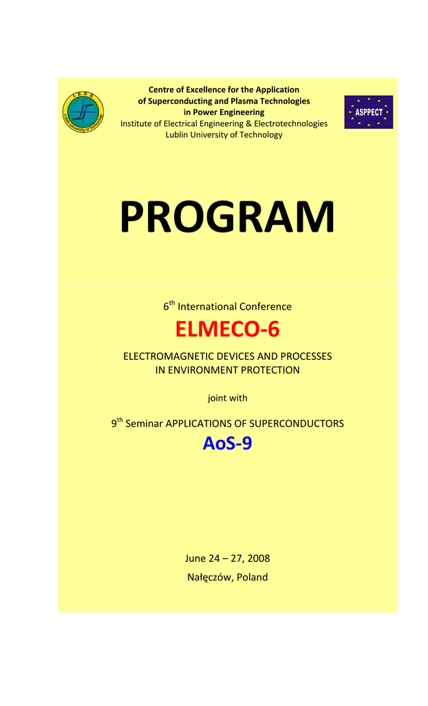E E I E n iv no l in log y L ub U ersity of Tec h Centre of Excellence for the Application of Superconducting and Plasma Technologies in Power Engineering Institute of Electrical Engineering & Electrotechnologies Lublin University of Technology PROGRAM 6th International Conference ELMECO‐6 ELECTROMAGNETIC DEVICES AND PROCESSES IN ENVIRONMENT PROTECTION joint with 9th Seminar APPLICATIONS OF SUPERCONDUCTORS AoS‐9 June 24 – 27, 2008 Nałęczów, Poland Institute of Electrical Engineering and Electrotechnologies Lublin University of Technology 38a Nadbystrzycka St.20‐618 Lublin Tel./fax: 48 81 53 84 289, 48 81 53 84 643 E‐mail: [email protected] http://ipee.pollub.pl/elmeco_aos 6th International Conference ELMECO‐6 ELECTROMAGNETIC DEVICES AND PROCESSES IN ENVIRONMENT PROTECTION joint with th 9 Seminar APPLICATIONS OF SUPERCONDUCTORS AoS‐9 June 24 – 27, 2008 Nałęczów, Poland Organized by: Centre of Excellence for the Application of Superconducting and Plasma Technologies in Power Engineering Institute of Electrical Engineering and Electrotechnologies Lublin University of Technology Conference venue: Conference Centre ENERGETYK 10 Paderewskiego St., 24 ‐ 140 Nałęczów tel. (48‐81) 50 14 604 1 Scientific Committee Kazimierz Adamiak Krystyna Cedzyńska Antoni Cieśla Marian Ciszek Vladimir Datskov Gordon B. Donaldson Kenji Ebihara Bartek A. Głowacki Bogusław Grzesik Jan Janca Tadeusz Janowski Ulrich Kogelschatz Zbigniew Kołaciński Jan Leszczyński Bolesław Mazurek Jerzy Mizeraczyk Anthony J. Moses Andrzej Nafalski Ryszard Pałka Krzysztof Schmidt‐Szałowski Andrzej Siemko Jacek Sosnowski Petro G. Stakhiv Henryka D. Stryczewska Bronisław Susła Jan Sykulski Andrzej Wac‐Włodarczyk Hans Erich Wagner Chobei Yamabe Sotoshi Yamada Kazimierz Zakrzewski Andrzej Zaleski (University of Western Ontario, Canada) (Technical University of Łódź, Poland) (AGH University of Science and Technology, Cracow, Poland) (Polish Academy of Science, Wrocław, Poland) (Joint Institute for Nuclear Research, Dubna, Russia) (University of Strathclyde, Glasgow, UK) (Kumamoto University, Japan) (University of Cambridge, UK) (Silesian University of Technology, Gliwice, Poland) (Technical University of Brno, Czech Republic) (Lublin University of Technology, Poland) (ABB, Switzerland) (Technical University of Łódź, Poland) (Technical University of Łódź, Poland) (Electrotechnical Institute, Wrocław, Poland) (Institute of Fluid Flow Machinery, PAS, Gdańsk, Poland) (Wolfson Centre for Magnetics Techn., Cardiff Univ., UK) (University of South Australia, Adelaida) (Szczecin University of Technology, Poland) (Warsaw University of Technology, Poland) (CERN, Geneva, Switzerland) (Electrotechnical Institute, Warsaw, Poland) (Technical University of Lviv, Ukraine) (Lublin University of Technology, Poland) (Poznań University of Technology, Poland) (University of Southampton, UK) (Lublin University of Technology, Poland) (Ernst‐Moritz‐Arndt‐University, Greifswald, Germany) (Saga University, Japan) (Kanazawa University, Japan) (Technical University of Łódź, Poland) (Polish Academy of Science, Wrocław, Poland Organizing Committee Tadeusz Janowski ‐ Chairman Henryka Danuta Stryczewska Andrzej Wac‐Włodarczyk Paweł Surdacki Sławomir Kozak Beata Kondratowicz‐Kucewicz Agata Troncewicz‐Świtek Renata Jaroszyńska ‐ Secretary 2 Tuesday, 24 June’08 1900 – 2000 Dinner from 17.30 ‐ Registration: Conference Centre ENERGETYK in Nałęczów 30 2000 16 – 18 30 3 2000 Conference dinner 00 18 Poster session PS‐1 1500 – 1630 Barbecue Departure to Nałęczów Coach trip to Zamość Breakfast Thursday, 26 June’08 900– 1800 800 Oral session OS‐3 Lunch 30 1330 – 1500 30 11 – 13 Coffee break 1100 – 1130 Oral session OS‐2 Oral session OS‐1 Breakfast 900 – 1100 800 Wednesday, 25 June’08 Program of ELMECO‐6 joint with AoS‐9 1230 1030 – 1230 900 – 1030 800 Lunch Oral session OS‐4 Poster session PS‐2 Breakfast Friday, 27 June‘08 Conference of ELMECO‐6 joint with AoS‐9 Tuesday, 24 June’08 17.30 – Registration: Conference Centre ENERGETYK in Nałęczów 19.00 – 20.00 Dinner Wensday, 25 June’08 8.00 Breakfast 9.00 – 11.00 ORAL SESSION OS‐1 Chairman: prof. J. Mizeraczyk, prof. C. Yamabe 1. Zbigniew Kołaciński, Łukasz Szymański, Witold Sroczyński, Zbigniew Muszczynko Plasma treatment of spent chemicals 2. Kenji Ebihara, Shinji Sugimoto, Tomoaki Ikegami, Fumiaki Mitsugi, Henryka D. Stryczewska Application of gaseous ozone to agricultural soil sterilization 3. Krystyna Cedzyńska Comparision of toxic ashes solidification method 4. Bogusław Grzesik, Mariusz Stępień, Sebastian Krosny FEM and laboratory tests of HTS transformer with improved utilization of superconducting wire 5. Mariusz Stępień, Bogusław Grzesik Characteristics of new magnetic materials in LN2 for HTS transformers 6. Ernest Gnapowski Investigations of the DBD reactor with metal mesh electrodes and glass wool dielectric 4 11.00 – 11.30 Coffee break 11.30 – 13.30 ORAL SESSION OS‐2 Chairman: prof. Z. Kołaciński, prof. K. Ebihara 1. Mariusz Jasiński, Mirosław Dors, Jerzy Mizeraczyk Production of hydrogen via methane conversion using microwave plasma source with CO2 swirl 2. Valeriy Chernyak, Sergiej Olszewski, Yrina Prysiazhnevych, Witalij Yukhymenko, Vadym Naumov, Dmitry Levko, Anatolij Shchedrin, Andriy Rybatsev, Valentina Demchina, Vladimir Kudryavtsev Transversal gas discharges in plasma liquid systems and its applications for environmental protection 3. Yrina Prysiazhnevych, Valeriy Chernyak, Sergiej Olszewski, Witalij Yukhymenko Plasma properties of transverse arc at atmospheric pressure 4. G.S. Malhi, S.C. Mukhopadhyay, Andrzej Nafalski Modelling of a magnetic current limiter for reliable operation 5. Sebastian Gnapowski, Chobei Yamabe, Satoshi Ihara Ozone generation characteristic of ozonizer with the rotating type electrod 6. Lewandowska Monika, Maurizio 