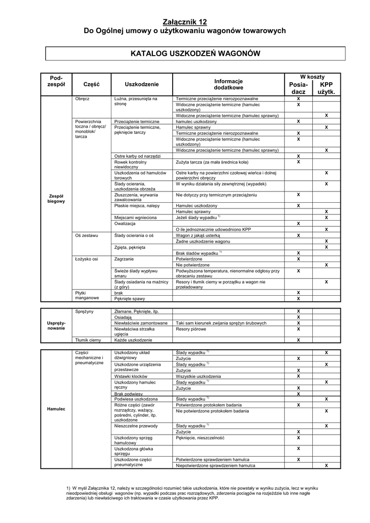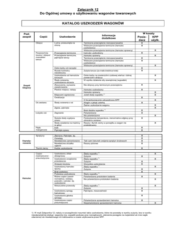 Załącznik 12 Do Ogólnej umowy o użytkowaniu wagonów towarowych KATALOG USZKODZEŃ WAGONÓW Podzespół Część Uszkodzenie Obręcz Luźna, przesunięta na stronę Powierzchnia toczna / obręcz/ monoblok/ tarcza Przeciążenie termiczne Przeciążenie termiczne, pęknięcie tarczy Ostre karby od narzędzi Rowek kontrolny niewidoczny Uszkodzenia od hamulców torowych Ślady ocierania, uszkodzenia obrzeża Złuszczenia, wyrwania zawalcowania Płaskie miejsca, nalepy Zespół biegowy Miejscami wgnieciona Owalizacja Oś zestawu Ślady ocierania o oś Informacje dodatkowe Termiczne przeciążenie nierozpoznawalne Widoczne przeciążenie termiczne (hamulec uszkodzony) Widoczne przeciążenie termiczne (hamulec sprawny) hamulec uszkodzony Hamulec sprawny Termiczne przeciążenie nierozpoznawalne Widoczne przeciążenie termiczne (hamulec uszkodzony) Widoczne przeciążenie termiczne (hamulec sprawny) Zużyta tarcza (za mała średnica koła) W koszty Posiadacz KPP użytk. X X X X X X X X X X X Ostre karby na powierzchni czołowej wieńca i dolnej powierzchni obręczy W wyniku działania siły zewnętrznej (wypadek) X Nie dotyczy przy termicznym przeciążeniu X Hamulec uszkodzony Hamulec sprawny Jeżeli ślady wypadku 1) X X X X O ile jednoznacznie udowodniono KPP Wagon z jakąś usterką Żadne uszkodzenie wagonu X X X X Zgięta, pęknięta Łożysko osi Zagrzanie Płytki manganowe Świeże ślady wypływu smaru Ślady osiadania na maźnicy (z góry) brak Pęknięte spawy Sprężyny Usprężynowanie Tłumik cierny Części mechaniczne i pneumatyczne Złamane, Pęknięte, itp. Osiadają Niewłaściwie zamontowane Niewłaściwa strzałka ugięcia Każde uszkodzenie Uszkodzony układ dźwigniowy Uszkodzone urządzenia przestawcze Wstawki klocków Uszkodzony hamulec ręczny Hamulec Brak podwiesy Podwiesa uszkodzona Różne części (zawór rozrządczy, ważący, pośredni, cylinder, itp. uszkodzone Nieszczelne przewody Uszkodzony sprzęg hamulcowy Uszkodzona główka sprzęgu Uszkodzone części pneumatyczne Brak śladów wypadku 1) Potwierdzone Nie potwierdzone Podwyższona temperatura, nienormalne odgłosy przy obracaniu zestawu Resory i tłumik cierny w porządku a wagon nie przeładowany X X X X X X X Taki sam kierunek zwijania sprężyn śrubowych Resory piórowe X X X X X Ślady wypadku 1) Zużycie Ślady wypadku 1) Zużycie Wszystkie uszkodzenia Ślady wypadku 1) Zużycie Ślady wypadku 1) Potwierdzone protokołem badania Nie potwierdzone protokołem badania Ślady wypadku 1) Zużycie Pęknięcie, nieszczelność X X X X X X X X X X X X X X X Potwierdzone sprawdzeniem hamulca Niepotwierdzone sprawdzeniem hamulca X 1) W myśl Załącznika 12, należy w szczególności rozumieć takie uszkodzenia, które nie powstały w wyniku zużycia, lecz w wyniku nieodpowiedniej obsługi wagonów (np. wypadki podczas prac rozrządowych, zderzenia pociągów na rozjeździe lub inne nagłe zdarzenia) lub niewłaściwego ich traktowania w czasie użytkowania przez KPP. X Podzespół Część Ostoja, czołownica, podłużnica Widły maźnicze Wymagane napisy ogólnie Zmęczeniowe złamanie, tworzenie pęknięć, odkształcenie Odkształcone Złamane lub luźne Złamana, odkształcona Luźna Luźny, zmęczeniowe złamanie Nadłamany, odkształcony Elementy łączące luźne lub uszkodzone Odkształcona Zmęczeniowe złamanie Każde uszkodzenia Błędne wyłączenie przed upływem ważności rewizji niekompletne nieczytelne Linki uziemiające brak uszkodzone Zderzak Różnego typu Stan poza normą, trzon zakleszczony Zwora maźnicza Koziołek resorowy Połączenie wózek - ostoja Rama wózka Ostoja wagonu i wózek Ślizgi wózka Napis rewizji Urządz. cięgłowozderzne Elementy Crash uszkodzony Tarcza zderzaka Pochwa zderzaka Złamana lub odkształcona Złamana lub pęknięta Mocowanie zderzaka Luźne Złamanie Nie działa Wkład tłumiący Hak , drąg cięgłowy Urządzenie cięgłowe Sprzęg śrubowy Hak zawiesza -nia sprzęgu Ogólnie Drabiny, pomosty, stopnie, haki promowe, uchwyty, skrzynki na nalepki Pudło Uszkodzenie Zbiornik Uziemienie zbiornika Złamany Zgięty Zerwane Dodatkowe informacje W koszty PosiaKPP dacz. użytk. X X Inne niż zmęczeniowe X X X X X Ślady wypadku 1) X X X X X X Koszty powstałe przy wystawieniu świadectwa zdolności do biegu, przesyłka specjalna Np. z powodu wycieków ładunku, zaklejenia, grafitti Grafitti dla ładunków RID X X X X Zużycie X Nie było wcześniej wymiany przez KPP Ślad silnego uderzenia (kontakt pochwa/trzon) Stare pęknięcia i/lub zły spaw Uderzenie ze zbyt dużą prędkością przy manewrach Normalne zużycie X X X X X X Normalne zużycie Ślady wypadku 1) Normalne zużycie Nie zmęczeniowe Daje się docisnąć ręką X Zmęczeniowo (od starego nadpęknięcia) X X X X X Ślady wypadku 1), świeży jasny przełom X Ślady wypadku 1) X X X X X Ślady wypadku Zgięty, złamany X Zużycie Ślady wypadku pod pieczą KPP Zużycie Ślady wypadku pod pieczą KPP Uszkodzenie w następstwie uszkodzeń podwozia Uszkodzenia zbiornika Nieszczelna armatura, zamknięcia Pęknięte siodło zbiornika Brak, uszkodzone Zużycie X X X Ślady wypadku pod pieczą KPP X Ślady wypadku pod pieczą KPP Ślady wypadku pod pieczą KPP X X X X Ślady wypadku pod pieczą KPP X X 1) W myśl Załącznika 12, należy w szczególności rozumieć takie uszkodzenia, które nie powstały w wyniku zużycia, lecz w wyniku nieodpowiedniej obsługi wagonów (np. wypadki podczas prac rozrządowych, zderzenia pociągów na rozjeździe lub inne nagłe zdarzenia) lub niewłaściwego ich traktowania w czasie użytkowania przez KPP.