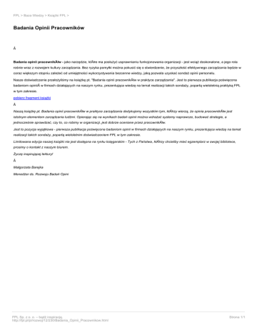 FPL > Baza Wiedzy > Książki FPL > Badania Opinii Pracowników  Badania opinii pracownikĂłw - jako narzędzie, ktĂłre ma posłużyć usprawnianiu funkcjonowania organizacji - jest wciąż doskonalone, a jego rola rośnie wraz z rozwojem kultury zarządzania. Bez ryzyka pomyłki można pokusić się o stwierdzenie, że przyszłość efektywnego zarządzania będzie w coraz większym stopniu zależeć od umiejętności wykorzystywania bezcenne wiedzy, jaką pozwala uzyskać sondaż opinii personelu. Nasze doświadczenie przełożyliśmy na książkę pt. "Badania opinii pracownikĂłw w praktyce zarządzania". Jest to pierwsza publikacja poświęcona badaniom opinii w firmach działających na naszym rynku, prezentująca wiedzę na temat realizacji takich sondaży, popartą wieloletnią praktyką FPL w tym zakresie. pobierz fragment książki  Naszą książkę pt. Badania opinii pracownikĂłw w praktyce zarządzania dedykujemy wszystkim tym, ktĂłrzy wierzą, że opinia pracownikĂłw jest istotnym elementem zarządzania ludźmi. Opierając się na wynikach badań opinii można wdrażać systemy naprawcze, budować strategie, a jednocześnie sprawdzać, czy to, co robimy w organizacji, jest dobrze oceniane przez pracownikĂłw. Jest to pozycja wyjątkowa - pierwsza publikacja poświęcona badaniom opinii w firmach działających na naszym rynku, prezentująca wiedzę na temat realizacji takich sondaży, popartą wieloletnim doświadczeniem FPL w tym zakresie. Limitowana edycja naszej książki nie jest dostępna na rynku księgarskim - Tych z Państwa, ktĂłrzy chcieliby mieć egzemplarz w swojej bibliotece, prosimy o kontakt z naszym biurem. Życzę inspirującej lektury!  Małgorzata Barejka Menedżer ds. Rozwoju Badań Opini FPL Sp. z o. o. – bądź inspiracją. http://fpl.pl/pl/rozwoj/12/230/Badania_Opinii_Pracownikow.html Strona 1/1
