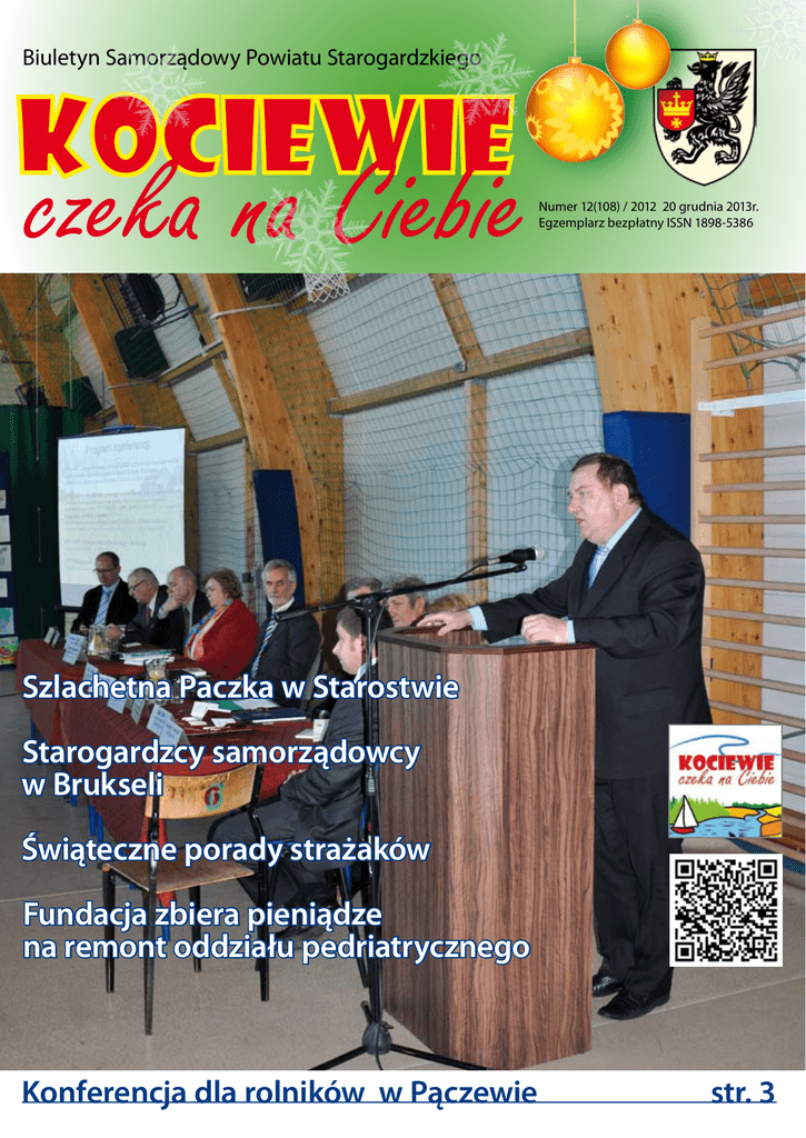 Biuletyn Samorządowy Powiatu Starogardzkiego Numer 12(108) / 2012 20 grudnia 2013r. Egzemplarz bezpłatny ISSN 1898-5386 Szlachetna Paczka w Starostwie Starogardzcy samorządowcy w Brukseli Świąteczne porady strażaków Fundacja zbiera pieniądze na remont oddziału pedriatrycznego Konferencja dla rolników w Pączewie str. 3 Edukacja 20 grudnia 2013r. Stypendia Marszałka Województwa dla uczniów szczególnie uzdolnionych decznie wszystkim uczniom i nauczycielom gratulujemy, a dyrekcji życzymy tak znakomitych wyników szkoły w następnych latach. Jesteśmy z Was dumni i życzymy wielu dalszych sukcesów w realizacji Indywidualnych Planów Edukacyjnych. Uroczystość wręczenia stypendiów najlepszym uczniom Powiatu Starogardzkiego. Stypendyści I LO: Adrianna Bunikowska, Katarzyna Ciemińska, Weronika Ciemińska, Agnieszka Dorawa, Klaudia Drawska, Angelika Fiałek, Daria Filipska, Angelika Głogowska, Natalia Goldszmit, Ewelina Jaszczerska, Miriam Jendernalik, Weronika Kiedrowska, Julia Kliczkowska, Weronika Miętka, Agnieszka Miszewska, Rafał Opacki, Natalia Ossowska, Daniela Pawłowska, Agata Rezmer, Sylwia Stosik, Michalina Zimnak, Agnieszka Żurawska, Tomasz Żyjewski. W dniu 11 grudnia 2013 r. w gmachu Polskiej Filharmonii Bałtyckiej im. Fryderyka Chopina w Gdańsku, odbyła się uroczysta gala wręczenia Stypendiów Marszałka Województwa Pomorskiego uczniom szczególnie uzdolnionym z obszaru województwa pomorskiego. Spośród 400 nagrodzonych w naszym województwie uczniów szkół podstawowych, gimnazjalnych i ponadgimnazjalnych, dwudziestu trzech to uczniowie I Liceum Ogólnokształcącego w Starogardzie Gdańskim. Jest to niewątpliwy sukces starogardzkiego czerwonego ogólniaka i potwierdzenie niekwestionowanego prymatu tej placówki w rankingu wyników nauczania szkół średnich naszego powiatu i całego województwa. Z grupy stypendystów, szczególną nagrodą wyróżniono dwoje uczniów I LO w Starogardzie Gdańskim. Mowa o Dominice Zieman uczennicy klasy III oraz Adrianie Gumińskim, tegorocznym absolwencie, a dzisiaj studencie Politechniki Gdańskiej wydziału nanotechnologii. Podczas uroczystej gali głos zabrała dyrektor I LO w Starogardzie Gdańskim - Wiesława Górska, która nie kryła zadowolenia i dumy z sukcesu swoich uczniów i nauczycieli, osiągając najlepszy wynik w województwie – największą liczbę stypendystów Marszałka Województwa Pomorskiego. W swoim wystąpieniu Wiesława Górska zaprezentowała liczne sukcesy I LO oraz przedstawiła karierę stypendystów I LO. SerEgzemplarz bezpłatny, nakład 3000 egz., ISSN 1898-5386 Wydawca: Zakład Obsługi Starostwa Powiatowego w Starogardzie Gdańskim ul. Mickiewicza 9, 83-200 Starogard Gdański Redaktor naczelny: Tomasz Wiczyński. Redakcja: Wiesław Warchoł, Krzysztof Powierza, Stefan Galiński. Kontakt z Redakcją: [email protected], tel. 58-767-36-00 Redakcja zastrzega sobie prawo do skracania i redagowania otrzymanych tekstów. Druk: TOP DRUK - Łomża Na okładce: Konferencja dla rolników Powiatu Starogardzkiego w Pączewie. 2 Biuletyn Samorządowy Powiatu Starogardzkiego Red. 20 grudnia 2013r. Rolnictwo Konferencja dla rolników Powiatu Starogardzkiego w Pączewie zaproszono m.in. Senatora RP Andrzeja Grzyba, który przedstawił zebranym obecny stan prac nad zmianą ustaw o podatku dochodowym od osób fizycznych oraz o swobodzie działalności gospodarczej, w kontekście sprzedaży przez rolników przetworzonych produktów rolnych, w formie tzw. sprzedaży bezpośredniej. Chodzi tu m.in. o możliwość legalnej i uregulowanej sprzedaży regionalnych wyrobów spożywczych przez koła gospodyń wiejskich, kwatery agroturystyczne, czy poszczególnych rolników. O Funduszu Sołeckim, jako szansie na rozwój wsi referował Senator RP i Prezes Krajowego Stowarzyszenia Sołtysów Ireneusz Niewiarowski. W swoim wystąpieniu senator zaprezentował szereg ciekawych przykładów inicjatyw Na konferencję zostali zaproszeni wszyscy sołtysi z terenu Powiatu Starospołecznych i projektów, zmieniających obligardzkiego. cze polskiej wsi. Natomiast dr Daniel Roszak z Kończący się 2013 r. zamyka okres dofinansowania z funduszy unijnych, Pomorskiego Oddziału Doradztwa Rolniczego jakie Polska otrzymała w latach 2007 – 2013. Obecnie trwają jeszcze szcze- w Gdańsku przedstawił istotę i najważniejsze gółowe negocjacje w sprawie kolejnego etapu wsparcia polskiej gospo- zmiany w zasadach dofinansowania z funduszy darki przez Unię Europejską na lata 2014 - 2020, jednak już dzisiaj rolnicy z unijnych w ramach Programu Rozwoju Obszapowiatu starogardzkiego zastanawiają się jak przygotować się do absorp- rów Wiejskich na lata 2014 – 2020, w którym cji tych środków, aby wykorzystać tę pomoc dla rozwoju obszarów wiej- ocenił szanse, zagrożenia i perspektywy dla skich. W tym celu, z inicjatywy Wicestarosty Starogardzkiego Kazimierza naszych rolników, którzy będą beneficjentami Chyły w dniu 9 grudnia 2013 r. w sali sportowo - widowiskowej Zespołu tego programu. Dotychczasowe osiągnięcia w Szkół Publicznych w Pączewie zorganizowano konferencję dla sołtysów, pozyskiwaniu funduszy unijnych na rozwój obwiejskich liderów i rolników z terenu powiatu starogardzkiego pn. „Ob- szarów wiejskich zaprezentował Marian Furgon szary Wiejskie Powiatu Starogardzkiego – Perspektywy Rozwoju” …”W – Prezes Stowarzyszenia Lokalna Grupa Działamojej ocenie było to bardzo ważne i potrzebne spotkanie środowisk wiejskich nia „Chata Kociewia”. Swoje doświadczenia zanaszego powiatu. Na prezentowała również konferencję zaprosiliAlina Jeleń – Prezes śmy wszystkich sołtyStowarzyszenia Kosów z terenu gmin pobiety Kwiaty Kociewia, wiatu starogardzkiego. którego działalność O potrzebie jej orgajest znakomitym przynizacji świadczyła frekładem aktywizacji wsi kwencja, która przeszła powiatu starogardznasze najśmielsze oczekiego. Miłym akcenkiwania. Jest to z