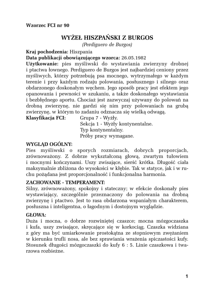 Wzorzec FCI nr 90 WYŻEŁ HISZPAŃSKI Z BURGOS (Perdiguero de Burgos) Kraj pochodzenia: Hiszpania Data publikacji obowiązującego wzorca: 26.05.1982 Użytkowanie: pies myśliwski do wystawiania zwierzyny drobnej i ptactwa łownego. Perdiguero de Burgos jest najbardziej ceniony przez myśliwych, którzy potrzebują psa mocnego, wytrzymałego w każdym terenie i przy każdym rodzaju polowania, posłusznego i silnego oraz obdarzonego doskonałym węchem. Jego sposób pracy jest efektem jego opanowania i pewności w szukaniu, a także doskonałego wystawiania i bezbłędnego aportu. Chociaż jest zazwyczaj używany do polowań na drobną zwierzynę, nie gardzi się nim przy polowaniach na grubą zwierzynę, w którym to zadaniu odznacza się wielką odwagą. Klasyfikacja FCI: Grupa 7 - Wyżły. Sekcja 1 - Wyżły kontynentalne. Typ kontynentalny. Próby pracy wymagane. WYGLĄD OGÓLNY: Pies myśliwski o sporych rozmiarach, dobrych proporcjach, zrównoważony. Z dobrze wykształconą głową, zwartym tułowiem i mocnymi kończynami. Uszy zwisające, sierść krótka. Długość ciała maksymalnie zbliżona do wysokości w kłębie. Tak w statyce, jak i w ruchu pożądana jest proporcjonalność i funkcjonalna harmonia. ZACHOWANIE - TEMPERAMENT: Silny, zrównoważony, spokojny i stateczny; w efekcie doskonały pies wystawiający, szczególnie przeznaczony do polowania na drobną zwierzynę i ptactwo. Jest to rasa obdarzona wspaniałym charakterem, posłuszna i inteligentna, o łagodnym i dostojnym wyglądzie. GŁOWA: Duża i mocna, o dobrze rozwiniętej czaszce; mocna mózgoczaszka i kufa, uszy zwisające, skręcające się w korkociąg. Czaszka widziana z góry ma być umiarkowanie prostokątna ze stopniowym zwężaniem w kierunku trufli nosa, ale bez sprawiania wrażenia spiczastości kufy. Stosunek długości mózgoczaszki do kufy 6 : 5. Linie czaszkowa i twarzowa rozbieżne. 1 Mózgoczaszka: Czaszka: szeroka, mocna, wysklepiona i z profilu wypukła; dobrze zaznaczona bruzda między oczami, guz potyliczny mało wyrazisty. Kości jarzmowe wyraziste. Przełom czołowo-nosowy (stop): łagodny, słabo zaznaczony. Trzewioczaszka: Nos: ciemnobrązowy, wilgotny, duży i szeroki, o dobrze rozwartych nozdrzach. Kufa: z profilu prosta lub bardzo nieznacznie wypukła w kierunku nosa. Pojemna na całej swej długości, nie ma sprawiać wrażenia spiczastej. Grzbiet nosa szeroki. Fafle: zwisające, ale nie obwisłe. Górna warga powinna dobrze nachodzić na dolną. Dolna warga tworzy wyraźny kącik wargowy. Błony śluzowe brązowe. Uzębienie: zęby mocne, białe i zdrowe; zgryz nożycowy. Obecne wszystkie zęby przedtrzonowe. Oczy: średniej wielkości, o migdałowatym kształcie, w kolorze ciemnego orzecha laskowego, o łagodnym i szlachetnym wyrazie, w pewnych okolicznościach sprawiające wrażenie smutnych. Skóra powiek średnio gruba, o tym samym brązowym pigmencie, co błony śluzowe. Dolna powieka powinna maksymalnie przylegać do gałki ocznej. Uszy: duże, zwisające, w kształcie trójkąta. Osadzone na wysokości linii oczu, w spoczynku opadają z wdziękiem lekko zwinięte. Bez naciągania powinny sięgać do kącika warg i nie powinny sięgać do nosa. W dotyku delikatne i miękkie, skóra i włos delikatny, z wyraźną siecią naczyń krwionośnych. Podniebienie: błona śluzowa różowa, o dobrze zaznaczonych bruzdach. SZYJA: Mocna i silna; szeroka przy głowie, lekko rozszerzająca się w kierunku tułowia. Górna linia lekko łukowata. Linia dolna z dobrze zaznaczonym podgardlem, zaczynającym się przy kącikach warg, ale niezbyt obfitym. TUŁÓW: Kwadratowy, mocny i krzepki, o potężnej klatce piersiowej i żebrach, sprawiający wrażenie siły i żywotności. Kłąb: dobrze zaznaczony. Linia górna: prosta i pozioma lub o pożądanym lekkim spadku od kłębu. Nigdy łękowata; stabilna w ruchu. Grzbiet: silny i umięśniony. 2 Część lędźwiowa: średniej długości, szeroka i muskularna, sprawiająca wrażenie siły. Zad: szeroki i mocny. Kąt nachylenia zadu powinien być mniejszy niż 45 stopni w stosunku do linii grzbietu lub do podłoża. Wysokość zadu równa lub mniejsza niż wysokość psa w kłębie. Klatka piersiowa: szeroka i głęboka, sięga do poziomu łokcia; muskularna i silna. Mostek zaznaczony. Żebra dobrze rozwinięte. Zaokrąglone, nie płaskie. Przestrzenie międzyżebrowe dobrze zaznaczone, rozszerzające się w miarę posuwania się do żeber wolnych. Obwód klatki piersiowej powinien być równy wysokości w kłębie plus 1/4. Brzuch i boki: brzuch umiarkowanie podkasany. Boki głębokie i dobrze zaznaczone. OGON: Gruby u nasady i osadzony na średniej wysokości. Kopiowany w odległości pomiędzy 1/3, a 1/2 swojej długości. KOŃCZYNY: Kończyny przednie: idealnie pionowe, proste i równoległe o mocnym kośćcu, o krótkim śródręczu i dobrze rozwiniętych palcach. Łopatki: umiarkowanie ukośne, muskularne. Łopatka musi mieć mniej więcej tę samą długość, co ramię. Ramię: silne i dobrze umięśnione, jego długość powinna wynosić ok. 2/3 długości przedramienia. Łokcie: przylegające do tułowia. Przedramię: o mocnym kośćcu i wyraźnych ścięgnach. Proste i prostopadłe. Jego długość równa się podwójnej długości od nadgarstka do ziemi. Śródręcze: widziane z boku trochę nachylone, jest praktycznie przedłużeniem przedramienia. O mocnym kośćcu. Łapy przednie: kocie, palce zwarte, silne i dobrze wysklepione. Pazury ciemne. Opuszki twarde, bardzo szerokie i odporne. Błona międzypalcowa umiarkowana. Kątowania: kąt łopatka-ramię - bliski 1000 kąt ramię-przedramię - bliski 1250 Kończyny tylne: silne i umięśnione o mocnym kośćcu, równoległe, o właściwym kątowaniu, pięta dobrze zaznaczona i kątowana, sprawiające wrażenie siły i solidności. Udo: bardzo mocne i o dobrze widocznej muskulaturze. Długość uda to 3/4 długości podudzia. 3 Podudzie: długie i o mocnym kośćcu, o długości równ