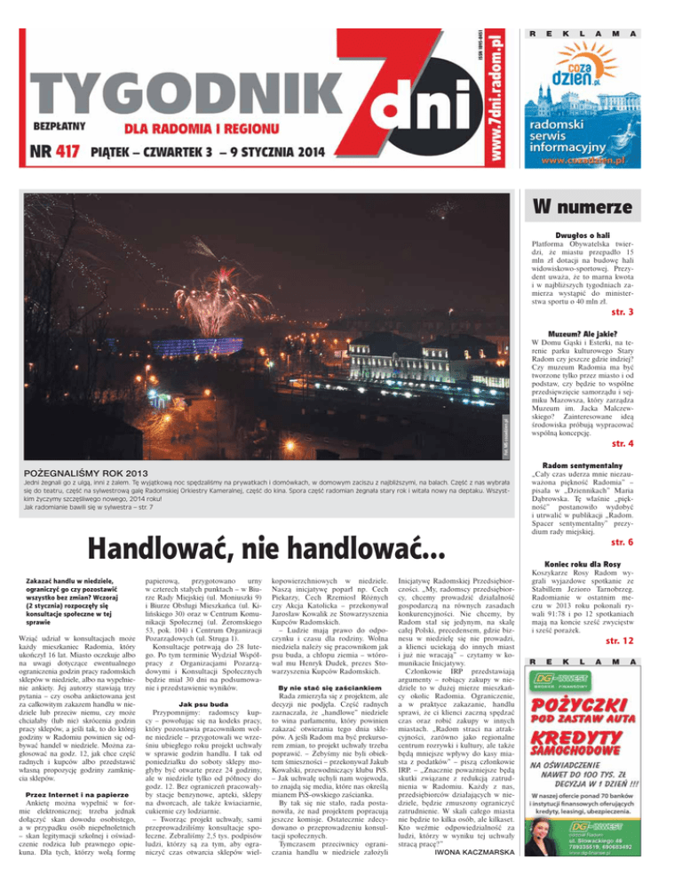 R E K L A M A W numerze Dwugłos o hali Platforma Obywatelska twierdzi, że miastu przepadło 15 mln zł dotacji na budowę hali widowiskowo-sportowej. Prezydent uważa, że to marna kwota i w najbliższych tygodniach zamierza wystąpić do ministerstwa sportu o 40 mln zł. str. 3 Fot. MS cozadzien.pl Muzeum? Ale jakie? W Domu Gąski i Esterki, na terenie parku kulturowego Stary Radom czy jeszcze gdzie indziej? Czy muzeum Radomia ma być tworzone tylko przez miasto i od podstaw, czy będzie to wspólne przedsięwzięcie samorządu i sejmiku Mazowsza, który zarządza Muzeum im. Jacka Malczewskiego? Zainteresowane ideą środowiska próbują wypracować wspólną koncepcję. str. 4 Radom sentymentalny POŻEGNALIŚMY ROK 2013 Jedni żegnali go z ulgą, inni z żalem. Tę wyjątkową noc spędzaliśmy na prywatkach i domówkach, w domowym zaciszu z najbliższymi, na balach. Część z nas wybrała się do teatru, część na sylwestrową galę Radomskiej Orkiestry Kameralnej, część do kina. Spora część radomian żegnała stary rok i witała nowy na deptaku. Wszystkim życzymy szczęśliwego nowego, 2014 roku! Jak radomianie bawili się w sylwestra – str. 7 „Cały czas uderza mnie niezauważona piękność Radomia” – pisała w „Dziennikach” Maria Dąbrowska. Tę właśnie „piękność” postanowiło wydobyć i utrwalić w publikacji „Radom. Spacer sentymentalny” prezydium rady miejskiej. Handlować, nie handlować... Zakazać handlu w niedziele, ograniczyć go czy pozostawić wszystko bez zmian? Wczoraj (2 stycznia) rozpoczęły się konsultacje społeczne w tej sprawie Wziąć udział w konsultacjach może każdy mieszkaniec Radomia, który ukończył 16 lat. Miasto oczekuje albo na uwagi dotyczące ewentualnego ograniczenia godzin pracy radomskich sklepów w niedziele, albo na wypełnienie ankiety. Jej autorzy stawiają trzy pytania – czy osoba ankietowana jest za całkowitym zakazem handlu w niedziele lub przeciw niemu, czy może chciałaby (lub nie) skrócenia godzin pracy sklepów, a jeśli tak, to do której godziny w Radomiu powinien się odbywać handel w niedziele. Można zagłosować na godz. 12, jak chce część radnych i kupców albo przedstawić własną propozycję godziny zamknięcia sklepów. Przez Internet i na papierze Ankietę można wypełnić w formie elektronicznej; trzeba jednak dołączyć skan dowodu osobistego, a w przypadku osób niepełnoletnich – skan legitymacji szkolnej i oświadczenie rodzica lub prawnego opiekuna. Dla tych, którzy wolą formę papierową, przygotowano urny w czterech stałych punktach – w Biurze Rady Miejskiej (ul. Moniuszki 9) i Biurze Obsługi Mieszkańca (ul. Kilińskiego 30) oraz w Centrum Komunikacji Społecznej (ul. Żeromskiego 53, pok. 104) i Centrum Organizacji Pozarządowych (ul. Struga 1). Konsultacje potrwają do 28 lutego. Po tym terminie Wydział Współpracy z Organizacjami Pozarządowymi i Konsultacji Społecznych będzie miał 30 dni na podsumowanie i przedstawienie wyników. Jak psu buda Przypomnijmy: radomscy kupcy – powołując się na kodeks pracy, który pozostawia pracownikom wolne niedziele – przygotowali we wrześniu ubiegłego roku projekt uchwały w sprawie godzin handlu. I tak od poniedziałku do soboty sklepy mogłyby być otwarte przez 24 godziny, ale w niedziele tylko od północy do godz. 12. Bez ograniczeń pracowałyby stacje benzynowe, apteki, sklepy na dworcach, ale także kwiaciarnie, cukiernie czy lodziarnie. – Tworząc projekt uchwały, sami przeprowadziliśmy konsultacje społeczne. Zebraliśmy 2,5 tys. podpisów ludzi, którzy są za tym, aby ograniczyć czas otwarcia sklepów wiel- kopowierzchniowych w niedziele. Naszą inicjatywę poparł np. Cech Piekarzy, Cech Rzemiosł Różnych czy Akcja Katolicka – przekonywał Jarosław Kowalik ze Stowarzyszenia Kupców Radomskich. – Ludzie mają prawo do odpoczynku i czasu dla rodziny. Wolna niedziela należy się pracownikom jak psu buda, a chłopu ziemia – wtórował mu Henryk Dudek, prezes Stowarzyszenia Kupców Radomskich. By nie stać się zaściankiem Rada zmierzyła się z projektem, ale decyzji nie podjęła. Część radnych zaznaczała, że „handlowe” niedziele to wina parlamentu, który powinien zakazać otwierania tego dnia sklepów. A jeśli Radom ma być prekursorem zmian, to projekt uchwały trzeba poprawić. – Żebyśmy nie byli obiektem śmieszności – przekonywał Jakub Kowalski, przewodniczący klubu PiS. – Jak uchwałę uchyli nam wojewoda, to znajdą się media, które nas określą mianem PiS-owskiego zaścianka. By tak się nie stało, rada postanowiła, że nad projektem popracują jeszcze komisje. Ostatecznie zdecydowano o przeprowadzeniu konsultacji społecznych. Tymczasem przeciwnicy ograniczania handlu w niedziele założyli Inicjatywę Radomskiej Przedsiębiorczości. „My, radomscy przedsiębiorcy, chcemy prowadzić działalność gospodarczą na równych zasadach konkurencyjności. Nie chcemy, by Radom stał się jedynym, na skalę całej Polski, precedensem, gdzie biznesu w niedzielę się nie prowadzi, a klienci uciekają do innych miast i już nie wracają” – czytamy w komunikacie Inicjatywy. Członkowie IRP przedstawiają argumenty – robiący zakupy w niedziele to w dużej mierze mieszkańcy okolic Radomia. Ograniczenie, a w praktyce zakazanie, handlu sprawi, że ci klienci zaczną spędzać czas oraz robić zakupy w innych miastach. „Radom straci na atrakcyjności, zarówno jako regionalne centrum rozrywki i kultury, ale także będą mniejsze wpływy do kasy miasta z podatków” – piszą członkowie IRP. – „Znacznie poważniejsze będą skutki związane z redukcją zatrudnienia w Radomiu. Każdy z nas, przedsiębiorców działających w niedziele, będzie zmuszony ograniczyć zatrudnienie. W skali całego miasta nie będzie to kilka osób, ale kilkaset. Kto weźmie odpowiedzialność za ludzi, którzy w wyniku tej uchwały stracą pracę?” IWONA KACZMA