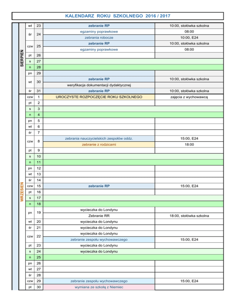WRZESIEŃ SIERPIEŃ KALENDARZ ROKU SZKOLNEGO 2016 / 2017 wt 23 śr 24 czw 25 pt 26 s 27 n 28 pn 29 wt 30 zebranie RP 10:00, stołówka szkolna egzaminy poprawkowe 08:00 zebrania robocze 10:00, E24 zebranie RP 10:00, stołówka szkolna egzaminy poprawkowe 08:00 zebranie RP 10:00, stołówka szkolna weryfikacja dokumentacji dydaktycznej śr 31 zebranie RP 10:00, stołówka szkolna czw 1 UROCZYSTE ROZPOCZĘCIE ROKU SZKOLNEGO zajęcia z wychowawcą pt 2 s 3 n 4 pn 5 wt 6 śr 7 czw 8 zebrania nauczycielskich zespołów oddz. 15:00, E24 zebranie z rodzicami 18:00 zebranie RP 15:00, E24 pt 9 s 10 n 11 pn 12 wt 13 śr 14 czw 15 pt 16 s 17 n 18 pn 19 wycieczka do Londynu Zebranie RR wt 20 wycieczka do Londynu śr 21 wycieczka do Londynu czw 22 18:00, stołówka szkolna wycieczka do Londynu zebranie zespołu wychowawczego pt 23 wycieczka do Londynu s 24 wycieczka do Londynu n 25 pn 26 wt 27 śr 28 czw 29 zebranie zespołu wychowawczego pt 30 wymiana ze szkołą z Niemiec 15:00, E24 15:00, E24 PAŹDZIERNIK s 1 wymiana ze szkołą z Niemiec n 2 wymiana ze szkołą z Niemiec pn 3 wymiana ze szkołą z Niemiec wt 4 wymiana ze szkołą z Niemiec śr 5 wymiana ze szkołą z Niemiec czw 6 pt 7 s 8 n 9 pn 10 wt 11 śr 12 czw 13 pt 14 s 15 n 16 pn 17 wt 18 śr 19 czw 20 pt 21 s 22 n 23 pn 24 wt 25 śr 26 czw 27 pt 28 sob. 29 wymiana ze szkołą z Niemiec zebrania nauczycielskich zespołów oddz. wymiana ze szkołą z Niemiec zebranie zespołu wychowawczego 15:00, E24 Dzień Edukacji Narodowej zebranie zespołu wychowawczego 15:00, E24 zebranie zespołu wychowawczego 15:00, E24 niedz. 30 pon. 31 15:00, E24 dodatkowy dzień wolny od zajęć edukacyjnych LISTOPAD wt 1 śr 2 czw 3 pt 4 s 5 n 6 pn 7 wt 8 śr 9 czw 10 pt 11 s 12 n 13 pn 14 wt 15 śr 16 czw 17 pt 18 s 19 n 20 pn 21 wt 22 śr 23 czw 24 pt 25 s 26 n 27 pn 28 wt 29 śr 30 Wszystkich Świętych zebranie zespołu wychowawczego 15:00, E24 obchody Święta Niepodległości - uroczysty apel śródsemestralne zebrania nauczycielskich zespołów oddz. 15:00, E24 Narodowe Święto Niepodległości zebranie zespołu wychowawczego 15:00, E24 śródsemestralne zebranie z rodzicami 18:00 dzień otwarty dla rodziców 19:00 - 20:00 zebranie zespołu wychowawczego 15:00, E24 GRUDZIEŃ czw 1 pt 2 s 3 n 4 pn 5 wt 6 śr 7 czw 8 pt 9 s 10 n 11 pn 12 wt 13 śr 14 czw 15 pt 16 s 17 n 18 pn 19 wt 20 śr 21 czw 22 pt 23 s 24 n 25 pn 26 wt 27 śr 28 czw 29 pt 30 sob. 31 zebranie zespołu wychowawczego 15:00, E24 zebrania nauczycielskich zespołów oddz. 15:00, E24 zebranie zespołu wychowawczego 15:00, E24 Wigilia szkolna jasełka, wigilie klasowe ferie bożonarodzeniowe Boże Narodzenie ferie bożonarodzeniowe STYCZEŃ n 1 pn 2 wt 3 śr 4 czw 5 pt 6 s 7 n 8 pn 9 wt 10 śr 11 czw 12 pt 13 s 14 n 15 pn 16 wt 17 śr 18 czw 19 pt 20 s 21 n 22 pn 23 wt 24 śr 25 czw 26 pt 27 s 28 n 29 pon. 30 wt. 31 Nowy Rok zebrania nauczycielskich zespołów oddz. dzień otwarty dla rodziców 15:00, E24, zagrożenia ocen. ndst 18:00 - 20:00 Objawienie Pańskie zebranie zespołu wychowawczego 15:00, E24 zebranie zespołu wychowawczego 15:00, E24 przewidywane oceny klasyfikacyjne zebranie zespołu wychowawczego 15:00, E24 śr 1 czw 2 pt 3 s 4 n 5 pn 6 wt 7 śr 8 zebrania nauczycielskich zespołów oddz. 15:00, E24 sprawozdania zespołów, specjalistów itp czw LUTY pt 9 10 s 11 n 12 pn 13 wt 14 śr 15 czw 16 pt 17 s 18 n 19 pn 20 wt 21 śr 22 czw 23 pt 24 s 25 n 26 pn 27 wt 28 zebranie klasyfikacyjne RP 15:00, E24 zebranie z rodzicami 18:00 KONIEC I SEMESTRU ferie zimowe ferie zimowe MARZEC śr 1 czw 2 pt 3 s 4 n 5 pn 6 wt 7 śr 8 czw 9 pt 10 s 11 n 12 pn 13 wt 14 śr 15 czw 16 pt 17 s 18 n 19 pn 20 wt 21 śr 22 czw 23 pt 24 s 25 n 26 pn 27 wt 28 śr 29 czw 30 pt 31 zebranie podsumowujące RP 15:00, E24 zebranie zespołu wychowawczego 15:00, E24 zebranie zespołu wychowawczego 15:00, E24 zebranie zespołu wychowawczego 15:00, E24 zebranie zespołu wychowawczego 15:00, E24 KWIECIEŃ s 1 n 2 pn 3 wt 4 śr 5 czw 6 pt 7 s 8 n 9 pn 10 wt 11 śr 12 czw 13 pt 14 s 15 n 16 pn 17 wt 18 śródsemestralne zebrania nauczycielskich zespołów oddz. 15:00, E24 zebranie z rodzicami 18:00 ferie wielkanocne Wielkanoc ferie wielkanocne egzamin gimnazjalny - część humanistyczna śr 19 z zakresu historii i wiedzy o społeczeństwie 09:00 z zakresu języka polskiego 11:00 wyjazdy klas I i II egzamin gimnazjalny - część matematyczno-przyrodnicza czw 20 z zakresu przedmiotów przyrodniczych 09:00 z zakresu matematyki 11:00 wyjazdy klas I i II egzamin gimnazjalny - język obcy nowożytny pt 21 na poziomie podstawowym 09:00 na poziomie rozszerzonym 11:00 wyjazdy klas I i II s 22 n 23 pn 24 wt 25 śr 26 czw 27 pt 28 s 29 n 30 zebranie RP 15:00, E24 MAJ pn 1 Święto Pracy wt 2 Dzień Flagi Rzeczypospolitej Polskiej / dodatkowy dzień wolny od zajęć edukacyjnych śr 3 Święto Narodowe Trzeciego Maja czw 4 pt 5 s 6 n 7 pn 8 wt 9 śr 10 czw 11 pt 12 s 13 n 14 pn 15 wt 16 śr 17 zebranie zespołu wychowawczego 15:00, E24 wymiana ze szkołą z Niemiec wymiana ze szkołą z Niemiec czw 18 zebranie zespołu wychowawczego dzień otwarty dla rodziców pt 19 wymiana ze szkołą z Niemiec s 20 wymiana ze szkołą z Niemiec n 21 wymiana ze szkołą z Niemiec pn 22 wymiana ze szkołą z Niemiec wt 23 wymiana ze szkołą z Niemiec śr 24 wymiana ze szkołą z Niemiec czw 25 pt 26 s 27 n 28 pn 29 wt 30 śr 31 15:00, E24, zagrożenia ocen. ndst 18:00 - 20:00 wymiana ze szkołą z Niemiec zebranie zespołu wychowawczego Msza św. na Miejscu Straceń w Magdalence 15:00, E24 CZERWIEC zebrania nauczycielskich zespołów oddz. czw 1 15:00, E24 pt 2 s 3 n 4 pn 5 wt 6 śr 7 czw 8 pt 9 s 10 n 11 pn 12 wt 13 śr 14 czw 15 Boże Ciało pt 16 dodatkowy dzień wolny od zajęć edukacyjnych s 17 n 18 pn 19 wt 20 śr 21 czw 22 pt 23 s 24 n 25 pn 26 wt 27 śr 28 czw 29 pt 30 przewidywane oceny klasyfikacyjne zebranie zespołu wychowawczego 15:00, E24 Informacja o ustalonych ocenach klasyfikacyjnych 15:00, E24 zebranie klasyfikacyjne RP UROC