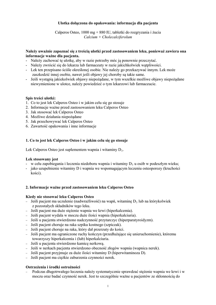 Ulotka dołączona do opakowania: informacja dla pacjenta Calperos Osteo, 1000 mg + 880 IU, tabletki do rozgryzania i żucia Calcium + Cholecalciferolum Należy uważnie zapoznać się z treścią ulotki przed zastosowaniem leku, ponieważ zawiera ona informacje ważne dla pacjenta. - Należy zachować tę ulotkę, aby w razie potrzeby móc ją ponownie przeczytać. - Należy zwrócić się do lekarza lub farmaceuty w razie jakichkolwiek wątpliwości. - Lek ten przepisano ściśle określonej osobie. Nie należy go przekazywać innym. Lek może zaszkodzić innej osobie, nawet jeśli objawy jej choroby są takie same. - Jeśli wystąpią jakiekolwiek objawy niepożądane, w tym wszelkie możliwe objawy niepożądane niewymienione w ulotce, należy powiedzieć o tym lekarzowi lub farmaceucie. Spis treści ulotki: 1. Co to jest lek Calperos Osteo i w jakim celu się go stosuje 2. Informacje ważne przed zastosowaniem leku Calperos Osteo 3. Jak stosować lek Calperos Osteo 4. Możliwe działania niepożądane 5. Jak przechowywać lek Calperos Osteo 6. Zawartość opakowania i inne informacje 1. Co to jest lek Calperos Osteo i w jakim celu się go stosuje Lek Calperos Osteo jest suplementem wapnia i witaminy D 3 . Lek stosowany jest - w celu zapobiegania i leczenia niedoboru wapnia i witaminy D 3 u osób w podeszłym wieku; - jako uzupełnienie witaminy D i wapnia we wspomagającym leczeniu osteoporozy (kruchości kości). 2. Informacje ważne przed zastosowaniem leku Calperos Osteo Kiedy nie stosować leku Calperos Osteo − Jeśli pacjent ma uczulenie (nadwrażliwość) na wapń, witaminę D 3 lub na którykolwiek z pozostałych składników tego leku. − Jeśli pacjent ma duże stężenie wapnia we krwi (hiperkalcemia). − Jeśli pacjent wydala w moczu duże ilości wapnia (hiperkalciuria). − Jeśli u pacjenta stwierdzono nadczynność przytarczyc (hiperparatyroidyzm). − Jeśli pacjent choruje na raka szpiku kostnego (szpiczak). − Jeśli pacjent choruje na raka, który dał przerzuty do kości. − Jeśli pacjent ma ograniczone ruchy kończyn (przedłużające się unieruchomienie), któremu towarzyszy hiperkalcemia i (lub) hiperkalciuria. − Jeśli u pacjenta stwierdzono kamicę nerkową. − Jeśli w nerkach pacjenta stwierdzono obecność złogów wapnia (wapnica nerek). − Jeśli pacjent przyjmuje za duże ilości witaminy D (hiperwitaminoza D). − Jeśli pacjent ma ciężkie zaburzenia czynności nerek. Ostrzeżenia i środki ostrożności Podczas długotrwałego leczenia należy systematycznie sprawdzać stężenie wapnia we krwi i w moczu oraz badać czynność nerek. Jest to szczególnie ważne u pacjentów ze skłonnością do − 1 − − − − − powstawania kamieni nerkowych. W zależności od wyników badań lekarz może zmniejszyć dawkę leku lub przerwać leczenie. Jeśli pacjent przyjmuje jednocześnie glikozydy naparstnicy lub tiazydowe leki moczopędne z powodu problemów z sercem, należy systematycznie sprawdzać stężenie wapnia we krwi i w moczu oraz badać czynność nerek. W zależności od wyników badań lekarz może zmniejszyć dawkę leku lub przerwać leczenie. Lek Calperos Osteo należy stosować ze szczególną ostrożnością u pacjentów z zaburzeniami czynności nerek. Należy sprawdzać stężenie wapnia we krwi i w moczu. Pacjenci z ciężkimi zaburzeniami czynności nerek powinni przyjmować witaminę D w innej postaci niż cholekalcyferol. Dodatkowe preparaty wapnia i witaminy D należy przyjmować pod ścisłą kontrolą lekarza. Lekarz zaleci częste kontrolowanie stężenia wapnia we krwi i w moczu. Lek Calperos Osteo należy stosować ze szczególną ostrożnością u pacjentów z sarkoidozą (zaburzeniem układu odpornościowego, które może dotyczyć wątroby, płuc, skóry lub węzłów chłonnych). Istnieje ryzyko zbyt silnego działania leku, a w konsekwencji przedawkowania wapnia. Konieczne jest sprawdzanie stężenia wapnia we krwi i w moczu. Jeśli lek jest stosowany u unieruchomionego pacjenta z osteoporozą, należy zachować szczególną ostrożność. Możliwe jest zwiększenie stężenia wapnia we krwi. Lek Calperos Osteo nie jest przeznaczony do stosowania u dzieci i młodzieży. Inne leki i lek Calperos Osteo Należy powiedzieć lekarzowi lub farmaceucie o wszystkich lekach przyjmowanych obecnie lub ostatnio, w tym również o lekach dostępnych bez recepty. − − − − − − − − − − Jeśli pacjent jest jednocześnie leczony glikozydami naparstnicy, mogą wystąpić zaburzenia rytmu serca. Dlatego konieczne jest ścisłe monitorowanie stanu pacjenta, w tym badanie EKG i pomiar stężenia wapnia we krwi. Jeśli pacjent przyjmuje jednocześnie tiazydowe leki moczopędne, należy systematycznie sprawdzać stężenia wapnia we krwi, gdyż leki te zmniejszają wydalanie wapnia w moczu. Stosowanie leku Calperos Osteo może zmniejszyć wchłanianie i w ten sposób również skuteczność przyjmowanych jednocześnie niektórych antybiotyków (tzw. tetracyklin). Antybiotyk należy przyjmować co najmniej 2 godziny przed lub 4 do 6 godzin po przyjęciu leku Calperos Osteo. Również działanie innych leków, takich jak fluor (stosowany w celu wzmocnienia szkliwa zębów lub leczenia osteoporozy) oraz bisfosfoniany (stosowane w leczeniu osteoporozy), może się zmienić na skutek interakcji. Z tego powodu wymienione leki należy przyjmować co najmniej 3 godziny przed zażyciem leku Calperos Osteo Należy zachować możliwie najdłuższą przerwę między zażyciem leku Calperos Osteo a przyjęciem kolestyraminy (leku stosowanego w celu zmniejszenia podwyższonego stężenia cholesterolu) lub leków przeczyszczających (takich jak parafina ciekła) ze względu na możliwość zaburzonego wchłaniania witaminy D. Jednoczesne stosowanie leku Calperos Osteo i fenytoiny (stosowanej w leczeniu padaczki) lub barbituranów (leków nasennych) może spowodować osłabienie działania witaminy D. Jednoczesne stosowanie le