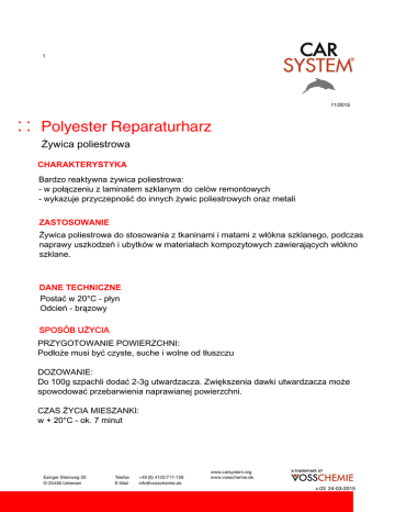 1 11/2015 Polyester Reparaturharz polyester repair resin Żywica poliestrowa CHARAKTERYSTYKA CHARACTERISTICS Polyester repair resin is a highly reactive polyester resin Bardzo reaktywna żywica poliestrowa: - w połączeniu z laminatem szklanym do celów remontowych Suitable as a glass fibredo laminate repair purposes oraz metali --wykazuje przyczepność innychfor żywic poliestrowych - Adhesion to other polyester resins - Adhesion to almost all metal bases ZASTOSOWANIE - Carsystem Fill should be used initially for better adhesion to metal bases. Żywica poliestrowa do stosowania z tkaninami i matami z włókna szklanego, podczas naprawy uszkodzeń i ubytków w materiałach kompozytowych zawierających włókno szklane. APPLICATION For repair purposes such as rust holes in metal bases e.g. car bodywork. For repair of plastic parts e.g. Bumpers, GRP components DANE TECHNICZNE Postać w 20°C - płyn Odcień - brązowy PRODUCT DATA SPOSÓB - Delivery UŻYCIA viscosity at 20°C: Liquid - Shade: brownish POWIERZCHNI: PRZYGOTOWANIE Podłoże musi być czyste, suche i wolne od tłuszczu DOZOWANIE: Do 100g szpachli dodać 2-3g utwardzacza. Zwiększenia dawki utwardzacza może HANDLING spowodować przebarwienia naprawianej powierzchni. BASE: CZAS ŻYCIA MIESZANKI: The base must be clean, dry and grease-free. Metal bases must wbe + first 20°Cof-all ok.coated 7 minut with the Carsystem Fill. TEMP. REAKCJI: DOSING: minimum 5°C APLIKOWANIE: za pomocą pędzla VOSSCHEMIE GMBH Telefon +49 (0) 4122/717 -0 Esinger Steinweg 50 D-25436 Uetersen Telefax E-Mail +49 (0) 4122/717-158 [email protected] www.carsystem.org www.vosschemie.de a trademark of v.03 24-03-2015 2 11/2015 TEMP. REAKCJI: minimum 5°C Addition of 2-3 % by weight hardener paste APLIKOWANIE: Overdosing of the hardener paste is to be avoided. Bleeding-through and colour za pomocą pędzla changes in the finishing coat might be the result. SUSZENIE: POT LIFE: zalecane suszenie w temperaturze pokojowej, około +20°C SCHNIĘCIE: w 20°C At +20°C room temperature, ca. 7 minutes SZLIFOWANIE: Jako warstwa wyrównująca: REACTION TEMPERATURE: Pierwsze szlifowanie - na sucho P80 - P120 Ponowne szlifowanie - na sucho P120 - 240 At least +5°C. Jako warstwa wypełniająca: Pierwsze szlifowanie - na sucho P120 - P180 APPLICATION: Ponowne szlifowanie - na sucho P180 - P240 With a brush TERMIN WAŻNOŚCI: 6 COVERAGE: - 8 miesięcy w temperaturze 18 - 20 ° C w zamkniętym oryginalnym opakowaniu 3 Xfibre glass mat weight or 1 X cloth weight INFORMACJE UZUPEŁNIAJĄCE DRYING TIME: Wyżej wymienione dane techniczne i informacje, szczególnie zalecenia dotyczące zastosowania i aplikacji naszych produktów oparte są na naszej aktualnej wiedzy przy Air drying at +20°C room temperature zastosowaniu produktu w warunkach normalnych. W praktyce, materiały, podłoże i warunki zewnętrzne są tak różne, dlatego niema gwarancji odnośnie osiągniętych rezultatów pracy. SANDING CHARACTERISTICS Użytkownik jest zobowiązany sprawdzić dopuszczalność rozwiązań w określonych warunkach. Powyższe informacje nie mogą stanowić podstawy do roszczeń. Producent ponosi Following drying times given. odpowiedzialność z tytułu niepełnych lub też niewłaściwych danych przedstawionych w swoich materiałach informacyjnych wyłącznie w przypadku rażącego zawinienia (działania As filling putty umyślnego lub rażącego niedbalstwa). First sanding - dry with P80 - P120 Re-sanding - dry with P120 - 240 VOSSCHEMIE GMBH Esinger Steinweg 50 D-25436 Uetersen Telefon Telefax E-Mail +49 (0) 4122/717 -0 +49 (0) 4122/717-158 [email protected] www.carsystem.org www.vosschemie.de a trademark of v.03 24-03-2015 3 11/2015 As fine putty First sanding - dry with P120 - P180 W tym przypadku, Użytkownik zobowiązany jest udokumentować, że poinformował Re-sanding - dry with P180 - P240 nas pisemnie o wszystkich nieprawidłowościach. Prawo patentowe osób trzecich, warunki sprzedaży i dostawy oraz zalecenia zawarte w kacie technicznej muszą być przestrzegane. REWORKING: Ważne informacje dotyczące bezpieczeństwa oraz wskazówki dotyczące usuwania odpadów znajdują się w karcie charakterystyk After processing, the resin (resin laminate) must be covered with a foil or putty mass so that the surface can harden without becoming sticky. The resin can be worked over with the following CS products: - Multi Soft, Elastic weiss or Elastic beige and Spray STORAGE: Ca. 6 - 8 months at 18 - 20° C in closed original container SAFETY ISSUES The before mentioned technical data and information, especially the recommendations for applying and using our products, are based on our current knowledge and experience when applied under normal conditions. In practice, the materials, surfaces or site conditions are so different that no warranty regarding the working results or liability, arising out of any relationship, can be inferred neither from this information nor from a verbal consultation, except we are charged with intent or gross negligence. In this case the user is obliged to prove that he has informed us about all points required for a proper and promising judgement in writing, in time and completely. Patent rights of any third party are to be observed. Furthermore, our general sales and delivery Terms and Conditions and the latest Technical Data Sheet, which should be demanded, apply. Directions for handling and waste disposal are in our Material Safety Data Sheet and the VOSSCHEMIE GMBH Esinger Steinweg 50 D-25436 Uetersen Telefon Telefax E-Mail +49 (0) 4122/717 -0 +49 (0) 4122/717-158 [email protected] www.carsystem.org www.vosschemie.de a trademark of v.03 24-03-2015 4 11/2015 specifications of the Employers Liability Insurance Association for the chemical industry. Copyright VOSSCHEMIE VOSSCHEMIE GMBH Esinger Steinweg 50 D-25436 Uetersen Telefon Telefax E-Mail +49 (0) 4122/717 -0 +49 (0) 4122/717-158 [email protected] www.carsystem.org www.vosschemie.de a trademark of v