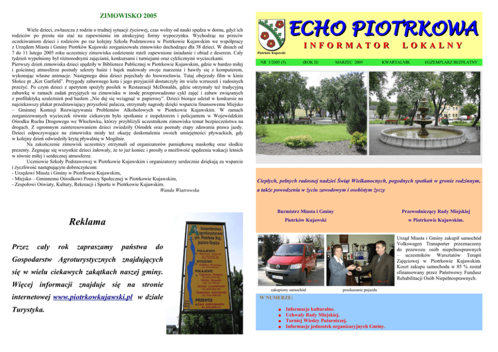 ZIMOWISKO 2005 Wiele dzieci, zwłaszcza z rodzin o trudnej sytuacji życiowej, czas wolny od nauki spędza w domu, gdyż ich rodziców po prostu nie stać na zapewnienie im atrakcyjnej formy wypoczynku. Wychodząc na przeciw oczekiwaniom dzieci i rodziców po raz kolejny Szkoła Podstawowa w Piotrkowie Kujawskim we współpracy z Urzędem Miasta i Gminy Piotrków Kujawski zorganizowała zimowisko dochodzące dla 38 dzieci. W dniach od 7 do 11 lutego 2005 roku uczestnicy zimowiska codziennie mieli zapewnione śniadanie i obiad z deserem. Cały tydzień wypełniony był różnorodnymi zajęciami, konkursami i turniejami oraz cyklicznymi wycieczkami. Pierwszy dzień zimowiska dzieci spędziły w Bibliotece Publicznej w Piotrkowie Kujawskim, gdzie w bardzo miłej i gościnnej atmosferze poznały sekrety baśni i bajek malowały swoje marzenia i bawiły się z komputerem, wykonując własne animacje. Następnego dnia dzieci pojechały do Inowrocławia. Tutaj obejrzały film w kinie Słońce pt „Kot Garfield”. Przygody zabawnego kota i jego przyjaciół dostarczyły im wielu wzruszeń i radosnych przeżyć. Po czym dzieci z apetytem spożyły posiłek w Restauracji McDonalds, gdzie otrzymały też tradycyjną zabawkę w ramach zadań przyjętych na zimowisku w środę przeprowadzono cykl zajęć i zabaw związanych z profilaktyką uzależnień pod hasłem „Nie daj się wciągnąć w papierosy”. Dzieci biorące udział w konkursie na najciekawszy plakat przedstawiający przyszłość palacza, otrzymały nagrody dzięki wsparciu finansowemu Miejsko – Gminnej Komisji Rozwiązywania Problemów Alkoholowych w Piotrkowie Kujawskim. W ramach zorganizowanych wycieczek równie ciekawym było spotkanie z inspektorem i policjantem w Wojewódzkim Ośrodku Ruchu Drogowego we Włocławku, którzy przybliżyli uczestnikom zimowiska temat bezpieczeństwa na drogach. Z ogromnym zainteresowaniem dzieci zwiedziły Ośrodek oraz poznały etapy zdawania prawa jazdy. Dzieci odpoczywające na zimowisku miały też okazję doskonalenia swoich umiejętności pływackich, gdy w kolejny dzień odwiedziły krytą pływalnię w Mogilnie. Na zakończenie zimowisk uczestnicy otrzymali od organizatorów pamiątkową maskotkę oraz słodkie prezenty. Żegnając się wszystkie dzieci żałowały, że to już koniec i prosiły o możliwość spędzenia wakacji letnich w równie miłej i serdecznej atmosferze. Uczniowie Szkoły Podstawowej w Piotrkowie Kujawskim i organizatorzy serdecznie dziękują za wsparcie i życzliwość następującym dobroczyńcom: - Urzędowi Miasta i Gminy w Piotrkowie Kujawskim, - Miejsko – Gminnemu Ośrodkowi Pomocy Społecznej w Piotrkowie Kujawskim, - Zespołowi Oświaty, Kultury, Rekreacji i Sportu w Piotrkowie Kujawskim. Wanda Wiatrowska ECHO PIOTRKOWA INFORMATOR Piotrków Kujawski NR 1/2005 (5) cały rok zapraszamy państwa (ROK II) MARZEC 2005 KWARTALNIK a także powodzenia w życiu zawodowym i osobistym życzy Burmistrz Miasta i Gminy Przewodniczący Rady Miejskiej Piotrków Kujawski w Piotrkowie Kujawskim. Urząd Miasta i Gminy zakupił samochód Volkswagen Transporter przeznaczony do przewozu osób niepełnosprawnych – uczestników Warsztatów Terapii Zajęciowej w Piotrkowie Kujawskim. Koszt zakupu samochodu w 85 % został sfinansowany przez Państwowy Fundusz Rehabilitacji Osób Niepełnosprawnych. do Gospodarstw Agroturystycznych znajdujących się w wielu ciekawych zakątkach naszej gminy. Więcej informacji znajduje się na stronie internetowej www.piotrkowkujawski.pl w dziale Turystyka. EGZEMPLARZ BEZPŁATNY Ciepłych, pełnych radosnej nadziei Świąt Wielkanocnych, pogodnych spotkań w gronie rodzinnym, Reklama Przez LOKALNY zakupiony samochód przekazanie pojazdu W NUMERZE: ● ● ● ● Informacje kulturalne. Uchwały Rady Miejskiej. Turniej Wiedzy Pożarniczej. Informacje jednostek organizacyjnych Gminy.