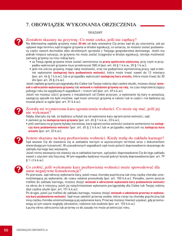 7. OBOWIĄZEK WYKONANIA ORZECZENIA SKAZANY Zostałem skazany na grzywnę. Co mnie czeka, jeśli nie zapłacę? Na dobrowolną zapłatę grzywny masz 30 dni od daty wezwania Cię przez sąd do jej uiszczenia, zaś po upływie tego terminu sąd ściągnie grzywnę w drodze egzekucji, co oznacza, że możesz zostać pozbawiony części swoich dochodów albo określonych sprzętów z Twojego gospodarstwa domowego. Jeżeli ma jednak miejsce sytuacja, że grzywna nie może zostać ściągnięta w drodze egzekucji, istnieje możliwość zamiany grzywny na inny rodzaj kary: •za Twoją zgodą grzywna może zostać zamieniona na pracę społecznie użyteczną, przy czym w przypadku wykroczeń grzywna musi przekraczać 500 zł (por. art. 45 § 1 k.k.w., 25 § 1 k.w.); •jeśli nie uiścisz grzywny, mając taką możliwość, oraz nie podejmiesz wymienionej pracy, sąd orzeknie wykonanie zastępczej kary pozbawienia wolności, która może trwać nawet do 12 miesięcy (por. art. 46 § 1 k.k.w.), lub w przypadku wykroczeń zastępczej kary aresztu, która może trwać do 30 dni (por. art. 25 § 2 k.w.). Jeżeli zapłata grzywny pociągnęłaby dla Ciebie lub Twojej rodziny zbyt ciężkie skutki, możesz złożyć wniosek o odroczenie wykonania grzywny lub wniosek o rozłożenie grzywny na raty, na czas nieprzekraczający jednego roku (w wyjątkowych wypadkach – trzech lat) (por. art. 49 k.k.w.). Jeżeli nie możesz uiścić grzywny z niezależnych od Ciebie przyczyn, a wykonanie tej kary w powyższy, zastępczy sposób nie było możliwe, sąd może umorzyć grzywnę w całości lub w części i nie będziesz jej musiał płacić w ogóle (por. art. 51 k.k.w.). Została mi wymierzona kara ograniczenia wolności. Co może się stać, jeśli jej nie wykonam? Gdyby zdarzyło się tak, że będziesz uchylał się od wykonania kary ograniczenia wolności, sąd: • z amieni ją na zastępczą karę grzywny (por. art. 65 § 1 k.k.w., 23 k.w.); • jeśli zamiana na grzywnę byłaby niecelowa, kara ograniczenia wolności zostanie zamieniona na zastępczą karę pozbawienia wolności (por. art. 65 § 2 k.k.w.) lub w przypadku wykroczeń na zastępczą karę aresztu (por. art. 23 k.w.). Jestem skazany na karę pozbawienia wolności. Kiedy trafię do zakładu karnego? Sąd wezwie Cię do stawienia się w zakładzie karnym w wyznaczonym terminie wraz z dokumentem stwierdzającym tożsamość. W uzasadnionych wypadkach sąd może polecić doprowadzenie skazanego do zakładu karnego bez wezwania. Jeżeli mimo wezwania nie stawisz się w zakładzie karnym, sąd poleci doprowadzenie Cię do tego zakładu nawet z użyciem siły fizycznej. W tym wypadku będziesz musiał pokryć koszty doprowadzenia (por. art. 79 § 1 i 2 k.k.w.). Co zrobić, jeśli wykonanie kary pozbawienia wolności może spowodować dla mnie negatywne konsekwencje? Po pierwsze, sąd odroczy wykonanie kary, jeżeli masz chorobę psychiczną lub inną ciężką chorobę uniemożliwiającą jej wykonanie, do czasu ustania przeszkody (por. art. 150 k.k.w.). Ponadto, zanim jeszcze trafiłeś do zakładu karnego, możesz złożyć wniosek o odroczenie wykonania kary pozbawienia wolności na okres do 6 miesięcy, jeżeli jej natychmiastowe wykonanie pociągnęłoby dla Ciebie lub Twojej rodziny zbyt ciężkie skutki (por. art. 151 k.k.w.). Po drugie, jeżeli już trafiłeś do zakładu karnego, możesz złożyć wniosek o udzielenie przerwy w wykonaniu kary pozbawienia wolności. Sąd musi udzielić przerwy osobie, która cierpi na chorobę psychiczną lub inną ciężką chorobę uniemożliwiającą jej wykonanie kary. Przerwę możesz również uzyskać, gdy przemawiają za tym ważne względy zdrowotne, rodzinne lub osobiste (por. art. 153 k.k.w.). Łączny okres odroczenia lub przerwy co do zasady nie może przekroczyć roku. 50 OBOWIĄZKI OBYWATELA