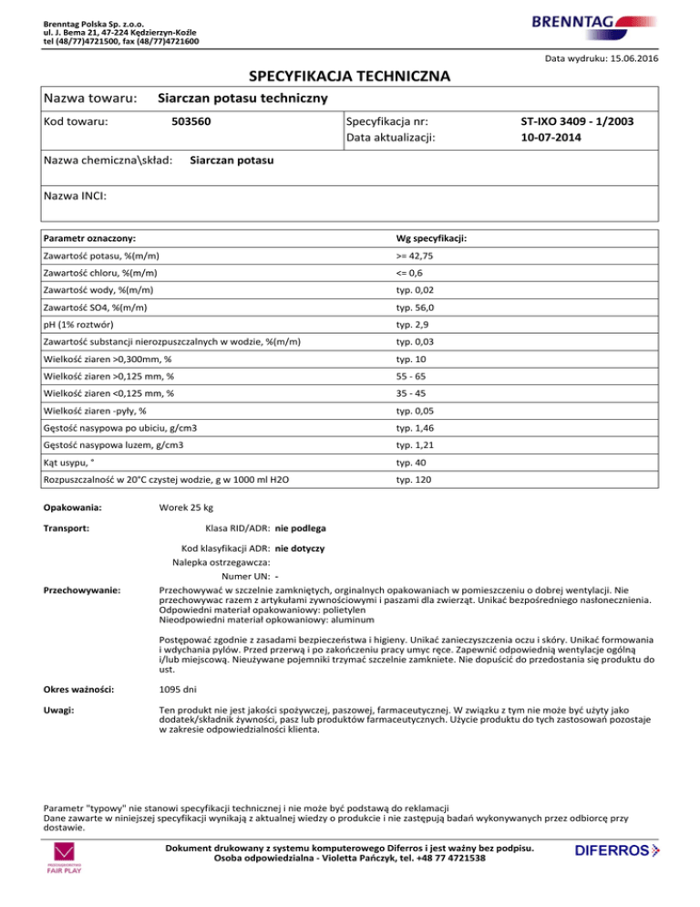 Brenntag Polska Sp. z.o.o. ul. J. Bema 21, 47-224 Kędzierzyn-Koźle tel (48/77)4721500, fax (48/77)4721600 Data wydruku: 15.06.2016 SPECYFIKACJA TECHNICZNA Nazwa towaru: Siarczan potasu techniczny Kod towaru: 503560 Nazwa chemiczna\skład: Specyfikacja nr: Data aktualizacji: ST-IXO 3409 - 1/2003 10-07-2014 Siarczan potasu Nazwa INCI: Parametr oznaczony: Wg specyfikacji: Zawartość potasu, %(m/m) >= 42,75 Zawartość chloru, %(m/m) <= 0,6 Zawartość wody, %(m/m) typ. 0,02 Zawartość SO4, %(m/m) typ. 56,0 pH (1% roztwór) typ. 2,9 Zawartość substancji nierozpuszczalnych w wodzie, %(m/m) typ. 0,03 Wielkość ziaren >0,300mm, % typ. 10 Wielkość ziaren >0,125 mm, % 55 - 65 Wielkość ziaren <0,125 mm, % 35 - 45 Wielkość ziaren -pyły, % typ. 0,05 Gęstość nasypowa po ubiciu, g/cm3 typ. 1,46 Gęstość nasypowa luzem, g/cm3 typ. 1,21 Kąt usypu, ° typ. 40 Rozpuszczalność w 20°C czystej wodzie, g w 1000 ml H2O typ. 120 Opakowania: Worek 25 kg Transport: Przechowywanie: Klasa RID/ADR: nie podlega Kod klasyfikacji ADR: nie dotyczy Nalepka ostrzegawcza: Numer UN: Przechowywać w szczelnie zamkniętych, orginalnych opakowaniach w pomieszczeniu o dobrej wentylacji. Nie przechowywac razem z artykułami zywnościowymi i paszami dla zwierząt. Unikać bezpośredniego nasłonecznienia. Odpowiedni materiał opakowaniowy: polietylen Nieodpowiedni materiał opkowaniowy: aluminum Postępować zgodnie z zasadami bezpieczeństwa i higieny. Unikać zanieczyszczenia oczu i skóry. Unikać formowania i wdychania pylów. Przed przerwą i po zakończeniu pracy umyc ręce. Zapewnić odpowiednią wentylacje ogólną i/lub miejscową. Nieużywane pojemniki trzymać szczelnie zamkniete. Nie dopuścić do przedostania się produktu do ust. Okres ważności: 1095 dni Uwagi: Ten produkt nie jest jakości spożywczej, paszowej, farmaceutycznej. W związku z tym nie może być użyty jako dodatek/składnik żywności, pasz lub produktów farmaceutycznych. Użycie produktu do tych zastosowań pozostaje w zakresie odpowiedzialności klienta. Parametr "typowy" nie stanowi specyfikacji technicznej i nie może być podstawą do reklamacji Dane zawarte w niniejszej specyfikacji wynikają z aktualnej wiedzy o produkcie i nie zastępują badań wykonywanych przez odbiorcę przy dostawie. Dokument drukowany z systemu komputerowego Diferros i jest ważny bez podpisu. Osoba odpowiedzialna - Violetta Pańczyk, tel. +48 77 4721538