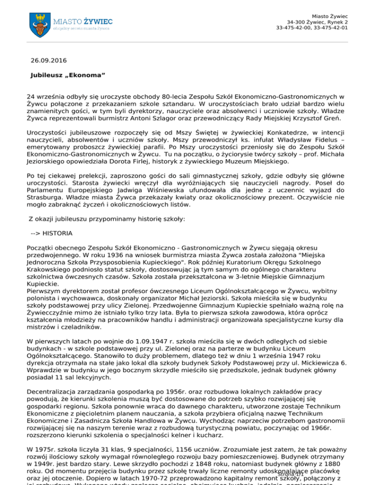 Miasto Żywiec 34-300 Żywiec, Rynek 2 33-475-42-00, 33-475-42-01 26.09.2016 Jubileusz „Ekonoma” 24 września odbyły się uroczyste obchody 80-lecia Zespołu Szkół Ekonomiczno-Gastronomicznych w Żywcu połączone z przekazaniem szkole sztandaru. W uroczystościach brało udział bardzo wielu znamienitych gości, w tym byli dyrektorzy, nauczyciele oraz absolwenci i uczniowie szkoły. Władze Żywca reprezentowali burmistrz Antoni Szlagor oraz przewodniczący Rady Miejskiej Krzysztof Greń. Uroczystości jubileuszowe rozpoczęły się od Mszy Świętej w żywieckiej Konkatedrze, w intencji nauczycieli, absolwentów i uczniów szkoły. Mszy przewodniczył ks. infułat Władysław Fidelus – emerytowany proboszcz żywieckiej parafii. Po Mszy uroczystości przeniosły się do Zespołu Szkół Ekonomiczno-Gastronomicznych w Żywcu. Tu na początku, o życiorysie twórcy szkoły – prof. Michała Jeziorskiego opowiedziała Dorota Firlej, historyk z żywieckiego Muzeum Miejskiego. Po tej ciekawej prelekcji, zaproszono gości do sali gimnastycznej szkoły, gdzie odbyły się główne uroczystości. Starosta żywiecki wręczył dla wyróżniających się nauczycieli nagrody. Poseł do Parlamentu Europejskiego Jadwiga Wiśniewska ufundowała dla jedne z uczennic wyjazd do Strasburga. Władze miasta Żywca przekazały kwiaty oraz okolicznościowy prezent. Oczywiście nie mogło zabraknąć życzeń i okolicznościowych listów. Z okazji jubileuszu przypominamy historię szkoły: --> HISTORIA Początki obecnego Zespołu Szkół Ekonomiczno - Gastronomicznych w Żywcu sięgają okresu przedwojennego. W roku 1936 na wniosek burmistrza miasta Żywca została założona "Miejska Jednoroczna Szkoła Przysposobienia Kupieckiego". Rok później Kuratorium Okręgu Szkolnego Krakowskiego podniosło statut szkoły, dostosowując ją tym samym do ogólnego charakteru szkolnictwa ówczesnych czasów. Szkoła została przekształcona w 3-letnie Miejskie Gimnazjum Kupieckie. Pierwszym dyrektorem został profesor ówczesnego Liceum Ogólnokształcącego w Żywcu, wybitny polonista i wychowawca, doskonały organizator Michał Jeziorski. Szkoła mieściła się w budynku szkoły podstawowej przy ulicy Zielonej. Przedwojenne Gimnazjum Kupieckie spełniało ważną rolę na Żywiecczyźnie mimo że istniało tylko trzy lata. Była to pierwsza szkoła zawodowa, która oprócz kształcenia młodzieży na pracowników handlu i administracji organizowała specjalistyczne kursy dla mistrzów i czeladników. W pierwszych latach po wojnie do 1.09.1947 r. szkoła mieściła się w dwóch odległych od siebie budynkach - w szkole podstawowej przy ul. Zielonej oraz na parterze w budynku Liceum Ogólnokształcącego. Stanowiło to duży problemem, dlatego też w dniu 1 września 1947 roku dyrekcja otrzymała na stałe jako lokal dla szkoły budynek Szkoły Podstawowej przy ul. Mickiewicza 6. Wprawdzie w budynku w jego bocznym skrzydle mieściło się przedszkole, jednak budynek główny posiadał 11 sal lekcyjnych. Decentralizacja zarządzania gospodarką po 1956r. oraz rozbudowa lokalnych zakładów pracy powodują, że kierunki szkolenia muszą być dostosowane do potrzeb szybko rozwijającej się gospodarki regionu. Szkoła ponownie wraca do dawnego charakteru, utworzone zostaje Technikum Ekonomiczne z pięcioletnim planem nauczania, a szkoła przybiera oficjalną nazwę Technikum Ekonomiczne i Zasadnicza Szkoła Handlowa w Żywcu. Wychodząc naprzeciw potrzebom gastronomii rozwijającej się na naszym terenie wraz z rozbudową turystyczną powiatu, poczynając od 1966r. rozszerzono kierunki szkolenia o specjalności kelner i kucharz. W 1975r. szkoła liczyła 31 klas, 9 specjalności, 1156 uczniów. Zrozumiałe jest zatem, że tak poważny rozwój ilościowy szkoły wymagał równoległego rozwoju bazy pomieszczeniowej. Budynek otrzymany w 1949r. jest bardzo stary. Lewe skrzydło pochodzi z 1848 roku, natomiast budynek główny z 1880 roku. Od momentu przejęcia budynku przez szkołę trwały liczne remonty udoskonalające placówkę Strona 1/1 oraz jej otoczenie. Dopiero w latach 1970-72 przeprowadzono kapitalny remont szkoły, połączony z Powered by TCPDF (www.tcpdf.org)