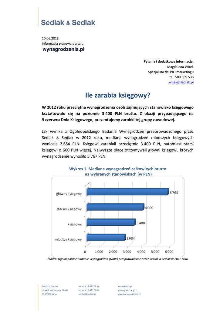 10.06.2013 Informacja prasowa portalu Pytania i dodatkowe informacje: Magdalena Witek Specjalista ds. PR i marketingu tel. 509 509 536 [email protected] Ile zarabia księgowy? W 2012 roku przeciętne wynagrodzenia osób zajmujących stanowisko księgowego kształtowało się na poziomie 3 400 PLN brutto. Z okazji przypadającego na 9 czerwca Dnia Księgowego, prezentujemy zarobki tej grupy zawodowej. Jak wynika z Ogólnopolskiego Badania Wynagrodzeń przeprowadzonego przez Sedlak & Sedlak w 2012 roku, mediana wynagrodzeń młodszych księgowych wyniosła 2 684 PLN. Księgowi zarabiali przeciętnie 3 400 PLN, natomiast starsi księgowi o 600 PLN więcej. Najwyższe płace otrzymywali główni księgowi, których wynagrodzenie wynosiło 5 767 PLN. Wykres 1. Mediana wynagrodzeń całkowitych brutto na wybranych stanowiskach (w PLN) Źródło: Ogólnopolskie Badanie Wynagrodzeń (OBW) przeprowadzone przez Sedlak & Sedlak w 2012 roku Sedlak & Sedlak tel. +48 12 625 59 10 www.sedlak.pl ul. Królowej Jadwigi 189 B fax +48 12 625 59 20 www.rynekpracy.pl 30-220 Kraków [email protected] www.wynagrodzenia.pl Jak podaje portal wynagrodzenia.pl, zdecydowanie wyższe wynagrodzenia otrzymywały osoby zatrudnione w przedsiębiorstwach z przewagą kapitału zagranicznego. Różnica w płacach młodszych księgowych z firm polskich, a ich kolegów z firm zagranicznych sięgała 700 PLN. Na stanowisku starszego księgowego wynosiła już 1 618 PLN. Osoby pracujące na stanowisku księgowego w organizacjach z przewagą rodzimego kapitału otrzymywały przeciętnie 2 906 PLN, podczas gdy osobom zajmującym to samo stanowisko w firmach zagranicznych płacono 4 500 PLN. Największą dysproporcję zaobserwowano w wynagrodzeniach głównych księgowych. Ich płace różniły się aż o 4 000 PLN. Wykres 2. Mediana wynagrodzeń całkowitych brutto w przedsiębiorstwach o różnym pochodzeniu kapitału na wybranych stanowiskach (w PLN) Źródło: Ogólnopolskie Badanie Wynagrodzeń (OBW) przeprowadzone przez Sedlak & Sedlak w 2012 roku Sprawdź, ile powinieneś zarabiać! Weź udział w Ogólnopolskim Badaniu Wynagrodzeń i porównaj swoje zarobki z innymi. Wypełnij ankietę! Magdalena Witek Sedlak & Sedlak Sedlak & Sedlak tel. +48 12 625 59 10 www.sedlak.pl ul. Królowej Jadwigi 189 B fax +48 12 625 59 20 www.rynekpracy.pl 30-220 Kraków [email protected] www.wynagrodzenia.pl
