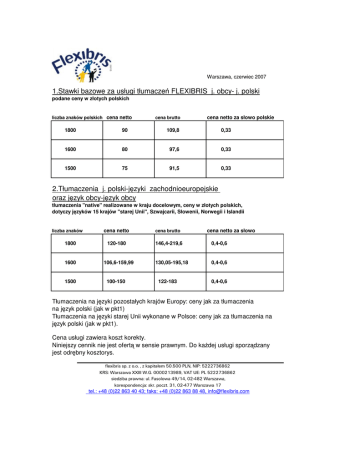 Warszawa, czerwiec 2007 1.Stawki bazowe za usługi tłumaczeń FLEXIBRIS j. obcy- j. polski podane ceny w złotych polskich liczba znaków polskich cena netto cena brutto cena netto za słowo polskie 1800 90 109,8 0,33 1600 80 97,6 0,33 1500 75 91,5 0,33 2.Tłumaczenia j. polski-języki zachodnioeuropejskie oraz język obcy-język obcy tłumaczenia "native" realizowane w kraju docelowym, ceny w złotych polskich, dotyczy języków 15 krajów "starej Unii", Szwajcarii, Słowenii, Norwegii i Islandii liczba znaków 1800 1600 1500 cena netto cena brutto 120-180 146,4-219,6 0,4-0,6 130,05-195,18 0,4-0,6 106,6-159,99 100-150 122-183 cena netto za słowo 0,4-0,6 Tłumaczenia na języki pozostałych krajów Europy: ceny jak za tłumaczenia na język polski (jak w pkt1) Tłumaczenia na języki starej Unii wykonane w Polsce: ceny jak za tłumaczenia na język polski (jak w pkt1). Cena usługi zawiera koszt korekty. Niniejszy cennik nie jest ofertą w sensie prawnym. Do każdej usługi sporządzany jest odrębny kosztorys. flexibris sp. z o.o. , z kapitałem 50.500 PLN, NIP: 5222736862 KRS: Warszawa XXIII W.G. 0000213989, VAT UE: PL 5222736862 siedziba prawna: ul. Fasolowa 49/14, 02-482 Warszawa, korespondencja: skr. poczt. 31, 02-477 Warszawa 17 tel.: +48 (0)22 863 40 43; faks: +48 (0)22 863 88 48, [email protected]