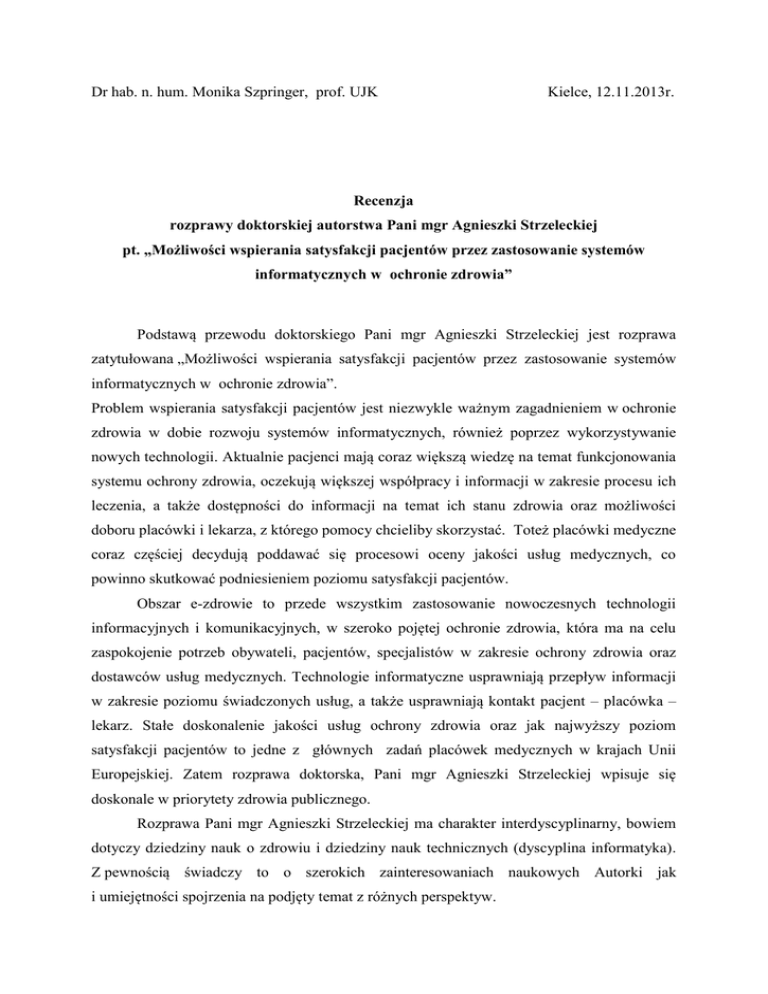 Dr hab. n. hum. Monika Szpringer, prof. UJK Kielce, 12.11.2013r. Recenzja rozprawy doktorskiej autorstwa Pani mgr Agnieszki Strzeleckiej pt. „Możliwości wspierania satysfakcji pacjentów przez zastosowanie systemów informatycznych w ochronie zdrowia” Podstawą przewodu doktorskiego Pani mgr Agnieszki Strzeleckiej jest rozprawa zatytułowana „Możliwości wspierania satysfakcji pacjentów przez zastosowanie systemów informatycznych w ochronie zdrowia”. Problem wspierania satysfakcji pacjentów jest niezwykle ważnym zagadnieniem w ochronie zdrowia w dobie rozwoju systemów informatycznych, również poprzez wykorzystywanie nowych technologii. Aktualnie pacjenci mają coraz większą wiedzę na temat funkcjonowania systemu ochrony zdrowia, oczekują większej współpracy i informacji w zakresie procesu ich leczenia, a także dostępności do informacji na temat ich stanu zdrowia oraz możliwości doboru placówki i lekarza, z którego pomocy chcieliby skorzystać. Toteż placówki medyczne coraz częściej decydują poddawać się procesowi oceny jakości usług medycznych, co powinno skutkować podniesieniem poziomu satysfakcji pacjentów. Obszar e-zdrowie to przede wszystkim zastosowanie nowoczesnych technologii informacyjnych i komunikacyjnych, w szeroko pojętej ochronie zdrowia, która ma na celu zaspokojenie potrzeb obywateli, pacjentów, specjalistów w zakresie ochrony zdrowia oraz dostawców usług medycznych. Technologie informatyczne usprawniają przepływ informacji w zakresie poziomu świadczonych usług, a także usprawniają kontakt pacjent – placówka – lekarz. Stałe doskonalenie jakości usług ochrony zdrowia oraz jak najwyższy poziom satysfakcji pacjentów to jedne z głównych zadań placówek medycznych w krajach Unii Europejskiej. Zatem rozprawa doktorska, Pani mgr Agnieszki Strzeleckiej wpisuje się doskonale w priorytety zdrowia publicznego. Rozprawa Pani mgr Agnieszki Strzeleckiej ma charakter interdyscyplinarny, bowiem dotyczy dziedziny nauk o zdrowiu i dziedziny nauk technicznych (dyscyplina informatyka). Z pewnością świadczy to o szerokich zainteresowaniach naukowych Autorki jak i umiejętności spojrzenia na podjęty temat z różnych perspektyw. Rozprawa mgr Agnieszki Strzeleckiej posiada prawidłowy układ edytorski charakterystyczny dla prac z obszaru nauk o zdrowiu. Praca podzielona jest na sześć części. Pierwsza część to część teoretyczna, w której Kandydatka na doktora charakteryzuje strategiczne priorytety w obszarze e-zdrowie, wyjaśniając pojęcia: e-zdrowie, strategię ezdrowie w świetle dokumentów Unii Europejskiej, system informacji w ochronie zdrowia oraz systemy informatyczne w ochronie zdrowia. Autorka charakteryzuje również interdyscyplinarność pomiaru satysfakcji pacjentów w Podstawowej Opiece Zdrowotnej. W tym kontekście opisuje działalność Podstawowej Opieki Zdrowotnej, wyjaśnia pojęcie satysfakcji pacjenta. Analizie poddano także modele satysfakcji pacjenta i pomiar satysfakcji pacjenta w systemie ochrony zdrowia oraz usługę medyczną w opinii pacjentów. Cześć druga i trzecia pracy stanowi podstawy metodologiczne badań własnych, czyli: cel pracy, problemy badawcze, hipotezy, zmienne i ich wskaźniki, metody, techniki i narzędzia badawcze, organizację i teren badań oraz metody statystyczne zastosowane w pracy. Dla osiągnięcia celów postawionych w pracy Pani mgr Agnieszka Strzelecka zastosowała określone metody i techniki badawcze, które warunkowały uzyskanie obiektywnych i rzetelnych wyników badań. W prezentowanej rozprawie doktorskiej Autorka wykorzystała metodę sondażu diagnostycznego, która umożliwiała zastosowanie następujących technik badawczych: ankietowania, badania dokumentów i testowania. Kandydatka na doktora skonstruowała kwestionariusz ankiety, składający się z 29 pytań, które zostały ułożone w odpowiednie bloki tematyczne. W części czwartej zamieszczono wyniki badań własnych. Dyskusja wyników badań własnych z wynikami badań innych autorów stanowi część piątą pracy. Ostatnia część pracy to wnioski wynikające z przygotowanej rozprawy doktorskiej. W dalszej kolejności w pracy zamieszczono piśmiennictwo, spis rycin, spis tabel oraz aneks. W pracy wykorzystano 100 pozycji piśmiennictwa: 83 pozycje krajowe i 17 pozycji zagranicznych. Jest ono aktualne i trafnie dobrane biorąc pod uwagę tytuł pracy oraz przedstawione treści merytoryczne. Na podkreślenie zasługuje fakt, iż analizowany obszar badawczy nie jest dostatecznie reprezentowany w literaturze przedmiotu i jego część podstawową stanowią pozycje anglojęzyczne. W rozprawie zamieszczono 59 rycin i 73 tabele. W aneksie usytuowane zostały narzędzia badawcze: Lista Oczekiwań Pacjenta PRF, kwestionariusz satysfakcji pacjentów podstawowej opieki zdrowotnej z jakości usług medycznych. M. Miller, P. Supranowicz, A. GębskaKuczerowska, J. Car., oraz kwestionariusz ankiety własnej konstrukcji. Do analizy statystycznej wykorzystano przede wszystkim oprogramowanie STATISTICA firmy StatSoft, a częściowo przy pomocy edytora graficznego zwartego w pakiecie MS OFFICE. Metody statystyczne zastosowane w pracy są poprawne. Autorka w części teoretycznej posługuje się pojęciem „Unia Europejska i Polska”, które jest błędne, bowiem Polska od 2004 roku jest członkiem Unii Europejskiej. W części metodologicznej Autorka sformułowała cel badań jako „ustalenie związku między satysfakcją pacjentów a potrzebą wdrażania systemów informatycznych…” a w rzeczywistości tytuł rozprawy to „możliwości wspierania satysfakcji pacjentów przez wdrażanie systemu informatycznego”. Nie są tożsame: badanie związku pomiędzy satysfakcją pacjentów a potrzebą wdrażania systemów informatycznych a badanie możliwości wspierania satysfakcji pacjentów przez zastosowanie systemów informatycznych. Dodatkowo w celu badań Autorka sformułowała twierdzenie, i