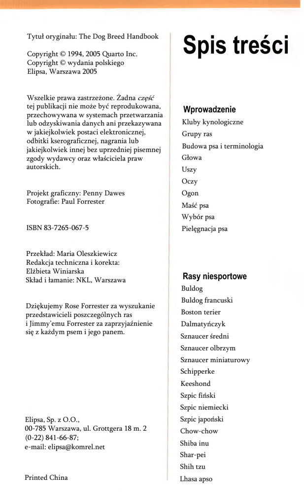 Tytuł oryginału: The Dog Breed Handbook Copyright © 1994, 2005 Quarto Inc. Copyright © wydania polskiego Elipsa, Warszawa 2005 Wszelkie prawa zastrzeżone. Żadna część tej publikacji nie może być reprodukowana, przechowywana w systemach przetwarzania lub odzyskiwania danych ani przekazywana w jakiejkolwiek postaci elektronicznej, odbitki kserograficznej, nagrania lub jakiejkolwiek innej bez uprzedniej pisemnej zgody wydawcy oraz właściciela praw autorskich. Spis treści Wprowadzenie Kluby kynologiczne Grupy ras Budowa psa i terminologia Głowa Uszy Oczy Projekt graficzny: Penny Dawes Fotografie: Paul Forrester Ogon Maść psa Wybór psa ISBN 83-7265-067-5 Przekład: Maria Oleszkiewicz Redakcja techniczna i korekta: Elżbieta Winiarska Skład i łamanie: NKL, Warszawa Pielęgnacja psa Rasy niesportowe Buldog Dziękujemy Rose Forrester za wyszukanie przedstawicieli poszczególnych ras i Jimmy’emu Forrester za zaprzyjaźnienie się z każdym psem i jego panem. Buldog francuski Boston terier Dalmatyńczyk Sznaucer średni Sznaucer olbrzym Sznaucer miniaturowy Schipperke Keeshond Szpic fiński Szpic niemiecki Elipsa, Sp. z O.O., 00-785 Warszawa, ul. Grottgera 18 m. 2 (0-22) 841-66-87; e-mail: [email protected] Szpic japoński Chow-chow Shiba inu Shar-pei Shih tzu Printed China Lhasa apso Spaniel tybetański 46 Rasy pasterskie 74 Terier tybetański Nowofundland 76 Bichon frise 47 48 Grosser Schweitzer sennenhund 78 Pudel standard 49 Appenzeller sennenhund Pudel miniaturowy 50 Hovawart 79 80 Pudel zabawka 51 Owczarek maremma 81 Bouvier des flandres 82 Bearded collie Border collie 84 85 Owczarek staroangielski 86 Owczarek szetlandzki 87 Collie gladkowłosy 88 89 Collie szorstkowłosy Owczarek węgierski puli 90 Briard 91 Australijski pies pasterski 92 93 94 Rasy pracujące 52 Lancashire heeler Mastiff 54 Buhund norweski Mastiff tybetański 55 Vallhund szwedzki % Bullmastiff 56 Welsh corgi pembroke 96 Dog (Great dane) 57 Welsh corgi cardigan 97 Bokser 58 Owczarek anatolijski 98 Doberman 59 Owczarek niemiecki 99 Komondor 60 Belgijskie psy pasterskie Canaan dog 61 Rottweiler 62 Leonberger 63 Portugalski pies wodny 64 Akita japoński 65 Pies górski estrela 66 Pirenejski pies górski 67 Berneński pies górski 68 Bernandyn 69 Pies eskimoski 70 Alaskan malamute 71 Samojed 72 Husky syberyjski 73 108 102 Psy gończe Labrador IM Pies faraonów Golden retriever 105 Podenco ibicenco Curly-coated retriever 106 Basenji Flat-coated retriever 107 Hamiltonstôvare Chesapeake bay retriever 108 Bloodhound Psy myśliwskie Otterhound Nova scoria duck tolling retriever Clumber spaniel 110 Segugio włoski 111 Ridgeback rodezyjski Cocker spaniel amerykański « Petit basset griffon vendéen m Jura laufhunde Schweitzer laufhunde Cocker spaniel angielski Basset hound Springer spaniel walijski 115 Beagle Basset fauve de bretagne Springer spaniel angielski Grand griffons vendéens 1 116 Grand bleu de gascogne Jamniki Spaniel wodny 118 Greyhound 119 Whippet 120 122 Wilczarz irlandzki 123 Saluki Seter irlandzki 124 Borzoj Seter irlandzki czerwono-biały 125 Elkhound Brittany 126 Chart afgański Pointer 127 Wyże! niemiecki krótkowłosy 128 Wyżeł niemiecki szorstkowłosy 129 Wyżeł weimarski 130 Wyżeł węgierski krótkowłosy 131 Kooikerhondje Spinone włoski 132 133 Miinsterlandery 134 irlandzki Sussex spaniel Field spaniel Seter angielski Gordon seter Deerhound Psy-zabawki 196 Affenpinscher 198 Maltańczyk 199 Lwi piesek 200 Gryfonik brukselski 201 Teriery 166 Bulterier 168 Bulterier miniaturowy 169 Toy terier angielski 202 Staffordshire bulterier 170 Yorkshire terier 203 Airedale terier 172 Silky terier australijski 204 Bedlington terier 173 Mops 206 Foksterier krótkowłosy 174 175 Szpic pomorski 207 Papillon 21» 176 Pekińczyk 209 216 Foksterier szorstkowłosy Terier irlandzki Kerry blue terier 177 Japoński czin Glen of imaal terier 178 King charles spaniel 212 Soft-coated wheaten terier 179 Cavalier king charles spaniel 213 Lakeland terier 180 Chihuahua 214 Manchester terier 181 Charcik wioski 216 Parson jack russell terier 182 Pinczer miniaturowy 217 Border terier 183 Grzywiasty pies chiński 211 Terier walijski 184 Cairn terier 185 Indeks 220 Norfolk terier Norwich terier 186 187 Dandie dinmont terier 188 Terier szkocki 189 Sealyham terier 190 Skye terier West highland white terier 191 192 Terier czeski 194 Terier australijski 195