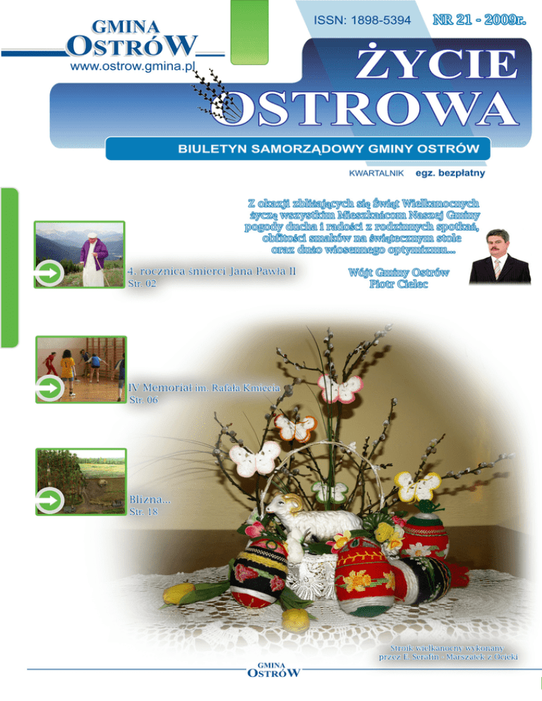 ŻCIE OSTROWA Życie Ostrowa www.ostrow.gmina.pl Najchętniej stał na bramce. I lubił kremówki. I wszystko co robił - czynił z ogromną pasją. I nigdy nie przeszedł obojętnie obok drugiego człowieka. Myślę, że tak można by wielkim skrócie opowiedzieć o Janie Pawle II. Bo jak w słowa ubrać historię człowieka, który z małego polskiego miasteczka dociera do Stolicy Piotrowej. I wcale nie mówię tutaj o drodze w charakterze ambicjonalnym dążeniu do sukcesu. Bo w takich kategoriach nie można rozpatrywać powołania. I lubił gdy śpiewają mu „Barkę”. Bo sensem jego życia stało się podążanie tą drogą, którą wskazał mu Pan. I poszedł tą drogą, mimo tego, że wiązała się z rezygnacją z wielu wcześniejszych zamierzeń. Ale droga, której Pan błogosławi, nigdy nas nie zawiedzie. I jego też nie zawiodła - choć zrezygnował ze swojego wymarzonego aktorstwa, jednak stał się na scenie świata orędownikiem ważniejszego dzieła. Najważniejszej roli w życiu – gdyż stał się orędownikiem Słowa Bożego. Nigdy nie dane mi było spotkać osobi- ście Ojca Świętego. Właściwie jedynie raz widziałem go „z bliska”, podczas kolejnej pielgrzymki do Pols k i . I odkryłem wtedy ogromną prawdę słów, które ktoś kiedyś powiedział o sile spojrzenia tego niesamowitego człowieka - że nieważne, jak duża jest grupa ludzi- każdy czuje, że to spojrzenie, ta ręka unosząca się w geście błogosławieństwa, czyniąca znak krzyża - kieruje tym błogosławieństwem do każdego człowieka z osobna. Każdy z nas wtedy stojących w grupie był pewny, ze to spojrzenie skierowane było właśnie do nieg o . I właściwie tak zapamiętałem Jana Pawła II. Mogło by się wydawać, że to mało – ale ja sadzę, ze takie wspomnienie wystarczy mi na całe moje życie. Dla mnie zawsze był i pozostanie - wzorem jak można przykazanie miłości bliźniego wprowadzić w życie - gdy każdy z grupki ludzi jest przekonany, że ta miłość i jego dotknęła, dosięgła. Bo mimo tego, że znam wiele opowieści o zdarzeniach z życia Karola Wojtyły, to jednak dla mnie pozostanie przede wszystkim człowiekiem o niezwykłej sile ducha, ufności wobec Boga i temu, jak jesteśmy prowadze- ADRES: Urząd Gminy Ostrów, tel./fax (0-17) 745 11 60 REDAKTOR NACZELNY: Przemysław Łagowski, tel. (0-17) 22 31 34 ŁAMANIE: Mateusz Surman, tel./fax (0-17) 745 17 17 WSPÓŁPRACA: Łukasz Kopala, Dariusz Rokosz, Wojciech Popielarz E-MAIL: [email protected] Zapraszamy do współpracy mieszkańców gminy w redagowaniu gazety. Chętnych prosimy o kontakt. 2 ni, jak jesteśmy powołani i posłani. Czasami zazdroszczę mu takiej siły w tej miłości bliźniego, w tym pochylaniu się nad drugim człowiekiem, czy podawaniu mu ręki. Bo on nigdy nie czynił żadnych różnic - już jako krakowski kardynał napotkanej podczas spaceru kobiecie pomógł wnieść wózek na najwyższe piętro kamienicy. I pierwszy wyciągnął rękę w geście pojednania do zamachowca, którego celem było pozbawianie go życia. Z okresu po zamachu, z kliniki Gemelli pochodzą moje cie, gdzie nikt tak jak Jan Paweł II nie potrafił pochylić się z równą miłością nad najbiedniejszymi, jak i nad możnymi tego świata. W świecie, gdzie nikt tak jak Jan Paweł II nie potrafił uczyć pokory wobec woli Bożej, wobec trudności odkrywać mimo wszystko to, co w życiu najpiękniejsze. Kto z pokorą potrafił nawet całować ziemię, dzieło rąk Najwyższego, tak samo jak i jeździć na nartach - by wysoko w górach słuchać co tam mu ten Pan Bocek szepcze z niebiańskich wysokości. I nie ulubione zdjęcia JP2. Kiedy uśmiecha się, aby ośmielić Arturo Mari, że przecież nie należy go traktować z jakimś ogromnym dystansem- tak też i w całym życiu robi wszystko, żeby pokonać wszelkie granice i dystansy. I kiedy Duch powiewem wiatru zamknął księgę jego życia w pierwszej chwili pomyślałem - że jak mi przyjdzie dalej żyć. W świe- kremówki, nie to, że najchętniej stał na bramce - stanowią dla mnie najważniejsze słowa pontyfikatu Jana Pawła II. Ale dwa proste zdania wypowiedziane lata temu - jakby podkreślenie, że celem najważniejszym jego życia była miłość, pokój serca. Życie Ostrowa Opracował :Łukasz Kopala www.ostrow.gmina.pl Inwestycje Gminy – I kwartał 2009 Zdając sobie sprawę z wyzwań rozwojowych, stojących przed Gminą Ostrów, władze samorządowe jako priorytet stawiają sobie aktywne poszukiwanie środków ze źródeł zewnętrznych, głównie tych pochodzących z Unii Europejskiej. Procedura uzyskania dofinansowania jest bardzo zawiła i czasochłonna. W związku z dużym zainteresowaniem potencjalnych beneficjentów bezzwrotnymi dotacjami, szanse na wsparcie mają tylko najciekawsze projekty, posiadające pełną dokumentację techniczną, niezbędne pozwolenia, cechujące się niskim współczynnikiem koszt/efekt (wartość dofinansowania inwestycji/ilość użytkowników mienia powstałego w wyniku realizacji inwestycji), wyso- kim stopniem wpływu na rozwój gospodarczy bliskiego otoczenia miejsca realizacji inwestycji (ilość nowych firm, ilość nowych miejsc pracy powstałych w wyniku realizacji inwestycji). W okresie ostatnich lat Gmina Ostrów brała udział w kilkunastu konkursach, realizując szereg przedsięwzięć. Działania te poza korzyściami w postaci zrealizowanych inwestycji, pozwoliły na zdobycie odpowiedniego doświadczenia i wiedzy merytorycznej w zakresie pozyskiwania, jak również wdrażania środków pomocowych. Jednym z ważniejszych kroków na tym polu było uzyskanie wsparcia na rozbudowę gminnej oczyszczalni ścieków w Skrzyszowie, na modernizację drogi gminnej BliznaNiwiska (ZPORR), na utworzenie Gminnego Centrum Informacji w Skrzyszowie w ramach Programu „Pierwsza Praca” Ministerstwa Gospodarki i Pracy. Zdobyte doświadczenia wykorzystywane są Droga Ostrów - Skrzyszów obecnie podczas aplikowani