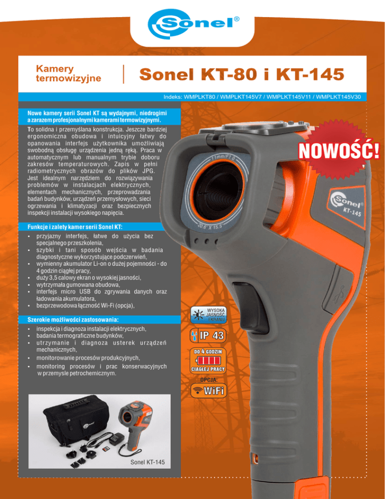 Indeks: WMPLKT80 / WMPLKT145V7 / WMPLKT145V11 / WMPLKT145V30 Nowe kamery serii Sonel KT są wydajnymi, niedrogimi a zarazem profesjonalnymi kamerami termowizyjnymi. To solidna i przemyślana konstrukcja. Jeszcze bardziej ergonomiczna obudowa i intuicyjny łatwy do opanowania interfejs użytkownika umożliwiają swobodną obsługę urządzenia jedną ręką. Praca w automatycznym lub manualnym trybie doboru zakresów temperaturowych. Zapis w pełni radiometrycznych obrazów do plików JPG. Jest idealnym narzędziem do rozwiązywania problemów w instalacjach elektrycznych, elementach mechanicznych, przeprowadzania badań budynków, urządzeń przemysłowych, sieci ogrzewania i klimatyzacji oraz bezpiecznych inspekcji instalacji wysokiego napięcia. NOWOŚĆ! Funkcje i zalety kamer serii Sonel KT: ź przyjazny interfejs, łatwe do użycia bez specjalnego przeszkolenia, ź szybki i tani sposób wejścia w badania diagnostyczne wykorzystujące podczerwień, ź wymienny akumulator Li-on o dużej pojemności - do 4 godzin ciągłej pracy, ź duży 3,5 calowy ekran o wysokiej jasności, ź wytrzymała gumowana obudowa, ź interfejs micro USB do zgrywania danych oraz ładowania akumulatora, ź bezprzewodowa łączność Wi-Fi (opcja), Szerokie możliwości zastosowania: ź inspekcja i diagnoza instalacji elektrycznych, ź badania termograficzne budynków, ź utrzymanie i diagnoza usterek urządzeń mechanicznych, ź monitorowanie procesów produkcyjnych, ź monitoring procesów i prac konserwacyjnych w przemysle petrochemicznym. OPCJA: WiFi Sonel KT-145 Indeks: WMPLKT80 / WMPLKT145V7 / WMPLKT145V11 / WMPLKT145V30 DANE TECHNICZNE Model KT-145v7 KT-145v11 KT-145v30 KT-80 Indeks WMPLKT145V7 WMPLKT145V11 WMPLKT145V30 WMPLKT80 7 mm 11 mm 30 mm 8 mm Obiektyw Parametry termiczne Rozdzielczość matrycy < 80 x 80 < 160 x 120 Zakres spektralny 8-14 µm Ostrość Ogniskowa / Pole widzenia Manualna 7 mm / 24°X 32° 11 mm / 15,5°X 20.6° Czułość termiczna 30 mm / 5,7°X 7,6° 8 mm / 18.5°X 18.5° < 0.08°C @30°C Zoom x2 - Palety 6 4 Interfejs micro USB Przedstawienie obrazu Wyświetlacz LCD o wysokiej jasności 3.5 cala LCD (320 x 240 pikseli) Trójstopniowa regulacja podświetlenia LCD Częstotliwość odświeżania 50 Hz Pomiar Dokładność Zakres mierzonych temperatur ±2°C lub ±2% -20°C...+350°C Korekcja warunków pomiaru 0°C...+250°C Emisyjność (0.01-1.00) Temperatura otoczenia Dystans - Wilgotność względna Funkcje pomiarowe Punkt Punkt centralny Max Punkt o temperaturze maksymalnej Min Alarm Punkt o temperaturze minimalnej Alarm dla temp. maksymalnej Alarm dla temp. minimalnej Format pliku / nośnik JPG / wymienna karta SD Zasilanie Akumulator 3,7 V 4200 mAh Li-Ion Ładowanie Ładowanie akumulatora w kamerze lub w zewnętrznej ładowarce Zasilanie zewnętrzne Czas pracy na baterii Zasilacz 110/230 VAC,50/60 Hz Do 4 godzin ciągłej pracy Cechy fizyczne / środowiskowe Szczelność Rozmiar IP43 103 mm x 98 mm x 258 mm Waga 755 g Temp. pracy -10°C...50°C Temp. przechowywania Wilgotność -20°C...60°C Od 10% do 95, bez kondensacji Wstrząsy - odporność 25G, IEC 68-2-29 Wibracje - odporność 2G, IEC 68-2-6 WYPOSAŻENIE STANDARDOWE KAMERY SONEL KT-80: - kamera KT-80 - karta pamięci SD - zasilacz uniwersalny 100~240V (wraz z adapterami do gniazd zasilających) - przewód USB-mikroUSB - płyta CD zawierająca oprogramowanie Sonel ThermoAnalyze2® - instrukcja obsługi kamery. - instrukcja obsługi programu Sonel ThermoAnalyze2. - pasek na rękę WYPOSAŻENIE STANDARDOWE KAMERY SONEL KT-145: - kamera KT-145. - Karta pamięci SD - zasilacz uniwersalny 100~240V (wraz z adapterami do gniazd zasilających) - przewód USB-mikroUSB - płyta CD zawierająca oprogramowanie Sonel ThermoAnalyze2® - instrukcja obsługi kamery. - instrukcja obsługi programu Sonel ThermoAnalyze2® - pasek na rękę - futerał (WAFUTM7). -