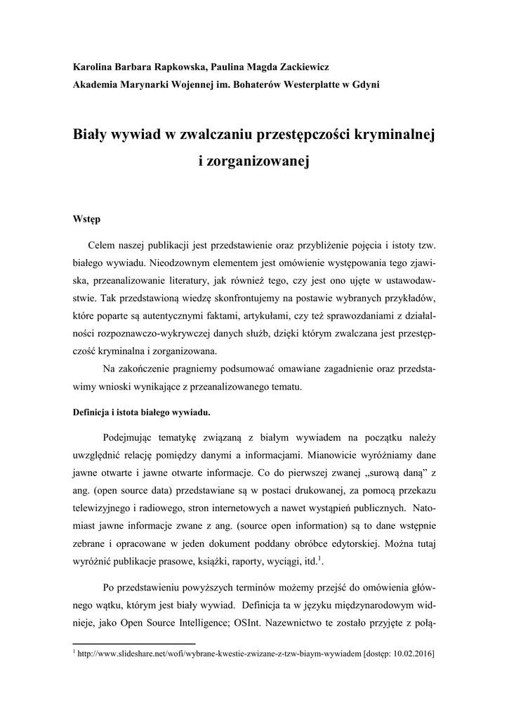 Karolina Barbara Rapkowska, Paulina Magda Zackiewicz Akademia Marynarki Wojennej im. Bohaterów Westerplatte w Gdyni Biały wywiad w zwalczaniu przestępczości kryminalnej i zorganizowanej Wstęp Celem naszej publikacji jest przedstawienie oraz przybliżenie pojęcia i istoty tzw. białego wywiadu. Nieodzownym elementem jest omówienie występowania tego zjawiska, przeanalizowanie literatury, jak również tego, czy jest ono ujęte w ustawodawstwie. Tak przedstawioną wiedzę skonfrontujemy na postawie wybranych przykładów, które poparte są autentycznymi faktami, artykułami, czy też sprawozdaniami z działalności rozpoznawczo-wykrywczej danych służb, dzięki którym zwalczana jest przestępczość kryminalna i zorganizowana. Na zakończenie pragniemy podsumować omawiane zagadnienie oraz przedstawimy wnioski wynikające z przeanalizowanego tematu. Definicja i istota białego wywiadu. Podejmując tematykę związaną z białym wywiadem na początku należy uwzględnić relację pomiędzy danymi a informacjami. Mianowicie wyróżniamy dane jawne otwarte i jawne otwarte informacje. Co do pierwszej zwanej „surową daną” z ang. (open source data) przedstawiane są w postaci drukowanej, za pomocą przekazu telewizyjnego i radiowego, stron internetowych a nawet wystąpień publicznych. Natomiast jawne informacje zwane z ang. (source open information) są to dane wstępnie zebrane i opracowane w jeden dokument poddany obróbce edytorskiej. Można tutaj wyróżnić publikacje prasowe, książki, raporty, wyciągi, itd.1. Po przedstawieniu powyższych terminów możemy przejść do omówienia głównego wątku, którym jest biały wywiad. Definicja ta w języku międzynarodowym widnieje, jako Open Source Intelligence; OSInt. Nazewnictwo te zostało przyjęte z połą1 http://www.slideshare.net/wofi/wybrane-kwestie-zwizane-z-tzw-biaym-wywiadem [dostęp: 10.02.2016] czenia skrótów z ang. słowa Huma – człowiek – HUM oraz Instelligence – wywiad – INT, czyli HUMNIT2. Jest to zdobywanie danych ze źródeł, które są powszechnie dostępne, odpłatnie bądź też bezpłatnie. Warto podkreślić, że pojedyncze informacje jednoźródłowe nie zawsze zawierają tajemnicę i przydatne wskazówki. Zaś po wydedukowaniu, zebraniu i zestawieniu tych wszystkich danych w całość z wielu różnych źródeł można pozyskać istotne treści3. Typologia została opracowania na podstawie różnych źródeł informacji. W służbach wojskowych jak i specjalnych wykształciły się następujące metody pracy wywiadowczej: SIGNIT (Signal Intelligence) – wywiad sygnałowy; IMINT (Imagery Intelligene) - analiza zdjęć satelitarnych i lotniczych; MASINT (Measurent and Signature Intelligence) – realizowany za pomocą specjalistycznych czujników w oparciu o pomiary wszelkich obiektów i prowadzenie na tej podstawie ich identyfikacji oraz charakterystyki4. Do technik wywiadowczych oprócz białego wywiadu zaliczamy szary oraz czarny wywiad. Każdy z nich posługuje się nieco innymi metodami. Mianowicie mówiąc o szarym wywiadzie mamy na myśli głównie wykorzystanie legalnych źródeł informacji z tymi zdobytymi za pomocą wywiadu środowiskowego. Kiedy problem jest skomplikowany i pojawiają się zawiłości w jego rozwiązaniu, co więcej dane ogólnodostępne nie są wystarczalne, organy ścigania mogą: przeprowadzić analizę kryminalistyczną (zastosowanie informatyki śledczej, badanie linii papilarnych, testy DNA), skorzystać z pomocy osób trzecich (przeprowadzając wywiad środowiskowy), dokonywać obserwacji osób i miejsc, wcielić się w dane środowisko (poprzez przyjęcie fałszywej tożsamości, dzięki której zdobywają zaufanie danej grupy społecznej, środowiska, zapoznają się z jej zamiarami, intencjami). Z kolei czarny wywiad uważany jest za najbardziej kontrowersyjną metodę. W literaturze przedmiotu określane nawet, jako szpiegostwo. Jego priorytetowym celem jest K. A. Wojtaszczyk, (red.) Polskie służby specjalne. Słownik, Warszawa 2011, s. 47. D. E. Denning, Wojna informacyjna i bezpieczeństwo informacji, Warszawa 2002, s. 36. 4 K. Radwaniak, Biały Wywiad w policji- narzędzie rozpoznawania zagrożeń terrorystycznych [w:] Studia prawnicze „Rozprawy i materiały” Nr 2 (11) 2012, Kraków 2012 str. 88. 2 3 zdobycie tajnych informacji, posługując się wszelkimi możliwymi sposobami. Do metod czarnego wywiadu zaliczamy między innymi: zakładanie podsłuchów, łamanie haseł i wszelkiego rodzaju zabezpieczeń, kradzież tożsamości, wywieranie nacisku, szantaż, prowokacje. Należy podkreślić, iż w przeciwieństwie do szarego wywiadu, w którym metody balansują na granicy prawa, w przypadku czarnego wywiadu możemy mówić nawet o jego łamaniu5. Ustawodawstwo a biały wywiad W ustawodawstwie polskim nie ma przepisów, w których występowałyby terminy tj. biały wywiad czy otwarte źródła informacji. Zatem przedstawiciele doktryny proponują swoje definicje, a mianowicie K. Mrozewicz określa biały „wywiad, jako analizę informacji z legalnie dostępnych źródeł” i uważa ją, jako najlepszy oraz najbezpieczniejszy sposób pozyskiwania tajemnic6. Nie zabrakło również przeciwników danego stanowiska, którzy przeciwstawiają się białemu wywiadowi stosując tzw. czarny wywiad, o którym wspomniano na początku artykułu. Zdobywa on informacje w sposób niejawny, wykorzystując do tego m.in. czynności operacyjno- rozpoznawcze tj.: podsłuchy, obserwacje, przesyłkę niejawnie nadzorowaną czy zakup kontrolowany7. Jedyną różnicą jest jawność tych informacji, w obu przypadkach czynności, mające na celu pozyskanie konkretnych tajemnic mają charakter niejawny. Następnie warto jest przytoczyć definicję Biura Analiz i Informacji Urzędu Ochrony Państwa z 1990 r., która określa biały wywiad, jako „zajmowanie się legalnym zdobywaniem informacji z przestrzeni publicznej i przetwarzaniem ich w sposób dający pionom op