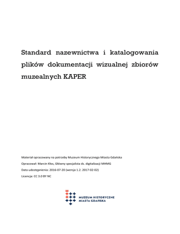 Standard nazewnictwa i katalogowania plików dokumentacji wizualnej zbiorów muzealnych KAPER Materiał opracowany na potrzeby Muzeum Historycznego Miasta Gdańska Opracował: Marcin Kłos, Główny specjalista ds. digitalizacji MHMG Data udostępnienia: 2016-07-20 (wersja 1.2. 2017-02-02) Licencja: CC 3.0 BY NC Standardy i dobre praktyki digitalizacji MHMG Standard przeznaczony jest do opisu plików graficznych 2D dokumentujących zbiory muzeum. Powstał na potrzeby Muzeum Historycznego Miasta Gdańska, przy czym został opisany w sposób umożliwiający zaadaptowanie do potrzeb innych muzeów oraz do implementacji w systemach zarządzania zasobami cyfrowymi w zakresie plików graficznych (DAM). Standard udostępniony jest na zasadach Creative Commons 3.0, Uznanie Autorstwa i Użycie Niekomercyjne (CC 3.0 BY NC). W przypadku modyfikacji należy wyraźnie zaznaczyć, że jest to nowa wersja standardu przez nadanie nowej nazwy. Nazwa Konserwacja, standardu jest Archiwum, akronimem Publikacja, głównych Ewidencja, kategorii: Reportaż, pozwalających określać dedykowany obszar zastosowania plików. 2 Standardy i dobre praktyki digitalizacji MHMG Funkcja standardu Istnieją różne metody organizacji nazewnictwa plików, niniejszy standard opisuje jedną z nich, wypracowaną w oparciu o wieloletnie doświadczenia digitalizacji zbiorów muzealnych. Standard ma zapewnić realizację czterech opisanych poniżej funkcji. Przede wszystkim ma umożliwić identyfikację odwzorowanego obiektu w pliku bez konieczności otwierania tego pliku. Następnie, ma zapewnić możliwość maszynowego powiązania plików z rekordami ewidencyjnymi w systemach zarządzania bazami danych, czyli tak zwanej ewidencji elektronicznej. Spełnienie tych dwóch funkcji możliwe jest wyłącznie przy konsekwentnym stosowaniu z jednej strony unikalnych numerów identyfikacyjnych dla obiektów (np. w ewidencji muzealiów, rejestrach pomocniczych, księdze wpływu i innych) z drugiej natomiast ustandaryzowanej struktury nazw pliku w odniesieniu do wszystkich dokumentowanych zbiorów, które są zewidencjonowane w instytucji. Wybiórcze stosowanie standardu zapewni ograniczoną bądź żadną korzyść. Z tego względu wdrożenie standardu może wymagać wprowadzenia zmian organizacyjnych w instytucji i przypisania ról (nowych zadań polegających m.in. na opisywaniu plików) pracownikom. Trzecia funkcja nazwy pliku to klasyfikacja pliku poprzez wskazanie do jakiego zastosowania został wytworzony lub wtórnie zaklasyfikowany. Ostatnia funkcja, związana z przenoszeniem danych, dotyczy możliwości masowej zmiany nazw przy zmianie w ramach migracji do nowego systemu wymagającego jakieś szczególnej formy nazewnictwa plików lub eksporcie do krajowego repozytorium. 3 Standardy i dobre praktyki digitalizacji MHMG Nazewnictwo plików Standard dzieli nazwę pliku graficznego na cztery elementy składowe: unikalny numer identyfikacyjny obiektu (1), numer pliku generowany przez urządzenie jak cyfrowy aparat fotograficzny lub skaner (2), oznaczenie kategorii KAPER (3) oraz rozszerzenie nazwy pliku (4). Dodane elementy nazwy pliku należy oddzielić od siebie znakiem podkreślenia _. Strukturę nazwy przedstawia zamieszczony poniżej model, w którym na czerwono zaznaczono elementy dodane do istniejącej nazwy pliku (czarny) wygenerowanej przez urządzenie: 1_2_3.4 gdzie: unikalny-numer-obiektu_numer-pliku_kategoria.rozszerzenie-nazwy-pliku Elementy składowe nazwy Poniżej scharakteryzowano 4 elementy składowe nazwy pliku graficznego. 1. Unikalny numer identyfikacyjny obiektu Nazwę pliku należy rozpocząć od unikalnego numeru identyfikacyjnego obiektu, przy czym może to być numer ewidencji, numer inwentarzowy, numer rejestru, numer akcesji, lub inny jednoznacznie wskazujący (identyfikujący) obiekt odwzorowany w pliku. Poszczególne elementy numeru należy rozdzielić znakami myślnika -. Nie należy stosować znaków diakrytycznych ani przerw między znakami. Wszystkie elementy numeru należy pisać małą literą. 4 Standardy i dobre praktyki digitalizacji MHMG Najczęściej unikalny numer identyfikujący obiekt będzie stanowił numer z jednej z ewidencji muzealnych i składał się z kilku składowych. Elementy unikalnego numeru identyfikującego obiekty w muzeum powinny być uregulowane przepisami wewnętrznymi muzeum. Oznakowanie rozpoczyna zazwyczaj skrót właściciela obiektu zgodnie ze statutem organizacji – na potrzeby przykładów, w niniejszym dokumencie stosowany jest skrót mm – akronim od Muzeum Miejskie. Kolejna część identyfikatora to najczęściej skrót literowy komórki organizacyjnej (działu, pracowni) odpowiedzialnej za obiekt, przy czym różna jest liczba liter, w niniejszym dokumencie stosowane są skróty: ab, h, hk, hs, p, rit, sh, tp, sygnalizujące jedynie różnorodność skrótów występujących w muzeach. Następna w kolejności jest liczba porządkowa rejestru np. pozycja w inwentarzu muzealiów czy pozycja w rejestrze pomocniczym, która może stanowić liczbę lub zbiór wartości, wówczas posiada podnumery lub podział na litery. Unikalny numer identyfikacyjny obiektu może przedstawiać się następująco: mm-h-123 dla zapisu w ewidencji mm/h/123; mm-rip-345 dla zapisu w ewidencji mm/rip/345; mm-ab-949-a, mm-ab-949-b, mm-ab-949-c dla zapisu w ewidencji mm/ab/949/a-c. Innym typem unikalnego numeru identyfikacyjnego może być numer akcesji, powszechniej stosowany w muzeach anglosaskich. W prostym wariancie może obejmować trzy składowe rozdzielone myślnikami, przy czym zapis w księgach może być rozdzielony kropkami. Pierwszy składnik to oznakowanie właściciela, podobnie jak w opisanym powyżej numerze ewidencji muzealnej, będzie to skrót 5 Standardy i dobre praktyki digitalizacji MHMG literowy instytucji zgodny ze statutem organizacji. Poprzedza on czterocyfrowe oznakowanie roku i numer porządkowy, pod którym obiekt został zarejestrowany w księdze akcesji w