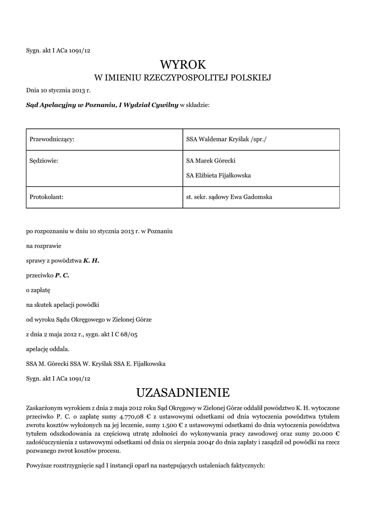 Sygn. akt I ACa 1091/12 WYROK W IMIENIU RZECZYPOSPOLITEJ POLSKIEJ Dnia 10 stycznia 2013 r. Sąd Apelacyjny w Poznaniu, I Wydział Cywilny w składzie: Przewodniczący: SSA Waldemar Kryślak /spr./ Sędziowie: SA Marek Górecki SA Elżbieta Fijałkowska Protokolant: st. sekr. sądowy Ewa Gadomska po rozpoznaniu w dniu 10 stycznia 2013 r. w Poznaniu na rozprawie sprawy z powództwa K. H. przeciwko P. C. o zapłatę na skutek apelacji powódki od wyroku Sądu Okręgowego w Zielonej Górze z dnia 2 maja 2012 r., sygn. akt I C 68/05 apelację oddala. SSA M. Górecki SSA W. Kryślak SSA E. Fijałkowska Sygn. akt I ACa 1091/12 UZASADNIENIE Zaskarżonym wyrokiem z dnia 2 maja 2012 roku Sąd Okręgowy w Zielonej Górze oddalił powództwo K. H. wytoczone przeciwko P. C. o zapłatę sumy 4.770,08 € z ustawowymi odsetkami od dnia wytoczenia powództwa tytułem zwrotu kosztów wyłożonych na jej leczenie, sumy 1.500 € z ustawowymi odsetkami do dnia wytoczenia powództwa tytułem odszkodowania za częściową utratę zdolności do wykonywania pracy zawodowej oraz sumy 20.000 € zadośćuczynienia z ustawowymi odsetkami od dnia 01 sierpnia 2004r do dnia zapłaty i zasądził od powódki na rzecz pozwanego zwrot kosztów procesu. Powyższe rozstrzygnięcie sąd I instancji oparł na następujących ustaleniach faktycznych: Pozwany wraz z żoną E. C. i znajomymi M. i V. małżonkami Ż. przebywał w lutym 2003 r. na nartach w Czechach. W dniu 14 lutego 2003 r. około godziny 14-15, wspólnie zjeżdżali czerwoną nartostradą ze stacji wyciągowej H.. Pierwsze zjeżdżały V. Ż. wraz z E. C., natomiast za nimi w pewnej odległości zjeżdżali M. Ż. i pozwany. Pod koniec trasy panie zjeżdżające pierwsze przystanęły na stoku w celu odpoczynku i wypatrywały swoich mężów. Dostrzegły, jak w poprzek trasy, w miejscu stosunkowo niewidocznym dla zjeżdżających z góry, za uskokiem na stromym stoku przechodziła grupa osób i jeden ze zjeżdżających narciarzy zahaczył przechodzącą kobietę powodując jej upadek. Narciarz ten, ubrany w ciemny kombinezon, nie zatrzymał się. Za mężczyzną tym zjeżdżali w grupie następni narciarze, którzy z trudem omijali leżącą kobietę. Za grupą tą zjeżdżali pozwany i M. Ż.. Pozwany zatrzymał się poniżej lezącej kobiety, natomiast M. Ż. dojechał do czekających na nich V. Ż. i E. C.. Wokół miejsca gdzie leżała kobieta gromadziły się kolejne osoby. Ponieważ pozwany nadal pozostawał w miejscu gdzie leżała kobieta, trójka jego znajomych postanowiła zjechać na dół trasy narciarskiej. Po zjeździe postanowili, że M. Ż. ponownie wjedzie wyciągiem na górę i sprawdzi zjeżdżając, co się dzieje z pozwanym. Po zatrzymaniu się pozwanego na miejscu zdarzenia, pojawiły się tam służby ratownicze. Nikt nie wskazywał wówczas na niego, jako na sprawcę kolizji. Również w okresie późniejszym nikt nie zwracał się do niego w tej sprawie. W tym dniu pozwany ubrany był w spodnie koloru czarnego typu pianka i kurtkę koloru khaki z czarnymi wstawkami. Po zatrzymaniu się przy leżącej kobiecie pozwany próbował porozumieć się z mężczyzną stojącym obok, który okazał się mężem poszkodowanej. Kobieta nie ruszała się i zastanawiano się jak jej pomóc. Pozwany nie znał języka niemieckiego i nie mógł się porozumieć z mężem pokrzywdzonej. Chcąc jednak zasięgnąć informacji o jej stanie zdrowia, poprosił męża kobiety o numer jego telefonu. Po powrocie z pobytu na nartach w Czechach, pozwany spotkał się 17 lutego 2003 roku z małżonkami Ż. w swoim mieszkaniu w Z.. Rozmawiali na temat wypadku narciarskiego i znająca język niemiecki V. Ż. zadzwoniła pod numer telefonu komórkowego uzyskanego przez pozwanego od męża powódki, by dowiedzieć się, że ofiara wypadku przebywa w szpitalu, miała uraz głowy, a jej stan jest stabilny. W dniu 22 lutego 2003 r. o godzinie 19 30 mąż powódki F. H. złożył w Komendzie Rejonowej Policji w S. M. zawiadomienie o przestępstwie, wskazując jako sprawcę wypadku abonenta numeru telefonicznego, z którego dzwoniono do niego 17 lutego 2003 roku. Przedstawiając przebieg zdarzenia podał do protokołu zawiadomienia o przestępstwie, że około 300 metrów przed końcem narciarskiej trasy zjazdowej o średnim czerwonym stopniu trudności jego żona się zatrzymała i gdy jadąc za nią spojrzał w jej kierunku, dostrzegł jak została ona przewrócona po uderzeniu masą ciała szybko zjeżdżającego mężczyzny. Mężczyzna ten ubrany był w czarną zimową kurtkę narciarską, ciemnoniebieskie spodnie narciarskie, zaś na głowie miał czarną czapkę. W trakcie rozmowy odmówił podania swojego imienia, nazwiska i adresu zamieszkania, chciał jednak numer telefonu męża powódki, który zapisał w swoim telefonie komórkowym Mężczyzna ten następnie wziął w rękę swoje narty i zszedł w dół po trasie narciarskiej, natomiast 17 lutego osobiście zadzwonił do męża powódki, dopytując się o stan jej zdrowia, jednak ponownie odmówił podania swojego imienia i nazwiska. Numer telefonu, który wyświetlił się mężowi powódki był numerem telefonu pozwanego. Postanowieniem policji czeskiej z 22 marca 2003 r. postępowanie w sprawie podejrzenia popełnienia przestępstwa spowodowania uszczerbku na zdrowiu zostało umorzone z powodu nie stwierdzenia znamion przestępstwa. Powódka nie pamięta ani jak doszło do wypadku, ani kto go spowodował. W wyniku doznanych przez nią obrażeń uszkodzenia pourazowego nerwu wzrokowego lewego z następczą ślepotą oka lewego, złamania przedniego dołu czaszki ze złamaniem oczodołu lewego, złamania w obrębie twarzoczaszki z krwiakiem zatoki szczękowej lewej i wgłębienia kości czaszki w okolicy czołowej i skroniowej, jej trwały uszczerbek na zdrowiu sięga 76%, a z powodu ograniczonej chwiejności afektywnej w sferze psychologicznej 30 %. W tak ustalonym stanie faktycznym Sąd Okręgowy przyj