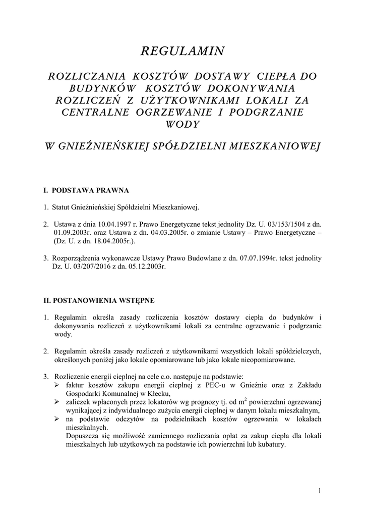 REGULAMIN ROZLICZANIA KOSZTÓW DOSTAWY CIEPŁA DO BUDYNKÓW KOSZTÓW DOKONYWANIA ROZLICZEŃ Z UŻYTKOWNIKAMI LOKALI ZA CENTRALNE OGRZEWANIE I PODGRZANIE WODY W GNIEŹNIEŃSKIEJ SPÓŁDZIELNI MIESZKANIOWEJ I. PODSTAWA PRAWNA 1. Statut Gnieźnieńskiej Spółdzielni Mieszkaniowej. 2. Ustawa z dnia 10.04.1997 r. Prawo Energetyczne tekst jednolity Dz. U. 03/153/1504 z dn. 01.09.2003r. oraz Ustawa z dn. 04.03.2005r. o zmianie Ustawy – Prawo Energetyczne – (Dz. U. z dn. 18.04.2005r.). 3. Rozporządzenia wykonawcze Ustawy Prawo Budowlane z dn. 07.07.1994r. tekst jednolity Dz. U. 03/207/2016 z dn. 05.12.2003r. II. POSTANOWIENIA WSTĘPNE 1. Regulamin określa zasady rozliczenia kosztów dostawy ciepła do budynków i dokonywania rozliczeń z uŜytkownikami lokali za centralne ogrzewanie i podgrzanie wody. 2. Regulamin określa zasady rozliczeń z uŜytkownikami wszystkich lokali spółdzielczych, określonych poniŜej jako lokale opomiarowane lub jako lokale nieopomiarowane. 3. Rozliczenie energii cieplnej na cele c.o. następuje na podstawie: faktur kosztów zakupu energii cieplnej z PEC-u w Gnieźnie oraz z Zakładu Gospodarki Komunalnej w Kłecku, zaliczek wpłaconych przez lokatorów wg prognozy tj. od m2 powierzchni ogrzewanej wynikającej z indywidualnego zuŜycia energii cieplnej w danym lokalu mieszkalnym, na podstawie odczytów na podzielnikach kosztów ogrzewania w lokalach mieszkalnych. Dopuszcza się moŜliwość zamiennego rozliczania opłat za zakup ciepła dla lokali mieszkalnych lub uŜytkowych na podstawie ich powierzchni lub kubatury. 1 ● Metoda rozliczenia wg powierzchni lub kubatury moŜe być stosowana w przypadku jeśli zaŜąda tego w formie pisemnej więcej niŜ 2/3 mieszkańców danego budynku. Jeśli dla rozliczenia niektórych składników kosztów dostawy ciepła jednostką fizyczną jest m2 powierzchni uŜytkowej lokali to powierzchnię tę oblicza się według zasad określonych w „Regulaminie rozliczania kosztów gospodarki zasobami mieszkaniowymi” zatwierdzonym przez Radę Nadzorczą Spółdzielni w dn. 26.10.2005r. Od stycznia 2001r. zgodnie z decyzją Zarządu rozliczenie następuje na podstawie odczytów wskazań ilości zuŜytych GJ na węzłach jedno lub wielobudynkowych. 4. Dla potrzeb niniejszego regulaminu wprowadza się następujące pojęcia: 1) CO - centralne ogrzewanie, 2) CW - podgrzanie wody wodociągowej (ciepła woda), 3) UŜytkownik lokalu - członek spółdzielni posiadający spółdzielcze prawo do lokalu, właściciel lokalu, najemca lokalu mieszkalnego lub uŜytkowego, 4) Lokale opomiarowane w zakresie CO - lokale, w których zainstalowano na grzejnikach podzielniki kosztów ogrzewania (wyparkowe bądź elektroniczne) oraz zawory termostatyczne, 5) Lokale opomiarowane w zakresie CW - lokale, do których ilość dostarczanej ciepłej wody określana jest wskazaniami zainstalowanego w tym celu wodomierza lokalowego, 6) Lokale nieopomiarowane w zakresie CO - lokale, w których nie zainstalowano na grzejnikach podzielników kosztów ogrzewania (wyparkowe bądź elektroniczne) oraz zaworów termostatycznych, a takŜe lokale, w których stwierdzono chociaŜby jedno niesprawne z tych urządzeń oraz lokale, których uŜytkownik uniemoŜliwił dostępu osobom upowaŜnionym do dokonania odczytu wskazań podzielników kosztów ogrzewania 7) Lokale nieopomiarowane w zakresie CW - lokale, w których nie zainstalowano wodomierzy słuŜących do określenia ilości dostarczonej ciepłej wody, a takŜe lokale, w których stwierdzono chociaŜby jedno niesprawne z tych urządzeń oraz lokale, których uŜytkownik uniemoŜliwił dostępu osobom upowaŜnionym do dokonania odczytu wskazań wodomierzy, 8) Powierzchnia ogrzewana – całkowita powierzchnia uŜytkowa lokali, wyjątkowo całkowita powierzchnia uŜytkowa lokali bez zamontowanych liczników jest umniejszana i stanowi powierzchnię grzewczą, 9) Nieruchomość - jednostka rozliczeniowa stanowiąca ogół rozliczanych lokali usytuowanych w budynku, których zaopatrywanie w ciepło odbywa się przez wspólną instalację, a pomiar ciepła rejestrowany jest w węźle cieplnym (lub w węzłach cieplnych jeŜeli jest ich więcej w budynku) obsługującym tą nieruchomość, 10) Okres rozliczeniowy - przedział czasu przyjęty do rozliczenia energii cieplnej na potrzeby: CO - 12 miesięcy, CW- 12 miesięcy. 11) Wskaźnik odczytu - stosunek sumy odczytanych jednostek w lokalu do powierzchni lokalu, w którym ten odczyt przeprowadzono, 12) Spółdzielnię - naleŜy rozumieć Gnieźnieńską Spółdzielnię Mieszkaniową w Gnieźnie. 2 III. POSTANOWIENIA OGÓLNE 1. Wprowadza się obowiązek opomiarowania we wszystkich lokalach Gnieźnieńskiej Spółdzielni Mieszkaniowej dostawy do lokali ciepła przeznaczonego na ogrzewanie (CO) i podgrzanie wody wodociągowej (CW) poprzez: 1) zainstalowanie zaworów termostatycznych i podzielników kosztów ogrzewania spełniających wymogi określane przepisami powszechnie obowiązującymi, a w szczególności określane Polskimi Normami lub aprobatami technicznymi oraz zastosowanie związanego z danego typu podzielnikami systemu rozliczeń, 2) zainstalowanie w instalacji zasilającej lokal w wodę, wodomierzy spełniających wymogi określane przepisami powszechnie obowiązującymi, a w szczególności posiadających legalizację wymaganą przepisami ustawy Prawo o miarach. 3) w budynkach spełniających warunki pkt. 1 i 2 rozliczenia mają charakter zindywidualizowany natomiast w budynkach nie spełniających warunków pkt. 1 i 2 rozliczenia mają charakter zryczałtowany. 2. Obsługa, w tym montaŜ i odczyt wskazań podzielników kosztów ogrzewania oraz wskazań wodomierzy lokalowych ciepłej wody dokonywana jest przez podmiot upowaŜniony przez Spółdzielnię. Spółdzielnia moŜe obciąŜyć uŜytkownika kosztami odczytu podzielników i rozliczenia energii cieplnej. 3. UŜytkownik lokalu zobowiązany jest do udostępnienia zajmowanego lokalu w celu: a) zamonto