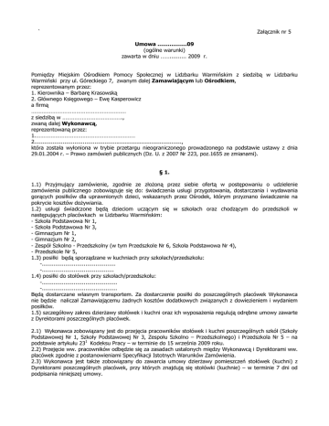 ` Załącznik nr 5 Umowa .................09 (ogólne warunki) zawarta w dniu …….......... 2009 r. Pomiędzy Miejskim Ośrodkiem Pomocy Społecznej w Lidzbarku Warmińskim z siedzibą w Lidzbarku Warmiński przy ul. Góreckiego 7, zwanym dalej Zamawiającym lub Ośrodkiem, reprezentowanym przez: 1. Kierownika – Barbarę Krasowską 2. Głównego Księgowego – Ewę Kasperowicz a firmą ……………………………………………………… z siedzibą w …………………………………., zwaną dalej Wykonawcą, reprezentowaną przez: 1.………………………………………………………… 2........................................................................................, która została wyłoniona w trybie przetargu nieograniczonego prowadzonego na podstawie ustawy z dnia 29.01.2004 r. – Prawo zamówień publicznych (Dz. U. z 2007 Nr 223, poz.1655 ze zmianami). § 1. 1.1) Przyjmujący zamówienie, zgodnie ze złoŜoną przez siebie ofertą w postępowaniu o udzielenie zamówienia publicznego zobowiązuje się do: świadczenia usługi przygotowania, dostarczania i wydawania gorących posiłków dla uprawnionych dzieci, wskazanych przez Ośrodek, którym przyznano świadczenie na pokrycie kosztów doŜywiania. 1.2) usługi świadczone będą dzieciom uczącym się w szkołach oraz chodzącym do przedszkoli w następujących placówkach w Lidzbarku Warmińskim: - Szkoła Podstawowa Nr 1, - Szkoła Podstawowa Nr 3, - Gimnazjum Nr 1, - Gimnazjum Nr 2, - Zespół Szkolno - Przedszkolny (w tym Przedszkole Nr 6, Szkoła Podstawowa Nr 4), - Przedszkole Nr 5, 1.3) posiłki będą sporządzane w kuchniach przy szkołach/przedszkolu: -............................................ -........................................... 1.4) posiłki do stołówek przy szkołach/przedszkolu: -............................................. -............................................. Będą dostarczane własnym transportem. Za dostarczenie posiłki do poszczególnych placówek Wykonawca nie będzie naliczał Zamawiającemu Ŝadnych kosztów dodatkowych związanych z dowiezieniem i wydaniem posiłków. 1.5) szczegółowy zakres dzierŜawy stołówek i kuchni oraz ich wyposaŜenia regulują odrębne umowy zawarte z Dyrektorami poszczególnych placówek. 2.1) Wykonawca zobowiązany jest do przejęcia pracowników stołówek i kuchni poszczególnych szkół (Szkoły Podstawowej Nr 1, Szkoły Podstawowej Nr 3, Zespołu Szkolno – Przedszkolnego) i Przedszkola Nr 5 – na podstawie artykułu 231 Kodeksu Pracy – w terminie do 15 września 2009 roku. 2.2) Przejęcie ww. pracowników odbędzie się za zasadach ustalonych między Wykonawcą i Dyrektorami ww. placówek zgodnie z postanowieniami Specyfikacji Istotnych Warunków Zamówienia. 2.3) Wykonawca jest takŜe zobowiązany do zawarcia umowy dzierŜawy pomieszczeń stołówek (kuchni) z Dyrektorami poszczególnych placówek, przy których znajdują się stołówki (kuchnie) – w terminie 7 dni od podpisania niniejszej umowy. § 2. 1) Zamawiający określa wielkość przedmiotu zamówienia w okresie obowiązywania umowy na 72 492 posiłki, w tym w okresie 1 roku (12 miesięcy – od września do sierpnia kaŜdego z dwóch lat obowiązywania umowy) na 36 246 posiłków, z podziałem na: 1. 35 490 – pełnych obiadów (wydawanych dla uczniów szkół), 2. 756 – I i II śniadań oraz pełnych obiadów – tzw. całodzienne wyŜywienie (wydawanych dla dzieci przedszkolnych). 1.1) Liczba sporządzanych i wydawanych posiłków w poszczególnych stołówkach będzie wynosiła (wybrać odpowiednie): Lp. 1 Nazwa placówki, przy której znajduje się stołówka Adres (Lidzbark Warmiński) Szkoła Podstawowa Nr 1 (SP ul. Szkolna 2 Nr 1) Obsługiwane dzieci i uczniowie Ilość posiłków z programu doŜywiania w skali roku SP Nr 1 8 189 Gimnazjum Nr 1 (GM Nr 1) 3 813 2 Szkoła Podstawowa Nr 3 (SP ul. Lipowa 17A Nr 3) SP Nr 3 12 048 3 Zespół SzkolnoPrzedszkolny (ZSP) Szkoła Podstawowa Nr 4 4 527 ul. Polna 36 Przedszkole Nr 6 Gimnazjum Nr 2 4 Przedszkole Nr 5 ul. Wodna 9 Przedszkole Nr 5 Ogółem 483 6 913 273 36 246 2) Ilość posiłków moŜe ulec zmniejszeniu lub zwiększeniu, w zaleŜności od faktycznej liczby osób objętych programem doŜywiania. 3) Z tytułu ewentualnego zmniejszenia wielkości zamówienia Zamawiający nie ponosi Ŝadnych konsekwencji. 4) DoŜywianie realizowane jest w dni powszednie, w których odbywa się nauka w szkole – zgodnie z harmonogramem pracy placówki. Nie wyklucza się moŜliwości wydawania posiłków w okresie przerwy w nauce szkolnej, tj. w okresie ferii i wakacji szkolnych. 4.1.) śywienie dzieci przedszkolnych realizowane jest w okresie całego roku z wyjątkiem części okresu wakacyjnego – zgodnie z indywidualnym harmonogramem pracy przedszkola. § 3. 1) W przypadku dowoŜenia posiłków do placówek, dostarczane będą w termosach i szczelnych pojemnikach, własnym transportem Wykonawcy, spełniającym wymagania sanitarne do przewozu Ŝywności. 2) Posiłki muszą być bezwzględnie świeŜe i przyrządzane w dniu dostawy. § 4. 1) Posiłki dla dzieci w szkole są realizowane w formie pełnego gorącego obiadu, który składa się z: zupy, drugiego dania oraz kompotu lub deseru. 1.1) W okresie dekadowym (2 x poniedziałek - piątek) skład posiłków winien przedstawiać się następująco: - 5 posiłków – zupa + ziemniaki, kasza lub ryŜ, mięso, surówka, jarzynka + kompot lub deser, - 2 posiłki – zupa + ziemniaki, ryba, surówka, jarzynka + kompot lub deser, - 3 posiłki – zupa + danie mączne, surówka, jarzynka lub owoce + kompot lub deser. 2) Posiłki dla dzieci w przedszkolu realizowane są w formie Ŝywienia całodziennego tj.: - pełny obiad (zupa, drugie danie, kompot lub deser), - pierwsze śniadanie, - drugie śniadanie. 2.1) W okresie dekadowym (2 x poniedziałek – piątek) skład posiłków dla dzieci przedszkolnych winien przedstawiać się następująco: 