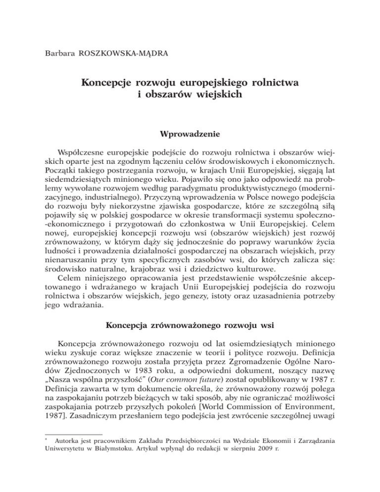 Barbara ROSZKOWSKA-MĄDRA Koncepcje rozwoju europejskiego rolnictwa i obszarów wiejskich Wprowadzenie Współczesne europejskie podejście do rozwoju rolnictwa i obszarów wiejskich oparte jest na zgodnym łączeniu celów środowiskowych i ekonomicznych. Początki takiego postrzegania rozwoju, w krajach Unii Europejskiej, sięgają lat siedemdziesiątych minionego wieku. Pojawiło się ono jako odpowiedź na problemy wywołane rozwojem według paradygmatu produktywistycznego (modernizacyjnego, industrialnego). Przyczyną wprowadzenia w Polsce nowego podejścia do rozwoju były niekorzystne zjawiska gospodarcze, które ze szczególną siłą pojawiły się w polskiej gospodarce w okresie transformacji systemu społeczno‑ekonomicznego i przygotowań do członkostwa w Unii Europejskiej. Celem nowej, europejskiej koncepcji rozwoju wsi (obszarów wiejskich) jest rozwój zrównoważony, w którym dąży się jednocześnie do poprawy warunków życia ludności i prowadzenia działalności gospodarczej na obszarach wiejskich, przy nienaruszaniu przy tym specyficznych zasobów wsi, do których zalicza się: środowisko naturalne, krajobraz wsi i dziedzictwo kulturowe. Celem niniejszego opracowania jest przedstawienie współcześnie akceptowanego i wdrażanego w krajach Unii Europejskiej podejścia do rozwoju rolnictwa i obszarów wiejskich, jego genezy, istoty oraz uzasadnienia potrzeby jego wdrażania. Koncepcja zrównoważonego rozwoju wsi Koncepcja zrównoważonego rozwoju od lat osiemdziesiątych minionego wieku zyskuje coraz większe znaczenie w teorii i polityce rozwoju. Definicja zrównoważonego rozwoju została przyjęta przez Zgromadzenie Ogólne Narodów Zjednoczonych w 1983 roku, a odpowiedni dokument, noszący nazwę „Nasza wspólna przyszłość” (Our common future) został opublikowany w 1987 r. Definicja zawarta w tym dokumencie określa, że zrównoważony rozwój polega na zaspokajaniu potrzeb bieżących w taki sposób, aby nie ograniczać możliwości zaspokajania potrzeb przyszłych pokoleń [World Commission of Environment, 1987]. Zasadniczym przesłaniem tego podejścia jest zwrócenie szczególnej uwagi * Autorka jest pracownikiem Zakładu Przedsiębiorczości na Wydziale Ekonomii i Zarządzania Uniwersytetu w Białymstoku. Artykuł wpłynął do redakcji w sierpniu 2009 r. 84 GOSPODARKA NARODOWA Nr 10/2009 na konieczność harmonijnego powiązania gospodarczych, społecznych i przyrodniczych aspektów rozwoju z potrzebami pokoleń obecnych i przyszłych. Zasady zrównoważonego rozwoju rolnictwa i obszarów wiejskich (Sustainable Agriculture and Rural Development – SARD) zostały określone na konferencji ONZ, w sprawie Środowiska i Rozwoju Gospodarczego w Rio de Janerio w 1992 roku. W dokumencie programowym Agenda 21, przyjętym na tej konferencji, przedstawiono sposób opracowywania i wdrażania programów zrównoważonego rozwoju do praktyki gospodarczej. W koncepcji zrównoważonego rozwoju wsi mieszczą się działania, których celem jest poprawa warunków prowadzenia działalności gospodarczej i warunków życia na obszarach wiejskich, przy jednoczesnym nienaruszaniu specyficznych zasobów wsi, do których zalicza się walory środowiska naturalnego, krajobraz wsi, tradycje i dziedzictwo kulturowe. Podejście to (często nazywane ekorozwojem), godzi prawa przyrody i ekonomii dzięki przestrzeganiu w działaniach gospodarczych: obranego kierunku rozwoju, który powinien być dostosowany do istniejących uwarunkowań przyrodniczych; potrzeb i woli lokalnych społeczności oraz norm ekologicznych [Urban, 2003]. Woś i Zegar w koncepcji zrównoważonego rozwoju obszarów wiejskich, wyróżniają cztery główne kierunki rozwoju, a mianowicie [Woś, Zegar 2002]: • ochronę obszarów wiejskich, w tym ochronę krajobrazu wiejskiego, różnorodności biologicznej i przeciwdziałanie erozji gleb, • trwały i zrównoważony rozwój rolnictwa, • ochronę wody, gleby i powietrza przed zanieczyszczeniami pochodzenia rolniczego, • zachowanie ostrożności przy rozwoju biotechnologii i inżynierii genetycznej. Do głównych narzędzi polityki państwa, stymulujących zrównoważony rozwój rolnictwa i obszarów wiejskich w Polsce, Woś zalicza [Woś, 2001]: • interwencjonizm państwowy pozwalający na pełne wykorzystanie wytworzonej w rolnictwie wartości dodanej, • preferowanie dualnego modelu rozwoju rolnictwa, • wykorzystanie tak zwanej „renty niedorozwoju” jako szansy realizacji rozwoju zrównoważonego. Niektórzy autorzy podchodzą sceptycznie do możliwości, jakie niesie koncepcja zrównoważonego rozwoju, twierdząc wręcz, że termin sustainable development często używany jest jako „wygodna klisza, kryjąca faktyczny brak koncepcji” [Halamska, 2001]. Jednakże, opracowanie konkretnych strategii rozwoju obszarów wiejskich z uwzględnieniem ich wsparcia poprzez zarządzanie publiczne, uzależnione i dostosowane do istniejącej specyfiki i jej uwarunkowań, pozwalają nadać realną treść i sens wykonawczy koncepcji zrównoważonego rozwoju rolnictwa i wsi. Opracowanie i realizacja wymienionych strategii działania powinna odnosić się do wszystkich rodzajów i sektorów działalności gospodarczych, prowadzonych na danym obszarze, tj. rolnictwa, leśnictwa, drobnego przemysłu, handlu, turystyki i innych, zintegrowanych działań ze strony wszystkich grup aktorów, występujących na obszarach wiejskich w procesach rozwoju. Niniejsza praca jest skupiona właśnie na próbie Barbara Roszkowska-Mądra, Koncepcje rozwoju europejskiego rolnictwa i obszarów wiejskich 85 przedstawienia klasycznych i nowych pomysłów realizacji idei zrównoważonego rozwoju rolnictwa i obszarów wiejskich. Koncepcja zrównoważonego rozwoju wsi zakłada wypełnianie zarówno przez rolnictwo, jak i przez obszary wiejskie, wielorakich funkcji rolniczych i pozarolniczych, które w Polsce począwszy od lat 90. ulegają znaczącemu poszerzeniu o nowe funkcj