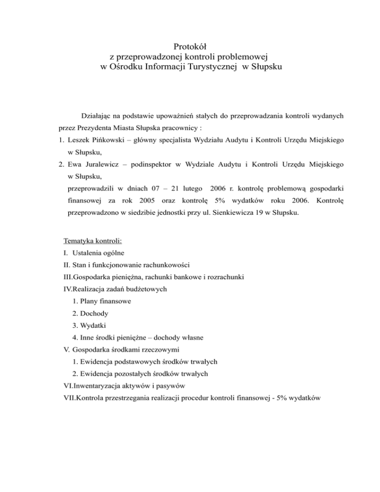 Protokół z przeprowadzonej kontroli problemowej w Ośrodku Informacji Turystycznej w Słupsku Działając na podstawie upoważnień stałych do przeprowadzania kontroli wydanych przez Prezydenta Miasta Słupska pracownicy : 1. Leszek Pińkowski – główny specjalista Wydziału Audytu i Kontroli Urzędu Miejskiego w Słupsku, 2. Ewa Juralewicz – podinspektor w Wydziale Audytu i Kontroli Urzędu Miejskiego w Słupsku, przeprowadzili w dniach 07 – 21 lutego 2006 r. kontrolę problemową gospodarki finansowej za rok 2005 oraz kontrolę 5% wydatków roku 2006. Kontrolę przeprowadzono w siedzibie jednostki przy ul. Sienkiewicza 19 w Słupsku. Tematyka kontroli: I. Ustalenia ogólne II. Stan i funkcjonowanie rachunkowości III.Gospodarka pieniężna, rachunki bankowe i rozrachunki IV.Realizacja zadań budżetowych 1. Plany finansowe 2. Dochody 3. Wydatki 4. Inne środki pieniężne – dochody własne V. Gospodarka środkami rzeczowymi 1. Ewidencja podstawowych środków trwałych 2. Ewidencja pozostałych środków trwałych VI.Inwentaryzacja aktywów i pasywów VII.Kontrola przestrzegania realizacji procedur kontroli finansowej - 5% wydatków Okres kontrolowany : Kontrolą objęto okres od stycznia do grudnia 2005 r. i okres miesiąca stycznia 2006 r. w zakresie kontroli 5 % wydatków. I. Ustalenia ogólne Ośrodek Informacji Turystycznej powstał z przekształcenia Wojewódzkiego Ośrodka Informacji Turystycznej, przejętego przez miasto na prawach powiatu z dniem 01.01.1999 r. Uchwałą Nr VIII/89/99 Rady Miejskiej w Słupsku zmieniono nazwę WOIT na Ośrodek Informacji Turystycznej i Promocji Miasta w Słupsku. Jednostka posiada regulamin organizacyjny z 1999 r. nadany uchwałą Nr 610/99 Zarządu Miasta Słupska z dnia 22.07.1999 r. Uchwałą Nr XIII/112/03 Rady Miejskiej w Słupsku z dnia 25 czerwca 2003 r. zmieniono nazwę ośrodka na Ośrodek Informacji Turystycznej w Słupsku. Nie wprowadzono zmian w regulaminie organizacyjnym. Ośrodek jest jednostką budżetową, której terenem działania jest Miasto Słupsk. Celem działania Ośrodka jest świadczenie usług turystyczno – informacyjnych o mieście i regionie, promocja miasta na targach turystycznych i gospodarczych – krajowych i zagranicznych. Do zadań Ośrodka należy gromadzenie, przetwarzanie i udostępnianie materiałów informacyjnych z zakresu turystyki, promocji i gospodarki, udzielanie informacji i publikowanie wydawnictw. Jednostka zajmuje pomieszczenia w budynku przy ul. Sienkiewicza 19 na podstawie umowy użyczenia zawartej w dniu 22.11.2001 r. pomiędzy Zarządem Miasta Słupska a Miejskim Ośrodkiem Pomocy Rodzinie w Słupsku. Użyczający bezpłatnie oddał jednostce działkę gruntu zabudowanego budynkiem administracyjno – usługowym i garażem o powierzchni 879 m kw. oraz pomieszczenia o powierzchni 163,59 m kw, usytuowane w piwnicy budynku. Funkcję zarządcy i administratora całej nieruchomości pełni Miejski Ośrodek Pomocy Rodzinie. Kierownikiem jednostki jest Pani Monika Łobza powołana na stanowisko z dniem 01 stycznia 1993 r. na podstawie art. 68 § 1 ustawy z dnia 26 czerwca 1974 r. - Kodeks pracy (Dz. U. Nr 24, poz. 141 z póź. zm.) przez Wojewodę Słupskiego. 2 Uchwałą Nr 61/99/KZM Zarządu Miasta Słupska z dnia 28 stycznia 1999 r. udzielono pełnomocnictwa do dokonywania czynności prawnych związanych z kierowaniem bieżącą działalnością jednostki budżetowej z wyjątkiem spraw związanych z nabyciem , zbywaniem i obciążaniem nieruchomości, ich wydzierżawianiem i najmem oraz nabywaniem i zbywaniem środków trwałych. Głównym Księgowym jest Pani Krystyna Nawrocka zatrudniona z dniem 01 kwietnia 2004 r. W aktach osobowych znajduje się zapytanie o udzielenie informacji z Krajowego Rejestru Karnego z dnia 30.01.2006 r. z adnotacją „nie figuruje” oraz zakres obowiązków, uprawnień i odpowiedzialności powierzony przez Kierownika jednostki zgodnie z art. 35 obowiązującej w chwili zatrudnienia ustawy o finansach publicznych (Dz. U. Nr 155 z 1998 r., poz. 1014 z póź. zm.) II. Stan i funkcjonowanie rachunkowości Ewidencja księgowa prowadzona jest w jednostce systemem komputerowym. Zarządzeniem Nr 3/2004 Kierownika OIT w Słupsku z dnia 25 sierpnia 2004 r. przyjęto zasady prowadzenia rachunkowości, zawarte w załącznikach: – Załącznik Nr 1 – określa zasady rachunkowości, – Załącznik Nr 2 – zawiera plan kont, – Załącznik Nr 3 - wprowadza wykaz programów komputerowych dopuszczonych do stosowania w jednostce tj. Program Finansowo – Księgowy i Program Płatnik wraz z charakterystyką opisową oraz sposobami działania i zasadami ochrony danych, – Załącznik Nr 4 – określa wykaz materiałów odpisywanych bezpośrednio w koszty w momencie zakupu oraz uznanych za wykorzystane w momencie przekazania do zużycia. Zarządzeniem Nr 4/2004 Kierownika OIT w Słupsku z dnia 31 grudnia 2004 r. wprowadzono procedury kontroli dochodów i wydatków, zgodności z planem finansowym a także zasady wstępnej oceny celowości ponoszonych wydatków. Zarządzeniem Nr 1/2005 Kierownika OIT w Słupsku z dnia 23 maja 2005 r. wprowadzono zakres i zasady przeprowadzania inwentaryzacji w jednostce. Zarządzeniem Nr 1/06 Kierownika OIT w Słupsku z dnia 06 stycznia 2006 r. wprowadzono instrukcję kasową. 3 Aneksem Nr 1 z dnia 06 stycznia 2006 r. do zarządzenia Nr 3/2004 z dnia 25.08.2004 r. wprowadzono szczegółowe zasady prowadzenia konta 130 - „Rachunek bieżący jednostki budżetowej, określając wpływy i rozchody, z uwzględnieniem klasyfikacji budżetowej i zachowania czystości zapisów na koncie. Aneksem Nr 2 z dnia 06 stycznia 2006 r. do zarządzenia Nr 3/2004 z dnia 25.08.2004 r. wprowadzono plan kont w zakresie dochodów własnych zgodnie z rozporządzeniem Ministra Finansów z dnia 28.07.2005 r.( Dz. U. z 2005 r. Nr 128 poz. 1069) III.Gospodarka kasowa, rachunki bankowe i rozrachunki Gospodarka kasowa Instrukcję dotyczącą gospodarki kasowej 