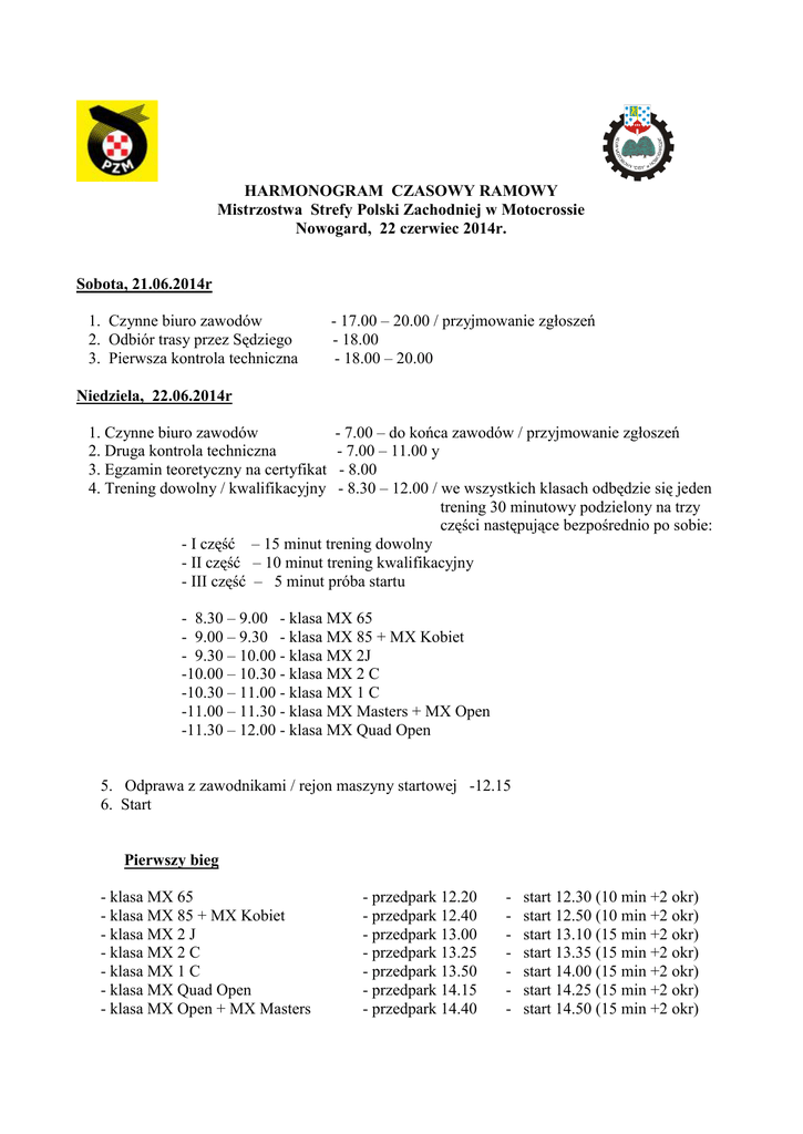 HARMONOGRAM CZASOWY RAMOWY Mistrzostwa Strefy Polski Zachodniej w Motocrossie Nowogard, 22 czerwiec 2014r. Sobota, 21.06.2014r 1. Czynne biuro zawodów 2. Odbiór trasy przez Sędziego 3. Pierwsza kontrola techniczna - 17.00 – 20.00 / przyjmowanie zgłoszeń - 18.00 - 18.00 – 20.00 Niedziela, 22.06.2014r 1. Czynne biuro zawodów 2. Druga kontrola techniczna 3. Egzamin teoretyczny na certyfikat 4. Trening dowolny / kwalifikacyjny - 7.00 – do końca zawodów / przyjmowanie zgłoszeń - 7.00 – 11.00 y - 8.00 - 8.30 – 12.00 / we wszystkich klasach odbędzie się jeden trening 30 minutowy podzielony na trzy części następujące bezpośrednio po sobie: - I część – 15 minut trening dowolny - II część – 10 minut trening kwalifikacyjny - III część – 5 minut próba startu - 8.30 – 9.00 - klasa MX 65 - 9.00 – 9.30 - klasa MX 85 + MX Kobiet - 9.30 – 10.00 - klasa MX 2J -10.00 – 10.30 - klasa MX 2 C -10.30 – 11.00 - klasa MX 1 C -11.00 – 11.30 - klasa MX Masters + MX Open -11.30 – 12.00 - klasa MX Quad Open 5. Odprawa z zawodnikami / rejon maszyny startowej -12.15 6. Start Pierwszy bieg - klasa MX 65 - klasa MX 85 + MX Kobiet - klasa MX 2 J - klasa MX 2 C - klasa MX 1 C - klasa MX Quad Open - klasa MX Open + MX Masters - przedpark 12.20 - przedpark 12.40 - przedpark 13.00 - przedpark 13.25 - przedpark 13.50 - przedpark 14.15 - przedpark 14.40 - start 12.30 (10 min +2 okr) start 12.50 (10 min +2 okr) start 13.10 (15 min +2 okr) start 13.35 (15 min +2 okr) start 14.00 (15 min +2 okr) start 14.25 (15 min +2 okr) start 14.50 (15 min +2 okr) Drugi bieg - klasa MX 65 - klasa MX 85 + MX Kobiet - klasa MX 2 J - klasa MX 2 C - klasa MX 1 C - klasa MX Quad Open - klasa MX Open + MX Masters - przedpark 15.05 - przedpark 15.25 - przedpark 15.45 - przedpark 16.10 - przedpark 16.35 - przedpark 17.00 - przedpark 17.25 - start 15.15 (10 min +2 okr) start 15.35 (10 min +2 okr) start 15.55 (15 min +2 okr) start 16.20 (15 min +2 okr) start 16.45 (15 min +2 okr) start 17.10 (15 min +2 okr) start 17.35 (15 min +2 okr) 7. Zakończenie zawodów -ok. godz 18.30 Uwaga ! Ostateczną decyzję o połączeniu klas podejmuje Dyrektor zawodów w uzgodnieniu z Sędzią Zawodów. O zmianach zawodnicy będą powiadomieni na odprawie. Nie ulegnie zmianie godzina startu do pierwszego biegu .