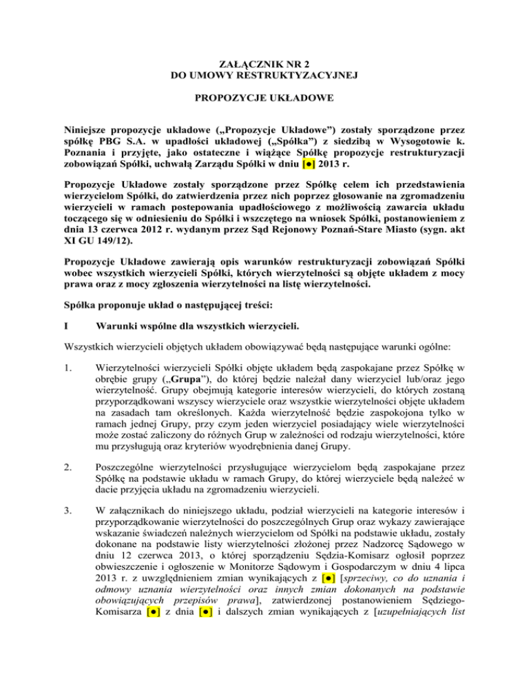 ZAŁĄCZNIK NR 2 DO UMOWY RESTRUKTYZACYJNEJ PROPOZYCJE UKŁADOWE Niniejsze propozycje układowe („Propozycje Układowe”) zostały sporządzone przez spółkę PBG S.A. w upadłości układowej („Spółka”) z siedzibą w Wysogotowie k. Poznania i przyjęte, jako ostateczne i wiążące Spółkę propozycje restrukturyzacji zobowiązań Spółki, uchwałą Zarządu Spółki w dniu [●] 2013 r. Propozycje Układowe zostały sporządzone przez Spółkę celem ich przedstawienia wierzycielom Spółki, do zatwierdzenia przez nich poprzez głosowanie na zgromadzeniu wierzycieli w ramach postepowania upadłościowego z możliwością zawarcia układu toczącego się w odniesieniu do Spółki i wszczętego na wniosek Spółki, postanowieniem z dnia 13 czerwca 2012 r. wydanym przez Sąd Rejonowy Poznań-Stare Miasto (sygn. akt XI GU 149/12). Propozycje Układowe zawierają opis warunków restrukturyzacji zobowiązań Spółki wobec wszystkich wierzycieli Spółki, których wierzytelności są objęte układem z mocy prawa oraz z mocy zgłoszenia wierzytelności na listę wierzytelności. Spółka proponuje układ o następującej treści: I Warunki wspólne dla wszystkich wierzycieli. Wszystkich wierzycieli objętych układem obowiązywać będą następujące warunki ogólne: 1. Wierzytelności wierzycieli Spółki objęte układem będą zaspokajane przez Spółkę w obrębie grupy („Grupa”), do której będzie należał dany wierzyciel lub/oraz jego wierzytelność. Grupy obejmują kategorie interesów wierzycieli, do których zostaną przyporządkowani wszyscy wierzyciele oraz wszystkie wierzytelności objęte układem na zasadach tam określonych. Każda wierzytelność będzie zaspokojona tylko w ramach jednej Grupy, przy czym jeden wierzyciel posiadający wiele wierzytelności może zostać zaliczony do różnych Grup w zależności od rodzaju wierzytelności, które mu przysługują oraz kryteriów wyodrębnienia danej Grupy. 2. Poszczególne wierzytelności przysługujące wierzycielom będą zaspokajane przez Spółkę na podstawie układu w ramach Grupy, do której wierzyciele będą należeć w dacie przyjęcia układu na zgromadzeniu wierzycieli. 3. W załącznikach do niniejszego układu, podział wierzycieli na kategorie interesów i przyporządkowanie wierzytelności do poszczególnych Grup oraz wykazy zawierające wskazanie świadczeń należnych wierzycielom od Spółki na podstawie układu, zostały dokonane na podstawie listy wierzytelności złożonej przez Nadzorcę Sądowego w dniu 12 czerwca 2013, o której sporządzeniu Sędzia-Komisarz ogłosił poprzez obwieszczenie i ogłoszenie w Monitorze Sądowym i Gospodarczym w dniu 4 lipca 2013 r. z uwzględnieniem zmian wynikających z [●] [sprzeciwy, co do uznania i odmowy uznania wierzytelności oraz innych zmian dokonanych na podstawie obowiązujących przepisów prawa], zatwierdzonej postanowieniem SędziegoKomisarza [●] z dnia [●] i dalszych zmian wynikających z [uzupełniających list wierzytelności] zatwierdzonych postanowieniami Sędziego-Komisarza [●] z dnia [●] („Lista Wierzytelności”). W przypadku rozbieżności pomiędzy informacjami znajdującymi w załącznikach do układu a listą wierzytelności obowiązującą w dacie głosowania nad układem na zgromadzeniu wierzycieli, wiąże lista wierzytelności obowiązująca w dacie głosowania nad układem na zgromadzeniu wierzycieli. 4. Układ będzie wykonywany przez Spółkę przez okres („Okres Wykonywania Układu”) rozpoczynający się od pierwszego dnia trzeciego miesiąca kalendarzowego następującego się po miesiącu, w którym dojdzie do uprawomocnienia się postanowienia Sądu Rejonowego Poznań-Stare Miasto w sprawie zatwierdzenia układu („Data Rozpoczęcia Spłat”), a kończący się w dniu przypadającym dwadzieścia cztery kwartały kalendarzowe po Dacie Rozpoczęcia Spłat („Data Zakończenia Spłat”). 5. Z zastrzeżeniem Dodatkowych Spłat (zdefiniowanych poniżej), wszystkie świadczenia pieniężne należne wierzycielom tytułem zaspokojenia wierzytelności objętych układem będą spełniane przez Spółkę w ratach („Raty Układowe”) w jednolitych terminach dla wszystkich Grup. 6. Wszystkie Raty Układowe będą płatne do 10 dnia każdego półrocza kalendarzowego rozpoczynającego się w Okresie Wykonywania Układu („Termin Płatności Rat Układowych”). 7. Akcje Spółki („Akcje”), które zgodnie z układem otrzymają wierzyciele uprawnieni do Konwersji Wierzytelności na Akcje w wyniku przyjęcia, zatwierdzenia układu i uprawomocnienia się postanowienia sądu zatwierdzającego układ, będą akcjami zwykłymi na okaziciela o wartości nominalnej 0,02 zł (dwa grosze) każda z prawem do 1 głosu na akcję, oznaczone w statucie Spółki, jako akcje serii H. Akcje będą zdematerializowane i będą podlegały dopuszczeniu i wprowadzeniu do obrotu na rynku regulowanym prowadzonym przez Giełdę Papierów Wartościowych w Warszawie S.A. Akcje będą opłacone gotówkowo tj. wierzytelnościami układowymi. Akcje wydane w ramach Konwersji Wierzytelności na Akcje (zdefiniowanej poniżej) będą uczestniczyć w dywidendzie od dnia 1 stycznia 2013 roku, tj. za rok obrotowy rozpoczynający się 1 stycznia 2013 r. Akcje pochodzące z Konwersji Wierzytelności na Akcje będą wydane przez Spółkę wierzycielom uprawnionym zgodnie z układem, na podstawie układu oraz zgodnie z postanowieniami statutu Spółki z dnia [●] z uwzględnieniem zmian Statutu wynikających z uchwał Nadzwyczajnego Walnego Zgromadzenia akcjonariuszy Spółki z dnia [●] 2013 r. o numerach od [●] do [●].1 8. Wierzyciel z Grupy 3, 5 oraz 7 będzie uprawniony do otrzymania Akcji Spółki w ramach Konwersji Wierzytelności na Akcje oraz Akcji dla Akcjonariuszy (zdefiniowanych poniżej), jeżeli jego wierzytelność będzie umieszczona na Liście Wierzytelności według stanu na dzień głosowania nad układem na zgromadzen