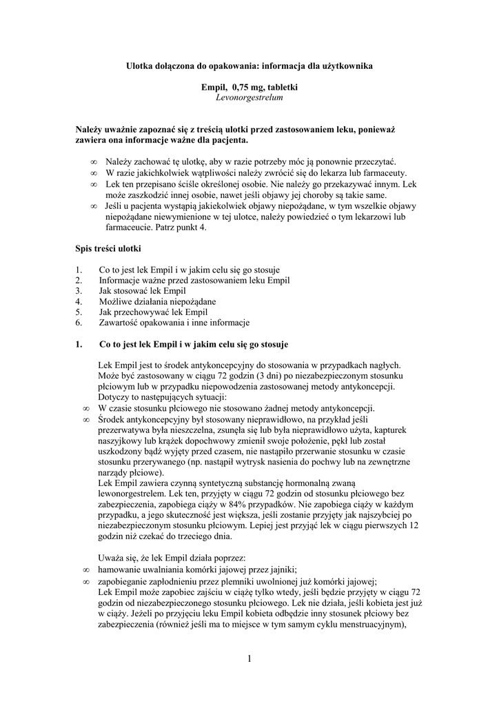 Ulotka dołączona do opakowania: informacja dla użytkownika Empil, 0,75 mg, tabletki Levonorgestrelum Należy uważnie zapoznać się z treścią ulotki przed zastosowaniem leku, ponieważ zawiera ona informacje ważne dla pacjenta. • • • • Należy zachować tę ulotkę, aby w razie potrzeby móc ją ponownie przeczytać. W razie jakichkolwiek wątpliwości należy zwrócić się do lekarza lub farmaceuty. Lek ten przepisano ściśle określonej osobie. Nie należy go przekazywać innym. Lek może zaszkodzić innej osobie, nawet jeśli objawy jej choroby są takie same. Jeśli u pacjenta wystąpią jakiekolwiek objawy niepożądane, w tym wszelkie objawy niepożądane niewymienione w tej ulotce, należy powiedzieć o tym lekarzowi lub farmaceucie. Patrz punkt 4. Spis treści ulotki 1. 2. 3. 4. 5. 6. Co to jest lek Empil i w jakim celu się go stosuje Informacje ważne przed zastosowaniem leku Empil Jak stosować lek Empil Możliwe działania niepożądane Jak przechowywać lek Empil Zawartość opakowania i inne informacje 1. Co to jest lek Empil i w jakim celu się go stosuje • • • • Lek Empil jest to środek antykoncepcyjny do stosowania w przypadkach nagłych. Może być zastosowany w ciągu 72 godzin (3 dni) po niezabezpieczonym stosunku płciowym lub w przypadku niepowodzenia zastosowanej metody antykoncepcji. Dotyczy to następujących sytuacji: W czasie stosunku płciowego nie stosowano żadnej metody antykoncepcji. Środek antykoncepcyjny był stosowany nieprawidłowo, na przykład jeśli prezerwatywa była nieszczelna, zsunęła się lub była nieprawidłowo użyta, kapturek naszyjkowy lub krążek dopochwowy zmienił swoje położenie, pękł lub został uszkodzony bądź wyjęty przed czasem, nie nastąpiło przerwanie stosunku w czasie stosunku przerywanego (np. nastąpił wytrysk nasienia do pochwy lub na zewnętrzne narządy płciowe). Lek Empil zawiera czynną syntetyczną substancję hormonalną zwaną lewonorgestrelem. Lek ten, przyjęty w ciągu 72 godzin od stosunku płciowego bez zabezpieczenia, zapobiega ciąży w 84% przypadków. Nie zapobiega ciąży w każdym przypadku, a jego skuteczność jest większa, jeśli zostanie przyjęty jak najszybciej po niezabezpieczonym stosunku płciowym. Lepiej jest przyjąć lek w ciągu pierwszych 12 godzin niż czekać do trzeciego dnia. Uważa się, że lek Empil działa poprzez: hamowanie uwalniania komórki jajowej przez jajniki; zapobieganie zapłodnieniu przez plemniki uwolnionej już komórki jajowej; Lek Empil może zapobiec zajściu w ciążę tylko wtedy, jeśli będzie przyjęty w ciągu 72 godzin od niezabezpieczonego stosunku płciowego. Lek nie działa, jeśli kobieta jest już w ciąży. Jeżeli po przyjęciu leku Empil kobieta odbędzie inny stosunek płciowy bez zabezpieczenia (również jeśli ma to miejsce w tym samym cyklu menstruacyjnym), 1 tabletka nie zapewni działania antykoncepcyjnego i ponownie będzie istniało ryzyko ciąży. 2. Informacje ważne przed zastosowaniem leku Empil Kiedy nie stosować leku Empil - Jeśli pacjentka ma uczulenie na lewonorgestrel lub którykolwiek z pozostałych składników tego leku (wymienionych w punkcie 6) Ostrzeżenia i środki ostrożności Jeżeli którykolwiek z poniższych punktów dotyczy pacjentki, należy poinformować o tym lekarza przed zastosowaniem leku Empil, ponieważ antykoncepcja awaryjna może nie być dla pacjentki odpowiednia. Lekarz może przepisać pacjentce inny rodzaj antykoncepcji awaryjnej. − − − − − − − Jeśli pacjentka jest w ciąży lub podejrzewa, że może być w ciąży. Lek ten nie będzie skuteczny jeśli pacjentka jest już w ciąży. Jeśli pacjentka jest już w ciąży, lek Empil nie może zakończyć ciąży, ponieważ nie jest to „tabletka poronna”. Pacjentka może być już w ciąży, jeśli: Krwawienie miesiączkowe opóźnia się o więcej niż 5 dni lub występuje nietypowe krwawienie w dniu następnej miesiączki; Minęło więcej niż 72 godziny od stosunku płciowego bez zabezpieczenia w tym samym cyklu miesiączkowym. Stosowanie leku Empil nie jest zalecane, jeśli: Występuje choroba jelita cienkiego (np. choroba Leśniowskiego-Crohna), która hamuje wchłanianie leku; występują ciężkie zaburzenia czynności wątroby; w przeszłości występowała ciąża pozamaciczna (w przebiegu której dziecko rozwija się gdzieś poza macicą) w przeszłości występowało zapalenie jajowodów. Wcześniejsza ciąża pozamaciczna i wcześniejsze zakażenie jajowodów zwiększają ryzyko kolejnej ciąży pozamacicznej. U wszystkich kobiet antykoncepcja awaryjna powinna być zastosowana jak najszybciej po niezabezpieczonym stosunku, niezależnie od masy ciała lub BMI. Istnieją dowody, że lek Empil może być mniej skuteczny wraz ze wzrostem masy ciała lub wskaźnika masy ciała (BMI) pacjentki, dane te są jednak ograniczone i niejednoznaczne. Z tego względu lek Empil nadal jest zalecany dla wszystkich kobiet, niezależnie od masy ciała lub BMI. Jeśli kobieta ma jakiekolwiek obawy związane z przyjmowaniem antykoncepcji awaryjnej, doradza się aby porozmawiała z pracownikiem służby zdrowia. Dzieci i młodzież Nie zaleca się stosowania produktu leczniczego Empil u dzieci. Dane dotyczące stosowania u kobiet w wieku poniżej 16 lat są ograniczone. Jeśli pacjentka obawia się chorób przenoszonych drogą płciową 2 Jeśli w czasie stosunku płciowego nie zastosowano prezerwatywy (lub jeśli prezerwatywa została przerwana lub zsunęła się), istnieje ryzyko, że pacjentka mogła zarazić się chorobą przenoszoną drogą płciową lub wirusem HIV. Lek ten nie chroni przed chorobami przenoszonymi drogą płciową. Taką ochronę może zapewnić jedynie prezerwatywa. W razie obaw dotyczących tej kwestii należy poradzić się lekarza, farmaceuty, pielęgniarki lub specjalisty do spraw planowania rodziny . Lek Empil a inne leki Należy powiedzieć lekarzowi lub farmaceucie o wszystkich lek