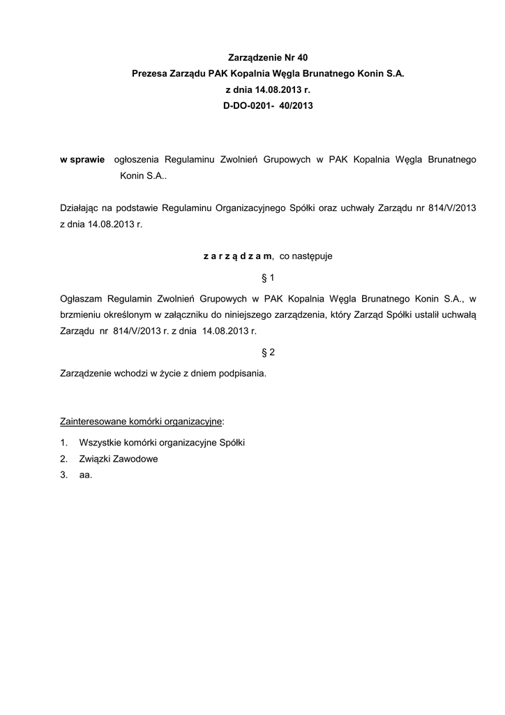 Zarządzenie Nr 40 Prezesa Zarządu PAK Kopalnia Węgla Brunatnego Konin S.A. z dnia 14.08.2013 r. D-DO-0201- 40/2013 w sprawie ogłoszenia Regulaminu Zwolnień Grupowych w PAK Kopalnia Węgla Brunatnego Konin S.A.. Działając na podstawie Regulaminu Organizacyjnego Spółki oraz uchwały Zarządu nr 814/V/2013 z dnia 14.08.2013 r. z a r z ą d z a m, co następuje §1 Ogłaszam Regulamin Zwolnień Grupowych w PAK Kopalnia Węgla Brunatnego Konin S.A., w brzmieniu określonym w załączniku do niniejszego zarządzenia, który Zarząd Spółki ustalił uchwałą Zarządu nr 814/V/2013 r. z dnia 14.08.2013 r. §2 Zarządzenie wchodzi w życie z dniem podpisania. Zainteresowane komórki organizacyjne: 1. Wszystkie komórki organizacyjne Spółki 2. Związki Zawodowe 3. aa. Załącznik do Zarządzenia Nr 40 Prezesa Zarządu PAK Kopalnia Węgla Brunatnego Konin S.A. z dnia 14.08. 2013r. REGULAMIN ZWOLNIEŃ GRUPOWYCH w PAK KOPALNIA WĘGLA BRUNATNEGO KONIN S.A. ustalony w dniu 14 sierpnia 2013 roku §1 Podstawą prawną regulaminu zwolnień grupowych jest art. 3 ust. 4 ustawy z dnia 13 marca 2003 r. o szczególnych zasadach rozwiązywania z pracownikami stosunków pracy z przyczyn niedotyczących pracowników (Dz. U. z 2003 r. Nr 90, poz. 844 z późn. zm.). Regulamin został sporządzony wobec braku możliwości zawarcia porozumienia między PAK Kopalnia Węgla Brunatnego Konin S.A. a zakładowymi organizacjami związkowymi w trybie art. 3 ust. 1 i 3 ww. ustawy. Regulamin określa zasady postępowania w sprawach dotyczących pracowników objętych zamiarem grupowego zwolnienia. §2 1. W PAK Kopalnia Węgla Brunatnego Konin S.A. zatrudnionych jest ogółem 3166 pracowników należących do następujących grup zawodowych: 1) Pracownicy administracji (grupa zawodowa) 2) Pracownicy służb technicznych, obsługi i remontów (grupa zawodowa) 3) 299 (liczba pracowników w tej grupie zawodowej Pracownicy transportu samochodowego (grupa zawodowa) 6) (liczba pracowników w tej grupie zawodowej Pracownicy transportu kolejowego (grupa zawodowa) 5) 1277 (liczba pracowników w tej grupie zawodowej Pracownicy służb maszyn podstawowych, sprzętu technologicznego i urządzeń na odkrywce 1130 (grupa zawodowa) 4) 224 (liczba pracowników w tej grupie zawodowej 125 (liczba pracowników w tej grupie zawodowej Pracownicy służb rozwoju, inwestycji, gospodarki nieruchomościami i służb wiertniczo – inżynieryjnych (grupa zawodowa) 111 (liczba pracowników w tej grupie zawodowej 2. Zwolnienia grupowe pracowników odbędą się w następujących grupach zawodowych: 1) Pracownicy administracji - 13 (grupa zawodowa objęta zamiarem zwolnienia) (liczba pracowników objętych zamiarem zwolnienia w tej grupie zawodowej) 2) Pracownicy służb technicznych, obsługi i remontów - 202 (grupa zawodowa objęta zamiarem zwolnienia) (liczba pracowników objętych zamiarem zwolnienia w tej grupie zawodowej) 3) Pracownicy służb maszyn podstawowych, sprzętu technologicznego i urządzeń na odkrywce 0 (grupa zawodowa objęta zamiarem zwolnienia) (liczba pracowników objętych zamiarem zwolnienia w tej grupie zawodowej) 4) Pracownicy transportu kolejowego - 35 (grupa zawodowa objęta zamiarem zwolnienia) (liczba pracowników objętych zamiarem zwolnienia w tej grupie zawodowej) 5) Pracownicy transportu samochodowego - 13 (grupa zawodowa objęta zamiarem zwolnienia) (liczba pracowników objętych zamiarem zwolnienia w tej grupie zawodowej) 6) Pracownicy służb rozwoju, inwestycji, gospodarki nieruchomościami i służb wiertniczo – inżynieryjnych - 11 (grupa zawodowa objęta zamiarem zwolnienia) (liczba pracowników objętych zamiarem zwolnienia w tej grupie zawodowej) 3. Zwolnienia grupowe nie dotyczą: • • Pracowników, którzy na podstawie przepisów ustawy z dnia 13 marca 2003 roku, o szczególnych zasadach rozwiązywania z pracownikami stosunków pracy z przyczyn niedotyczących pracowników oraz przepisów szczególnych podlegają ochronie w przypadku zwolnień grupowych, Pracowników zatrudnionych na stanowiskach bezpośrednio produkcyjnych przy wydobyciu węgla, w tym pracowników dozoru tej grupy i podlegających ochronie na podstawie gwarancji zatrudnienia wynikających z umowy MSP/SPA/00194/00/2012 oraz MSP/SPA/00195/00/2012 Sprzedaży Akcji z dnia 28 maja 2012 roku. §3 1. Zwolnienia grupowe nastąpią w terminie od 10 września 2013 roku do 30 kwietnia 2014 roku. 2. Pracodawca może, w celu wcześniejszego rozwiązania umowy o pracę, skrócić okres wypowiedzenia, w trybie przewidzianym w art. 361 kodeksu pracy, najwyżej do jednego miesiąca. W takim przypadku pracownikowi za pozostałą część okresu wypowiedzenia przysługuje odszkodowanie w wysokości wynagrodzenia liczonego jak ekwiwalent za urlop wypoczynkowy. W przypadku pisemnego wystąpienia pracownika w tej sprawie pracodawca wyrazi zgodę. §4 1. Pracownicy objęci zwolnieniem grupowym będą dobierani przez przełożonych według następujących kryteriów: • • • przydatność zawodowa pracownika do pracy na zajmowanym stanowisku; umiejętności, doświadczenie zawodowe, kwalifikacje; dyspozycyjność pracownika; 2. Kierując się dobrem Spółki i zapewnieniem normalnej działalności PAK Kopalni Węgla Brunatnego Konin S.A. przyjmuje się, że pracodawca w pierwszej kolejności zaproponuje wszystkim przeznaczonym do zwolnień pracownikom zawarcie porozumień o rozwiązaniu umów o pracę. Następnie z pracownikami, którzy przyjmą propozycję, zostaną podpisane porozumienia o rozwiązaniu umowy o pracę. Pracownikom, którzy nie przyjmą propozycji rozwiązania umów o pracę za porozumieniem stron, składane będą wypowiedzenia umów o pracę. 3. Pracodawca oświadcza że przy doborze pracowników w ramach zwolnienia grupowego będzie uwzględniał fakt zatrudnienia w Spółce współmałżonków. O ile w wyniku doboru pracowników do zwolnienia grupowego, w oparciu o ustalone kryteria, okaże się, że do zwolnienia grupowe
