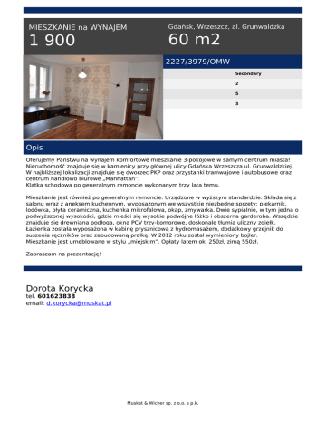 MIESZKANIE na WYNAJEM 1 900 Gdańsk, Wrzeszcz, al. Grunwaldzka 60 m2 2227/3979/OMW Secondary 2 5 3 Opis Oferujemy Państwu na wynajem komfortowe mieszkanie 3-pokojowe w samym centrum miasta! Nieruchomość znajduje się w kamienicy przy głównej ulicy Gdańska Wrzeszcza ul. Grunwaldzkiej. W najbliższej lokalizacji znajduje się dworzec PKP oraz przystanki tramwajowe i autobusowe oraz centrum handlowo biurowe „Manhattan”. Klatka schodowa po generalnym remoncie wykonanym trzy lata temu. Mieszkanie jest również po generalnym remoncie. Urządzone w wyższym standardzie. Składa się z salonu wraz z aneksem kuchennym, wyposażonym we wszystkie niezbędne sprzęty: piekarnik, lodówka, płyta ceramiczna, kuchenka mikrofalowa, okap, zmywarka. Dwie sypialnie, w tym jedna o podwyższonej wysokości, gdzie mieści się wysokie podwójne łóżko i obszerna garderoba. Wszędzie znajduje się drewniana podłoga, okna PCV trzy-komorowe, doskonale tłumią uliczny zgiełk. Łazienka została wyposażona w kabinę prysznicową z hydromasażem, dodatkowy grzejnik do suszenia ręczników oraz zabudowaną pralkę. W 2012 roku został wymieniony bojler. Mieszkanie jest umeblowane w stylu „miejskim”. Opłaty latem ok. 250zł, zimą 550zł. Zapraszam na prezentację! Dorota Korycka tel. 601623838 email: [email protected] Muskat & Wicher sp. z o.o. s p.k. Powered by TCPDF (www.tcpdf.org)