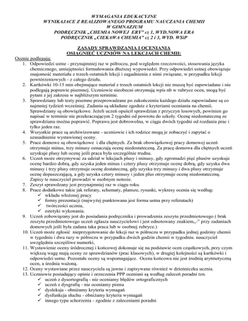 WYMAGANIA EDUKACYJNE WYNIKAJACE Z REALIZOWANEGO PROGRAMU NAUCZANIA CHEMII W GIMNAZJUM PODRĘCZNIK „CHEMIA NOWEJ ERY” cz 1, WYD.NOWA ERA PODRĘCZNIK „CIEKAWA CHEMIA” cz 2 i 3, WYD. WSiP ZASADY SPRAWDZANIA I OCENIANIA OSIĄGNIĘĆ UCZNIÓW NA LEKCJACH CHEMII: Ocenie podlegają: 1. Odpowiedzi ustne - przynajmniej raz w półroczu, pod względem rzeczowości, stosowania języka chemicznego, umiejętności formułowania dłuższej wypowiedzi. Przy odpowiedzi ustnej obowiązuje znajomość materiału z trzech ostatnich lekcji i zagadnienia z nimi związane, w przypadku lekcji powtórzeniowych - z całego działu. 2. Kartkówki 10-15 min obejmujące materiał z trzech ostatnich lekcji nie muszą być zapowiadane i nie podlegają poprawie pisemnej. Uczniowie nieobecni otrzymują wpis nb w rubryce ocen, mogą być pytani z jej zakresu w najbliższym terminie. 3. Sprawdziany lub testy pisemne przeprowadzane po zakończeniu każdego działu zapowiadane są co najmniej tydzień wcześniej. Zadania są układane zgodnie z kryteriami oceniania na chemii. Sprawdziany są obowiązkowe. Jeżeli uczeń opuścił sprawdzian z przyczyn losowych, powinien go napisać w terminie nie przekraczającym 2 tygodni od powrotu do szkoły. Ocenę niedostateczną ze sprawdzianu można poprawić. Poprawa jest dobrowolna, w ciągu dwóch tygodni od rozdania prac i tylko jeden raz. 4. Wszystkie prace są archiwizowane - uczniowie i ich rodzice mogą je zobaczyć i zapytać o uzasadnienie wystawionej oceny. 5. Prace domowe są obowiązkowe i dla chętnych. Za brak obowiązkowej pracy domowej uczeń otrzymuje minus, trzy minusy oznaczają ocenę niedostateczną. Za pracę domowa dla chętnych uczeń uzyskuje plusy lub ocenę jeśli praca była szczególnie trudna. 6. Uczeń może otrzymywać za udział w lekcjach plusy i minusy, gdy zgromadzi pięć plusów uzyskuje ocenę bardzo dobrą, gdy uzyska jeden minus i cztery plusy otrzymuje ocenę dobrą, gdy uzyska dwa minusy i trzy plusy otrzymuje ocenę dostateczną, gdy uzyska trzy minusy i dwa plusy otrzymuje ocenę dopuszczającą, a gdy uzyska cztery minusy i jeden plus otrzymuje ocenę niedostateczną. Zapisy te nauczyciel prowadzi w osobnym notesie. 7. Zeszyt sprawdzany jest przynajmniej raz w ciągu roku. 8. Prace dodatkowe takie jak referaty, schematy, plansze, rysunki, wykresy ocenia się według: wkładu włożonej pracy formy prezentacji (najwyżej punktowana jest forma ustna przy referatach) twórczości ucznia, estetyki wykonania. 9. Uczeń zobowiązany jest do posiadania podręcznika i prowadzenia zeszytu przedmiotowego ( brak zeszytu przedmiotowego uczeń zgłasza nauczycielowi i jest odnotowany znakiem„-” przy zadaniach domowych jeśli była zadana taka praca lub w osobnej rubryce.) 10. Uczeń może zgłosić nieprzygotowanie do lekcji raz w półroczu w przypadku jednej godziny chemii w tygodniu i dwa razy w półroczu w przypadku dwóch godzin chemii w tygodniu. nauczyciel uwzględnia szczęśliwe numerki, 11. Wystawienie oceny śródrocznej i końcowej dokonuje się na podstawie ocen cząstkowych, przy czym większą wagę mają oceny ze sprawdzianów (prac klasowych), w drugiej kolejności są kartkówki i odpowiedzi ustne. Pozostałe oceny są wspomagające. Ocena końcowa nie jest średnią arytmetyczną ocen, a średnia ważoną. 12. Oceny wystawiane przez nauczyciela są jawne i zapisywane również w dzienniczku ucznia. 13. Uczniowie posiadający opinie i orzeczenia PPP oceniani są według zaleceń poradni tzn. uczeń z dysortografią - nie oceniamy błędów ortograficznych uczeń z dysgrafią - nie oceniamy pisma dysleksja - obniżamy kryteria wymagań dysfunkcja słuchu - obniżamy kryteria wymagań innego typu schorzenia - zgodnie z zaleceniami poradni 14. Nauczyciel stara się stworzyć właściwe warunki pracy na lekcji dla każdego ucznia stosownie do ich możliwości. Ocena dopuszczająca = wymagania konieczne Ocena dostateczna = wymagania konieczne + podstawowe Ocena dobra = wymagania konieczne + podstawowe +rozszerzające Ocena bardzo dobra = wymagania konieczne + podstawowe + rozszerzające +dopełniające KLASA PIERWSZA PODRĘCZNIK „CHEMIA NOWEJ ERY” cz 1, WYD.NOWA ERA Dział 1 Substancje i ich przemiany Ocena dopuszczająca: Uczeń: zalicza chemię do nauk przyrodniczych stosuje zasady bezpieczeństwa obowiązujące w pracowni chemicznej nazywa wybrane elementy szkła i sprzętu laboratoryjnego oraz określa ich przeznaczenie opisuje właściwości substancji, będących głównymi składnikami produktów, stosowanych na co dzień przeprowadza proste obliczenia z wykorzystaniem pojęć: masa, gęstość, objętość odróżnia właściwości fizyczne od chemicznych dzieli substancje chemiczne na proste i złożone, na pierwiastki i związki chemiczne definiuje pojęcie mieszanina substancji opisuje cechy mieszanin jednorodnych i niejednorodnych podaje przykłady mieszanin opisuje proste metody rozdzielania mieszanin na składniki definiuje pojęcia zjawisko fizyczne i reakcja chemiczna podaje przykłady zjawisk fizycznych i reakcji chemicznych zachodzących w otoczeniu człowieka definiuje pojęcia pierwiastek chemiczny i związek chemiczny podaje przykłady związków chemicznych klasyfikuje pierwiastki chemiczne na metale i niemetale podaje przykłady pierwiastków chemicznych (metali i niemetali) odróżnia metale i niemetale na podstawie ich właściwości opisuje, na czym polega rdzewienie (korozja) posługuje się symbolami chemicznymi pierwiastków (H, O, N, Cl, S, C, P, Si, Na, K, Ca, Mg, Fe, Zn, Cu, Al, Pb, Sn, Ag, Hg) opisuje skład i właściwości powietrza określa, co to są stałe i zmienne składniki powietrza opisuje właściwości fizyczne, chemiczne tlenu, tlenku węgla(IV), wodoru, azotu podaje, że woda jest związkiem chemicznym wodoru i tlenu tłumaczy, na czym polega zmiana stanów skupienia na przykładzie wody omawia obieg wody w przyrodzie określa znaczenie powietrza, wody, tlenu określa, jak 