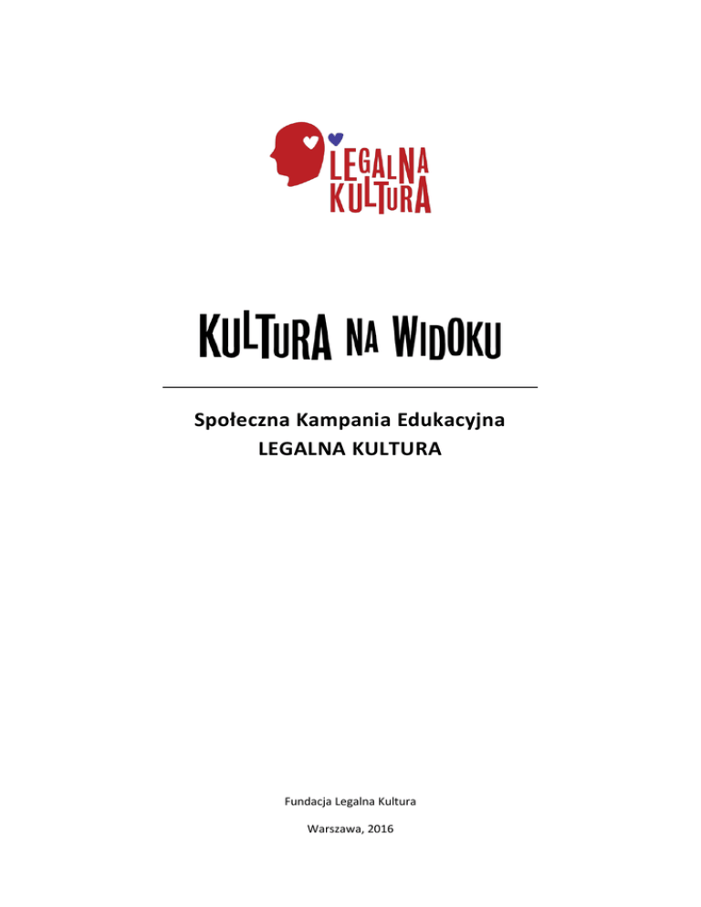 Społeczna Kampania Edukacyjna LEGALNA KULTURA Fundacja Legalna Kultura Warszawa, 2016 Współorganizacja i współfinansowanie projektu Partnerzy strategiczni Partnerzy Spis treści O projekcie Kultura Na Widoku ….……………………………………………………………………………………………………….4 Partnerzy trzeciej edycji Kultury Na Widoku………………………………………………………………………………………..7 O Legalnej Kulturze .……………………………………………………………………………………………………………………….…10 Legalna Kultura w liczbach ..………………………………………………………………………………………………………………11 Raport MUSO. Europa liderem internetowego piractwa…………………………………………………………………….12 Prawnik odpowiada ..………………………………………………………………………………………………………………………..14 Kontakt dla mediów Natalia Duma, tel. 506 539 527, [email protected] Warszawa 2016 3 KULTURA NA WIDOKU 2016 Gdziekolwiek jesteś. Kiedykolwiek chcesz. Kultura jest z Tobą Trzecia edycja. We wrześniu. W całej Polsce Już 2 września po raz kolejny oddamy w Wasze ręce Kulturę Na Widoku. Często, jako Fundacja prowadząca działania edukacyjne w zakresie legalnych źródeł kultury, słyszymy: Oglądałbym filmy z legalnych źródeł, gdyby były dostępne i gdybym wiedział, gdzie ich szukać... Ten argument stracił ważność. Od trzech lat Kultura jest Na Widoku. W tym roku jest jej jeszcze więcej i jest jeszcze łatwiej dostępna. Kultura Na Widoku to multimedialny projekt Fundacji Legalna Kultura. Skierowany jest do wszystkich, dla których kultura jest ważna, i do tych, którzy dopiero będą ją odkrywać. Kultura Na Widoku to portal, który daje możliwość pobierania na smartfony i inne urządzenia mobilne utworów z różnych dziedzin sztuki i rozrywki. Kultura Na Widoku to zasoby z legalnych źródeł – muzyka, filmy, książki, gry itp., po które możesz sięgnąć w każdej chwili. Nie wchodząc do kina czy księgarni. W parku na ławce. W domu na fotelu. W kawiarni przy filiżance espresso. W samochodzie. W ogrodzie. Na plaży. Kultura Na Widoku to instalacje – uliczne wirtualne biblioteki ustawione w centralnych punktach miast oraz w miejscach wydarzeń kulturalnych. W tym roku pojawią się także citylighty na przystankach aglomeracji miejskich w całej Polsce. Do dyspozycji użytkowników będą tysiące plakatów w szkołach, bibliotekach i urzędach w niewielkich miejscowościach na terenie całej Polski, które często mają ograniczony dostęp do kultury. Z instalacji, citylightów, plakatów i strony internetowej można pobrać 1100 utworów - filmów, utworów muzycznych, książek i gier z legalnych źródeł. W tym roku nowością są wirtualne spacery po muzeach świata. Projekt wpisuje się również w promocję czytelnictwa, podkreślając wagę literatury w naszym życiu kulturalnym. W spotach promujących tegoroczną edycję Kultury Na Widoku wzięły udział wybitne osobowości artystyczne, Ambasadorzy i Przyjaciele Legalnej Kultury – Zbigniew Wodecki, Danuta Stenka, Joanna Jabłczyńska oraz Arek Jakubik. Głosu psu Mecenasowi użyczył Jarosław Boberek. użyczył Jarosław Boberek. Dziękujemy serdecznie wszystkim twórcom zaangażowanym w tegoroczną kampanię Kultury Na Widoku. Sercem projektu jest strona internetowa. Niezależnie od preferencji i miejsca zamieszkania – ponad wszelkimi barierami – miliony odbiorców mogą korzystać z bogatej oferty kulturalnej, ponieważ wszystkie utwory są dostępne również na www.kulturanawidoku.pl Warszawa 2016 4 Twórcą grafiki na plakaty, citylighty i instalacje tegorocznej edycji Kultury Na Widoku jest Prof. Piotr Welk, prowadzący Pracownię Multimediów w Akademii Sztuki Pięknych w Warszawie. Dlaczego warto uczestniczyć w projekcie? Kultura Na Widoku to powszechny dostęp do 1100 utworów z 30 legalnych źródeł, które biorą aktywny udział w projekcie. Można je pobierać łatwo, wygodnie i szybko – wystarczy smartfon czy notebook i kultura jest na wyciągnięcie ręki. To oferta dla każdego, różnorodna i bezpłatna lub po preferencyjnych cenach – cena najdroższych utworów nie przekracza 10 zł (oprócz gier). Wbrew panującym powszechnie opiniom kultura w sieci nie musi być droga. GDZIE KULTURA JEST NA WIDOKU? Citylighty na 600 przystankach aglomeracji miejskich w całej Polsce (Warszawa, Kraków, Łódź, Poznań, Szczecin, Wrocław, Trójmiasto, Górnośląski Okręg Przemysłowy) Citylighty na wyższych uczelniach (od października) 20.000 plakatów w urzędach, szkołach i bibliotekach w niewielkich miejscowościach Instalacje w przestrzeni publicznej w Warszawie, Krakowie, Gdańsku, Wrocławiu oraz na Festiwalu Filmowym w Gdyni KIEDY KULTURA JEST NA WIDOKU? Startujemy już 2 września 2016! Codziennie przez pięć tygodni – aż do 8 października 2016. Kultura w zasięgu ręki, wszystko do Twojej dyspozycji. IDEA PROJEKTU Kultura Na Widoku ma na celu promowanie świadomego uczestnictwa w kulturze i wyrabianie nawyku korzystania z jej legalnych źródeł. Jest skierowana do wszystkich – nigdy nie jest za wcześnie i nigdy nie jest za późno, żeby spotkać się z kulturą. Bardzo podoba mi się to, że kultura z legalnych źródeł wyszła odbiorcy na spotkanie. Stanęła na trotuarze i czeka na niego. To jest fantastyczna idea! – mówi Danuta Stenka. Fundacja Legalna Kultura za pomocą tego projektu pokazuje w praktyce, że kultura pochodząca z legalnych źródeł jest dostępna, jest na widoku i na wyciągnięcie ręki. Kultura Na Widoku jest dla wszystkich. Dla każdego. Dla Ciebie. Również dla tych, którzy na co dzień mają utrudniony dostęp do kultury. Warszawa 2016 5 UTWORY