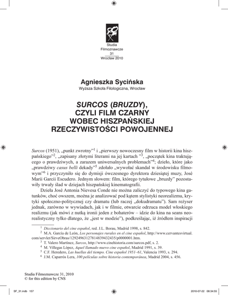 Studia Filmoznawcze 31 Wroc³aw 2010 Agnieszka Syciñska Wy¿sza Szko³a Filologiczna, Wroc³aw SURCOS (BRUZDY), CZYLI FILM CZARNY WOBEC HISZPAÑSKIEJ RZECZYWISTOŒCI POWOJENNEJ Surcos (1951), „punkt zwrotny”1 i „pierwszy nowoczesny film w historii kina hiszpańskiego”2, „zapisany złotymi literami na jej kartach ”3, „początek kina traktującego o prawdziwych, a zarazem uniwersalnych problemach”4; dzieło, które jako „prawdziwy casus belli dekady”5 zdołało „wywołać skandal w środowisku filmowym”6 i przyczyniło się do dymisji ówczesnego dyrektora dziesiątej muzy, José Marii Garcii Escudero. Jednym słowem: film, którego tytułowe „bruzdy” pozostawiły trwały ślad w dziejach hiszpańskiej kinematografii. Dzieła José Antonia Nievesa Conde nie można zaliczyć do typowego kina gatunków, choć owszem, można je analizować pod kątem stylistyki neorealizmu, krytyki społeczno-politycznej czy dramatu (lub raczej „dokudramatu”). Sam reżyser jednak, zarówno w wywiadach, jak i w filmie, otwarcie odrzuca model włoskiego realizmu (jak mówi z nutką ironii jeden z bohaterów – idzie do kina na seans neorealistyczny tylko dlatego, że „jest w modzie”), podkreślając, iż źródłem inspiracji 1 Diccionario del cine español, red. J.L. Borau, Madrid 1998, s. 842. M.A. García de León, Los personajes rurales en el cine español, http://www.cervantesvirtual. com/servlet/SirveObras/12924963127814839432435/p0000001.htm. 3 T. Valero Martínez, Surcos, http://www.cinehistoria.com/surcos.pdf, s. 2. 4 M. Villegas López, Aquel llamado nuevo cine español, Madrid 1991, s. 39. 5 C.F. Heredero, Las huellas del tiempo. Cine español 1951–61, Valencia 1993, s. 294. 6 J.M. Caparrós Lera, 100 películas sobre historia contemporánea, Madrid 2004, s. 456. 2 Studia Filmoznawcze 31, 2010 © for this edition by CNS SF_31.indb 157 2010-07-22 08:34:55 158 | Agnieszka Syciñska było dla niego przede wszystkim powojenne czarne kino amerykańskie (Pocałunek śmierci Henry’ego Hathawaya czy Złodziejski trakt Jules’a Dassina) oraz La aldea maldita (Przeklęta wioska) Floriana Reya, film pełen wyraźnych wpływów niemieckiego ekspresjonizmu. Nietrudno zatem się domyślić, że wspomniane wzorce nadały Surcos styl kina czarnego zrywającego z dotychczasowym, frankistowskim, „kinem oficjalnym”. Zobaczmy więc, w jaki sposób Nieves Conde wykorzystuje estetykę filmu noir oraz jak wpisuje ją w hiszpańskie realia dyktatury faszystowskiej, wciąż jeszcze zamkniętej w polityczno-kulturowej izolacji. „KINO HISZPAÑSKIE BEZ HISZPANII” 7 Aby w pełni zrozumieć rolę, jaką odegrały Bruzdy w kinematografii Półwyspu, należy nakreślić panoramę ówczesnego kina. W Hiszpanii lata czterdzieste XX wieku to okres rozpoczynający cztery dekady dyktatury narodowo-katolickiej. Dla kina oznaczało to całkowite podporządkowanie się wymogom reżimu, co było równoznaczne z zamknięciem się na przychodzące z zewnątrz nowe tendencje, czy to technologiczne, czy tematyczne. W rezultacie możemy rozróżnić dwie, jak pisze José Enrique Monterde8, dość sprzeczne formy kontroli dziesiątej muzy, jaką obrała frankistowska władza, a mianowicie represję i protekcję. Z kolei José Antonio Pérez Bowie9 w ramach instrumentalizacji kina rozróżnia dwa rodzaje interwencjonizmu: pasywny (propaganda pośrednia) i aktywny (propaganda bezpośrednia). Mechanizm represji, to przede wszystkim Urząd Cenzury, który – jak to trafnie nazwał Juan Antonio Bardem, jeden z czołowych reżyserów lat pięćdziesiątych – przypominał „ciemny labirynt, odpowiedzialny za infantylizm kina hiszpańskiego”10. Ów labirynt, pozbawiony jakichkolwiek wytycznych, nieraz okazywał się zgubą producentów i reżyserów, których dzieło mogło być odrzucone nawet po jego zakończeniu. Jednak ideologiczne podporządkowanie dziesiątej muzy nie ograniczało się jedynie do jej cenzurowania, lecz obejmowało również propagowanie skrzywionej wizji rzeczywistości, zgodnej z myślą reżimu (chociażby za pomocą kroniki filmowej czy wspomnianej propagandy) oraz wprowadzenie obowiązkowego dubbingu filmów zagranicznych, dzięki czemu kontrolowano produkcje zagraniczne. 7 8 1996. M. Villegas López, op. cit., s. 21. Zob. Historia general del cine. Europa y Asia (1945–1959), red. J.E. Monterde, t. IX, Madrid 9 Zob. J.A. Pérez Bowie, Cine, literatura y poder. La adaptación cinematográfica durante el primer franquismo (1939–1950), Salamanca 2004. 10 Cyt. za: J.F. Cerón Gómez, El cine de Juan Antonio Bardem, Murcia 1998, s. 68. Studia Filmoznawcze 31, 2010 © for this edition by CNS SF_31.indb 158 2010-07-22 08:34:55 Surcos (Bruzdy), czyli film czarny wobec hiszpañskiej rzeczywistoœci powojennej | 159 Protekcjonizm kina obejmował z kolei system nagród, z których najważniejsza była kategoria „interesu narodowego” (de interés nacional) – dzięki niej niemal połowa budżetu filmu była finansowana przez państwo. Nic więc dziwnego, że w repertuarach przeważały produkcje zgodne z ideologią reżimu, a mianowicie filmy historyczne, przedstawiające hiszpańską świetność doby Królów Katolickich (nazywane później pejoratywnie de cartón piedra, a więc sztuczne, z kartonu imitującego kamień), filmy o tematyce religijnej, adaptacje literatury hiszpańskiej oraz tak zwane españolady, czyli kino folklorystyczne. Jak łatwo zauważyć, wszystkie tego typu produkcje miały za zadanie fałszowanie rzeczywistości na rzecz eskapizmu i gloryfikacji hiszpańskiej rasy. W takim właśnie kontekście, w którym, jak pisał jeden z ówczesnych filmoznawców, należało tworzyć „kino rycerskie i szlachetne, będące antytezą filmów zagranicznych, w których bohaterami są złodziej, gangster i psychopata, etycznie anarchiczni i odrażający”11, powstało dzieło Nievesa Conde, „czarny koń” kinematografii lat pięćdziesiątych (dosłownie rzec